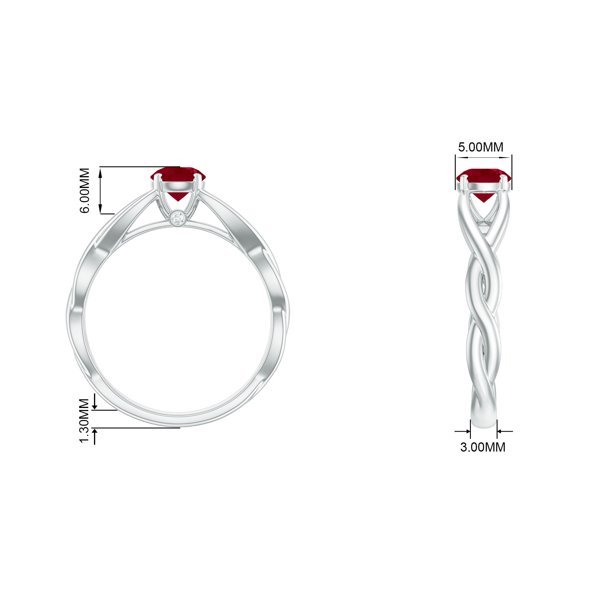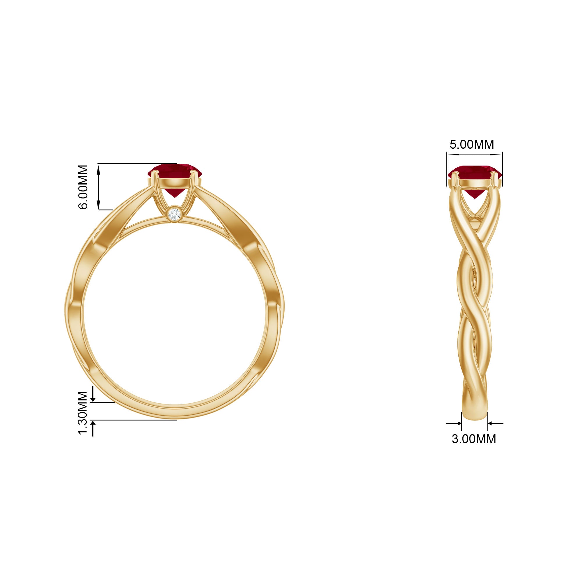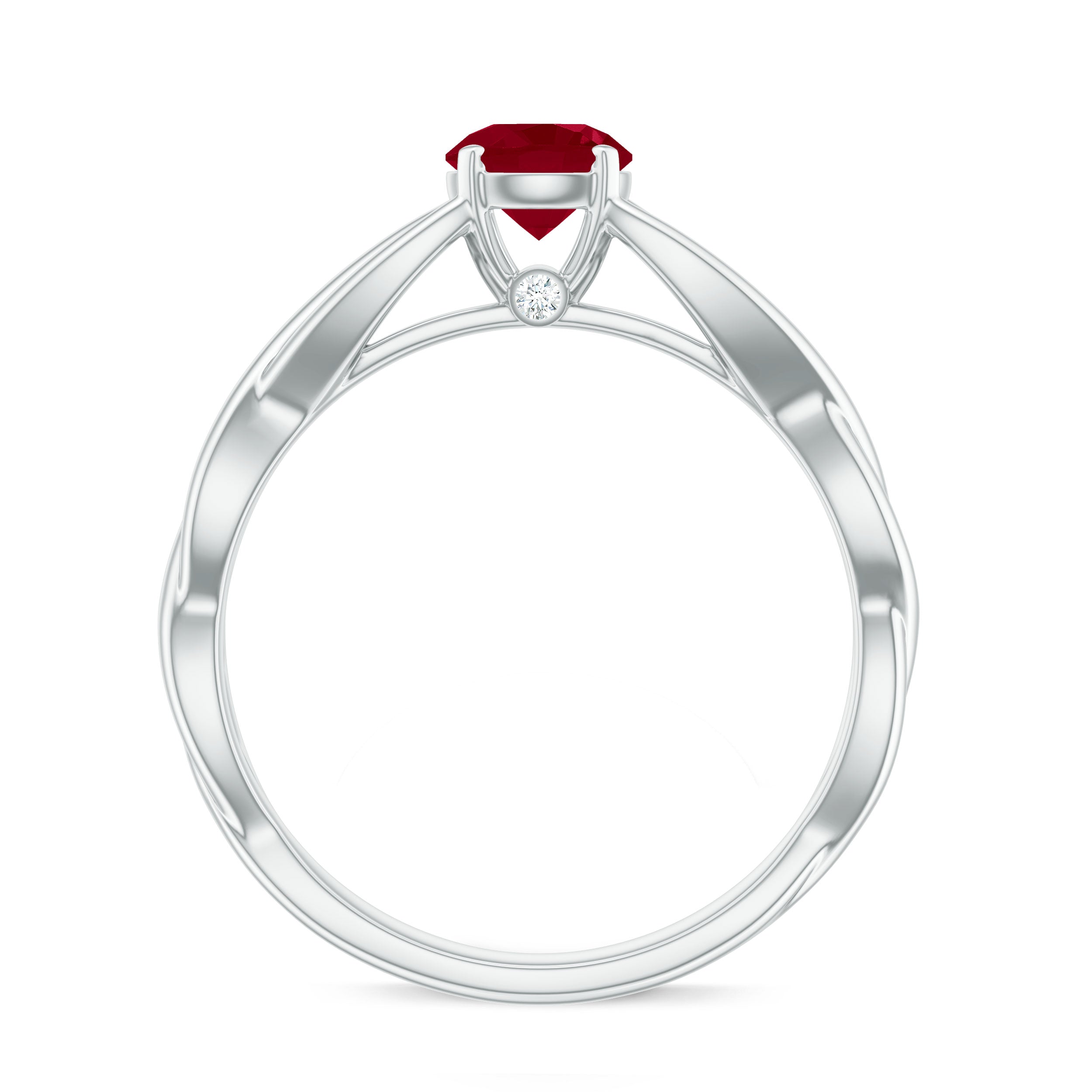 Anything but ordinary, this Ruby Solitaire Crossover Ring is meant to speak to your exceptional sense of style. The main highlight of its beauty, the Bold Centerpiece of 5 MM Round Shape Ruby rests on a Crossover Shank, tightly secured by Peg Head Setting. Complementing it with a tint of brilliance is a Round Shape Diamond right below the center stone. Whats more, this Certified Ruby Solitaire Ring stands out for its phenomenal quality, which makes it perfect to be flaunted all day, everyday!
