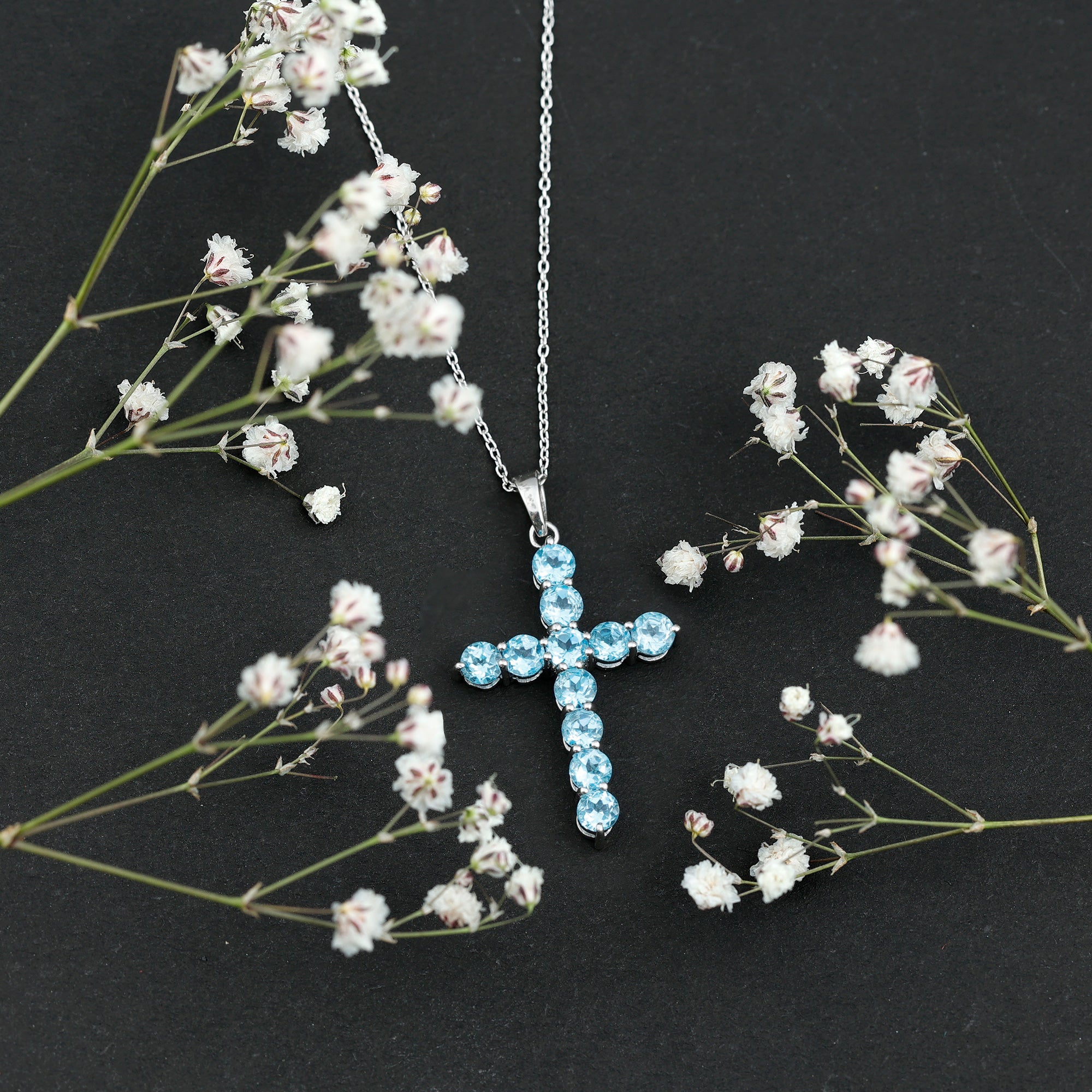 This stunning Cross Necklace is not just a beautiful piece of jewelry, it represents a deep symbol of love and faith. Adorned with round cut AAA quality Swiss blue topaz set in secure prong setting, this Simple Pendant Necklace is ideal for those who cherish spirituality. Crafted with our master artisans unmistakable eye for detail in 14k white gold plated sterling silver, this Christian Pendant ensures that each gemstone radiates its utmost brilliance. The Topaz Pendant Necklace is suspended from a cable chain, enhancing its elegance. To ensure its Quality, it comes with a certificate of authenticity, providing peace of mind.