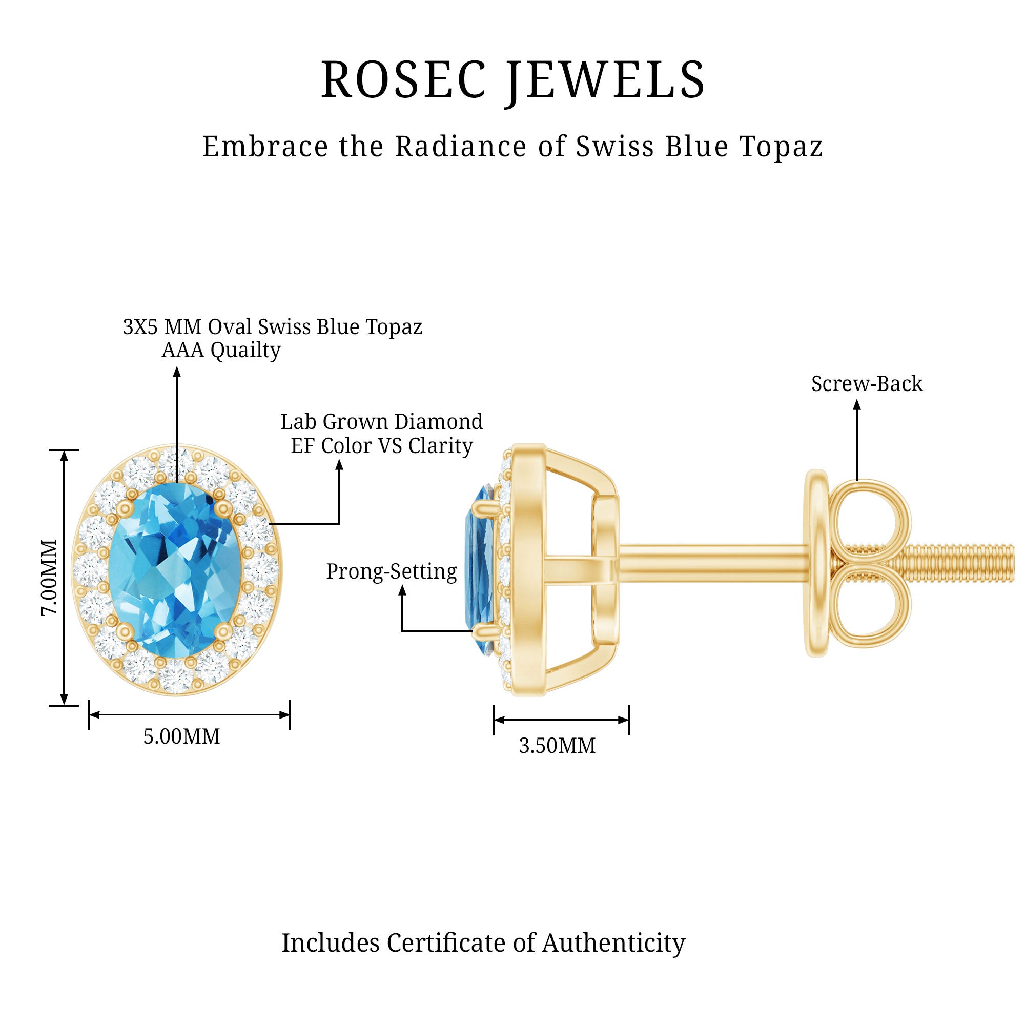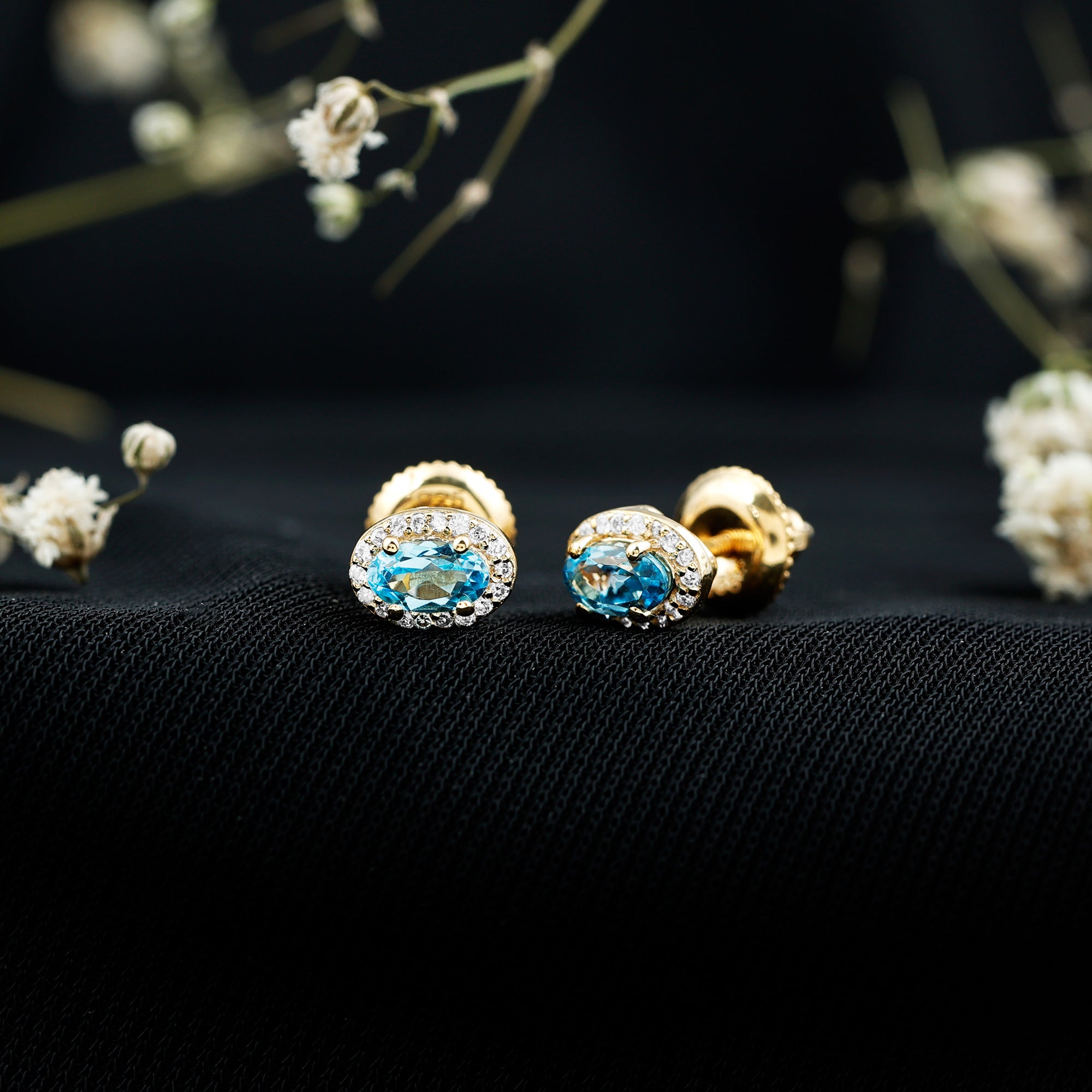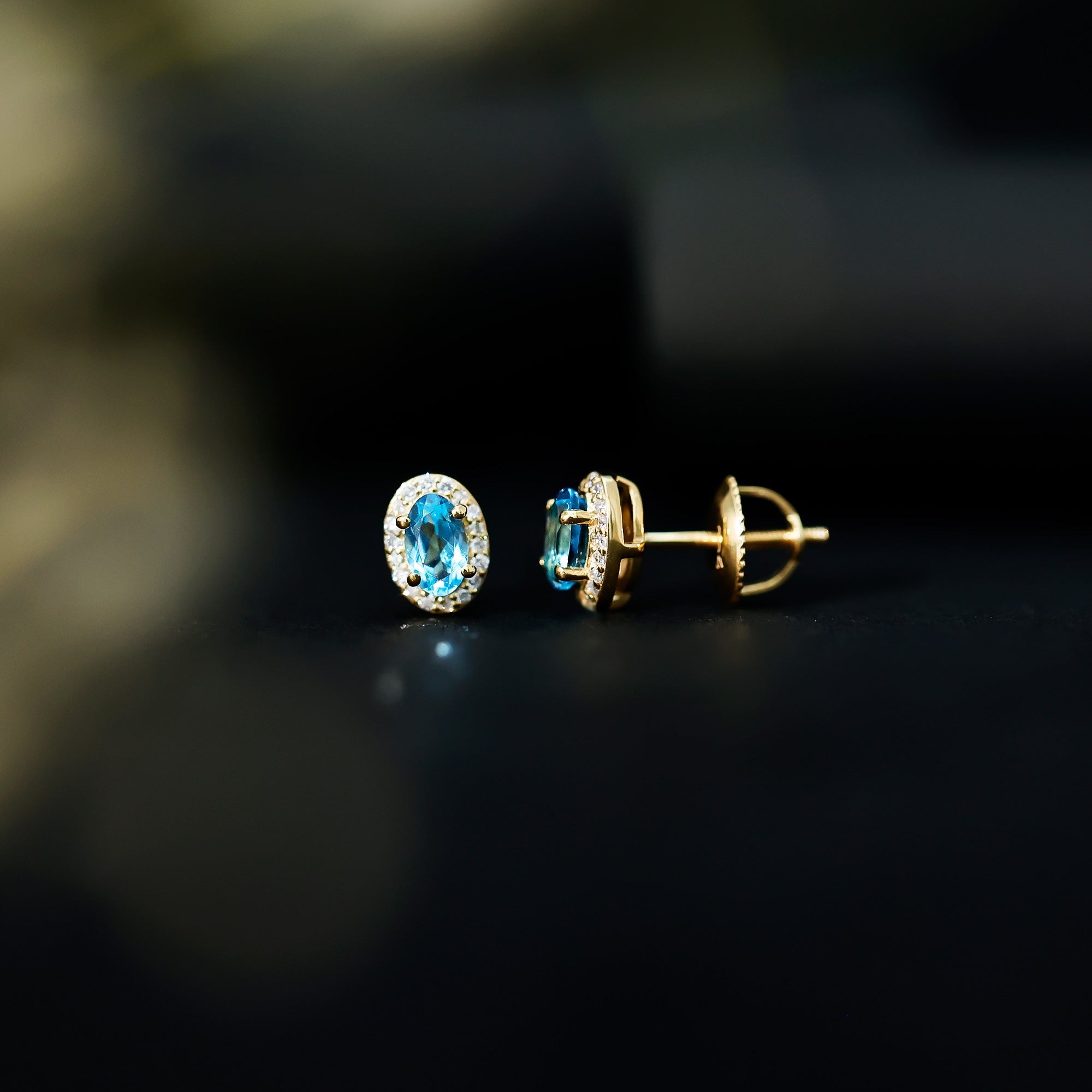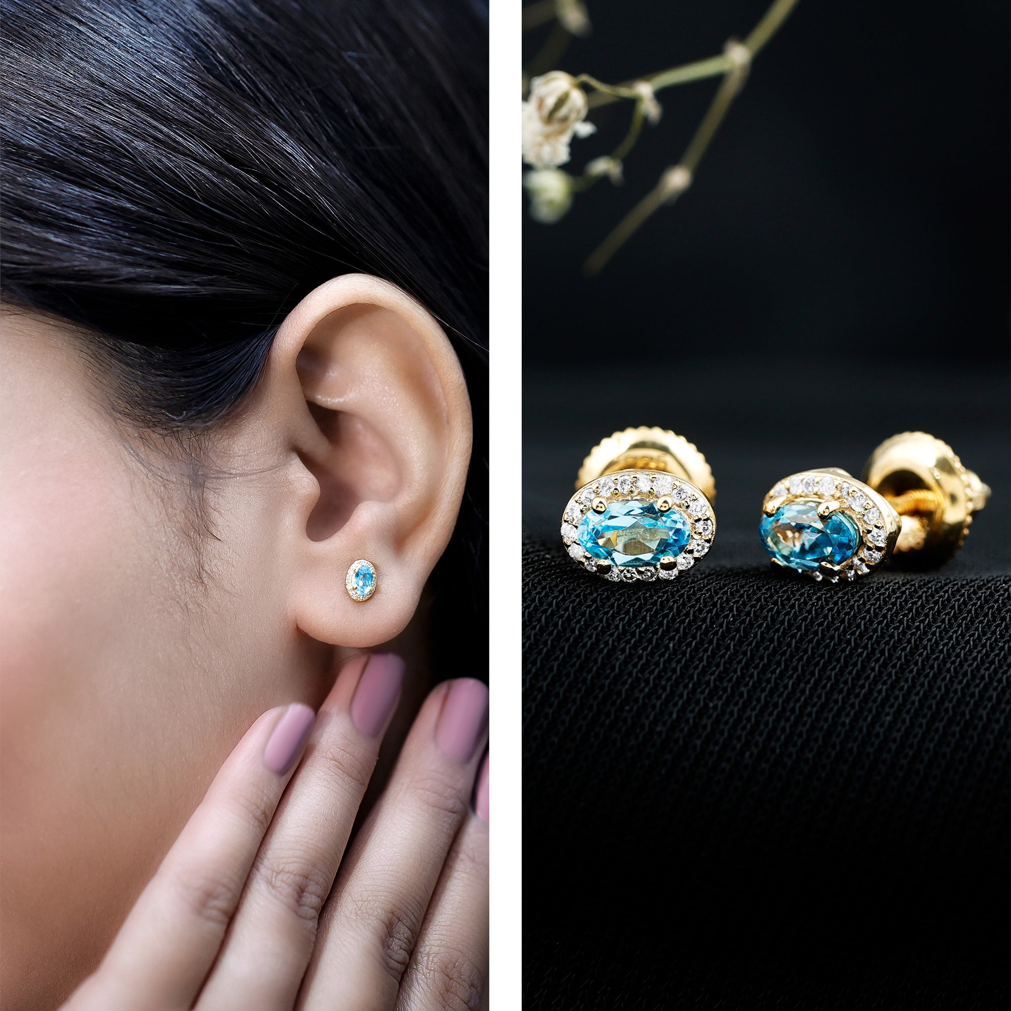 Delicate, dreamy, and designed to impress - these Swiss Blue Topaz Earrings are a graceful blend of simplicity and beauty. Designed in yellow gold plated silver, they have a classic shape and an eye-catching color that stands out beautifully. Each earring features a 3X5 MM oval shaped Swiss Blue Topaz, set securely in prong setting. Known as the birthstone for December, Swiss Blue Topaz symbolizes peace, honesty, and clarity, making these Oval Stud Earrings a thoughtful gift for someone born in that month. A sparkling halo of lab grown diamonds surrounds the center stone, adding extra shine without taking away from its natural beauty. The Blue Topaz and Diamond Earrings are finished with a screw back closure, keeping them safe and comfortable for all-day wear. Lightweight and simple to style, they can be worn with casual looks or dressed up for formal events. Made with AAA quality Swiss Blue Topaz, these December Birthstone Earrings bring a timeless feel with a modern touch. They come in a signature jewelry box and include a gemstone certificate for authenticity. This pair is a lovely way to show personality and elegance, something to be treasured for years to come.