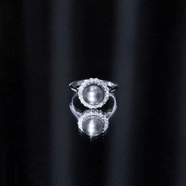 The halo setting surrounds the central pearl with a circle of diamonds, drawing attention toward the center stone while adding additional light and sparkle. This design technique enhances the visual presence of the pearl while maintaining a balanced and elegant appearance.