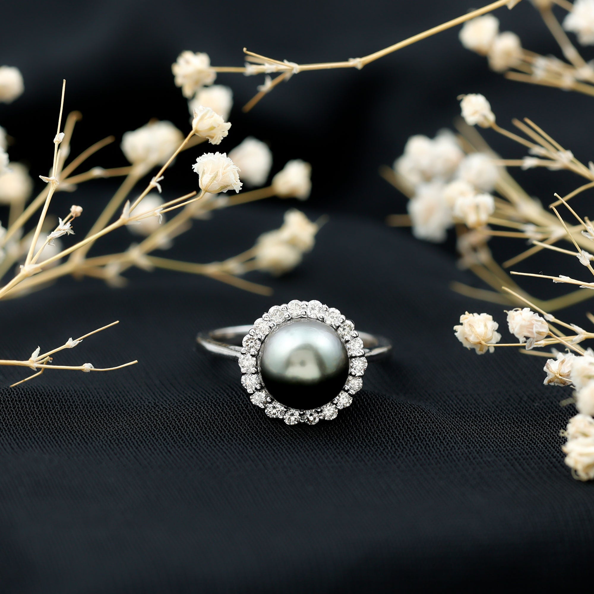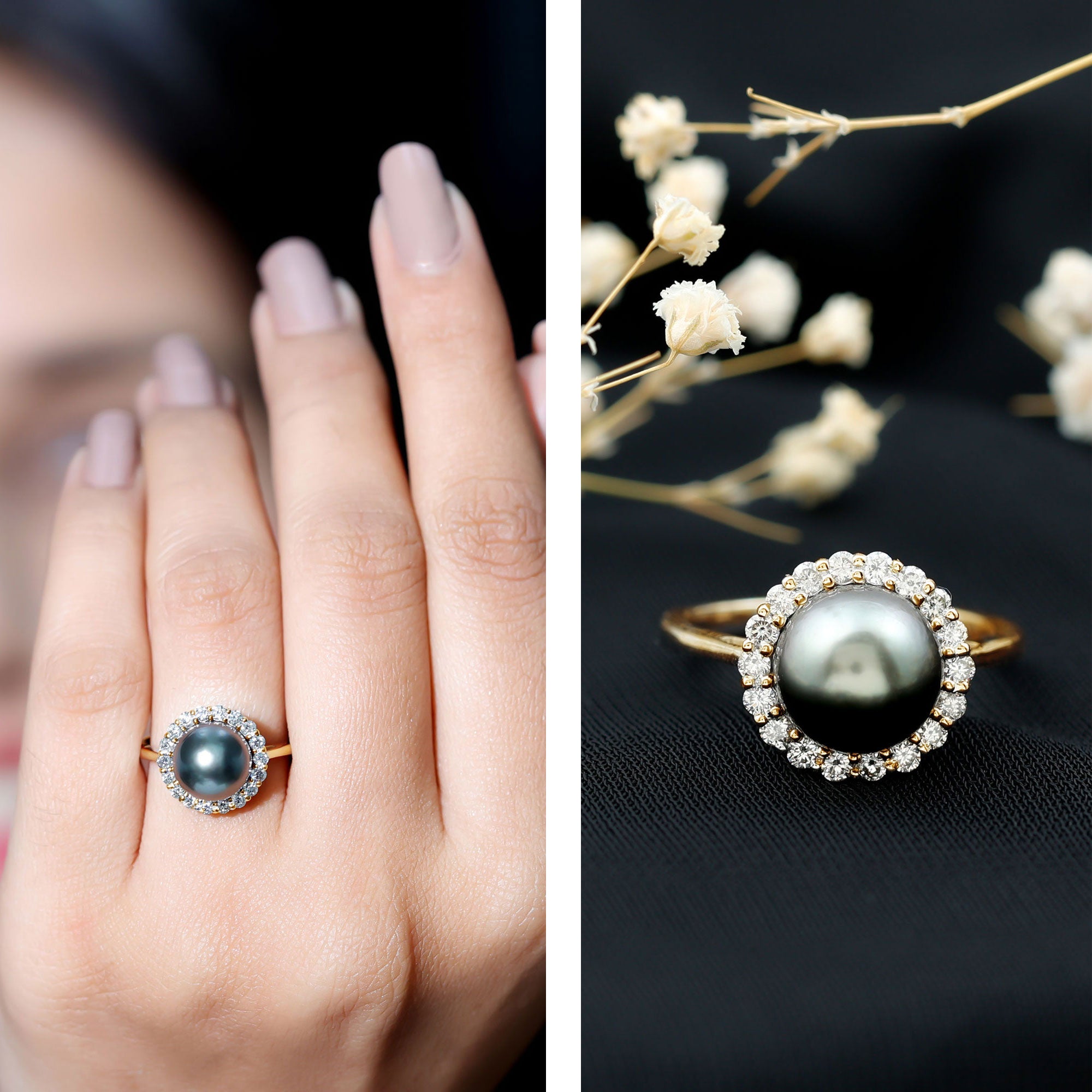 For those who appreciate engagement rings that highlight organic gemstones and elegant design, this Tahitian pearl and diamond halo ring offers a sophisticated and expressive style.