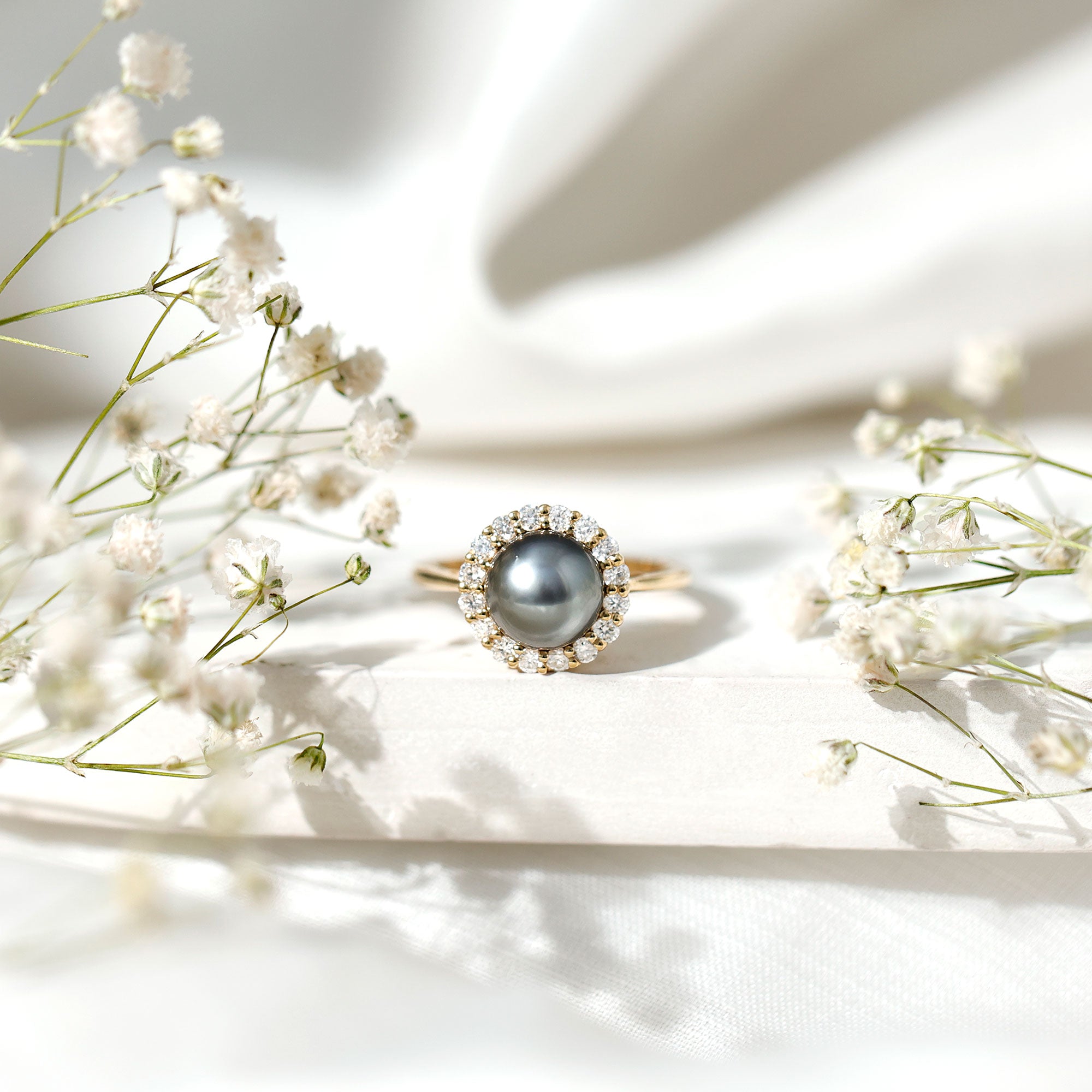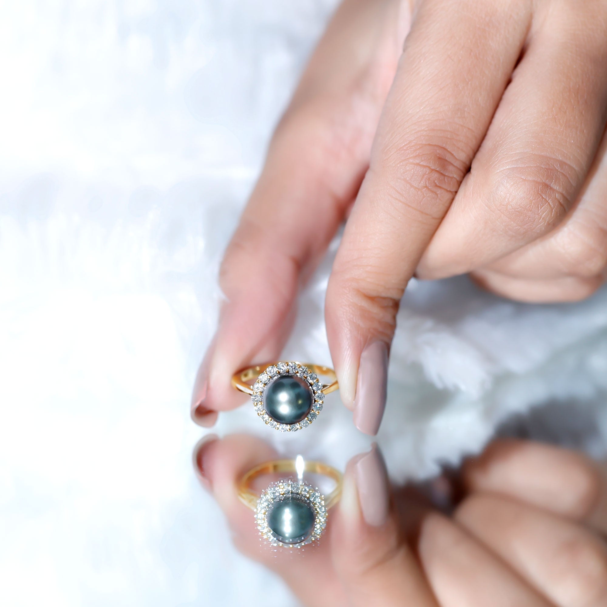 This engagement ring features a natural Tahitian pearl at the center, surrounded by a halo of diamonds that enhances its distinctive beauty. The luminous pearl creates a refined focal point, while the surrounding diamonds introduce brilliance and visual balance to the design.