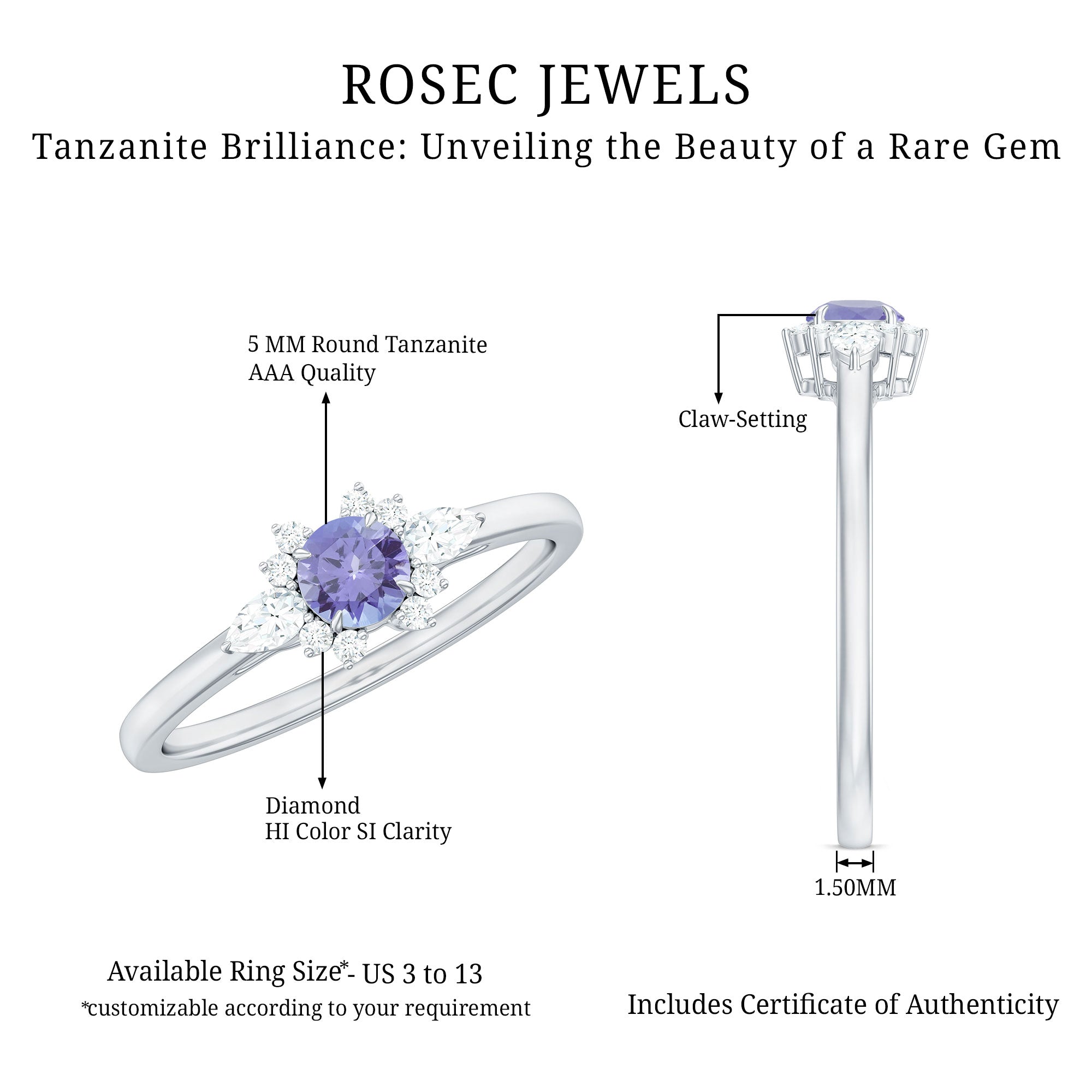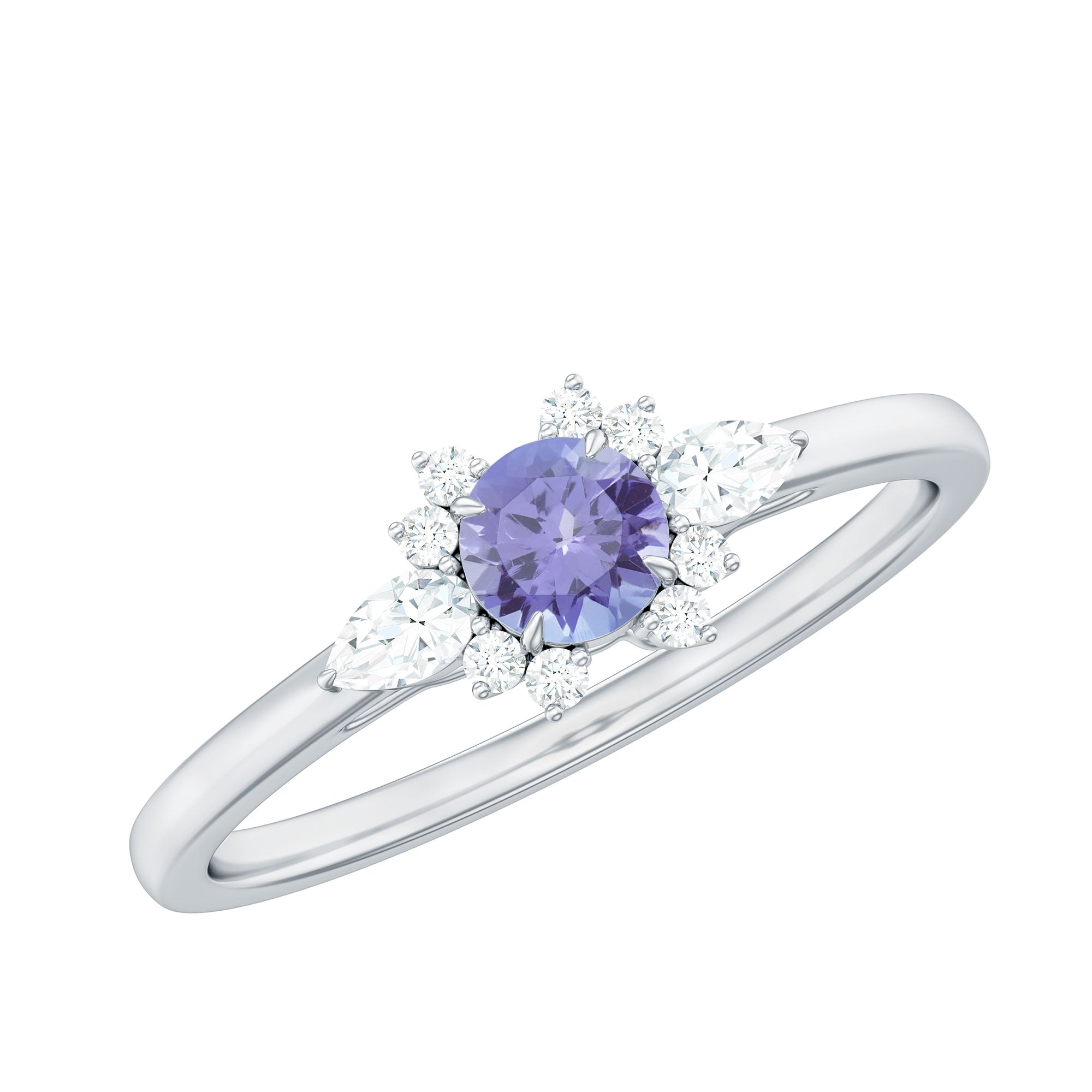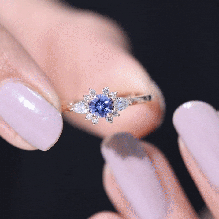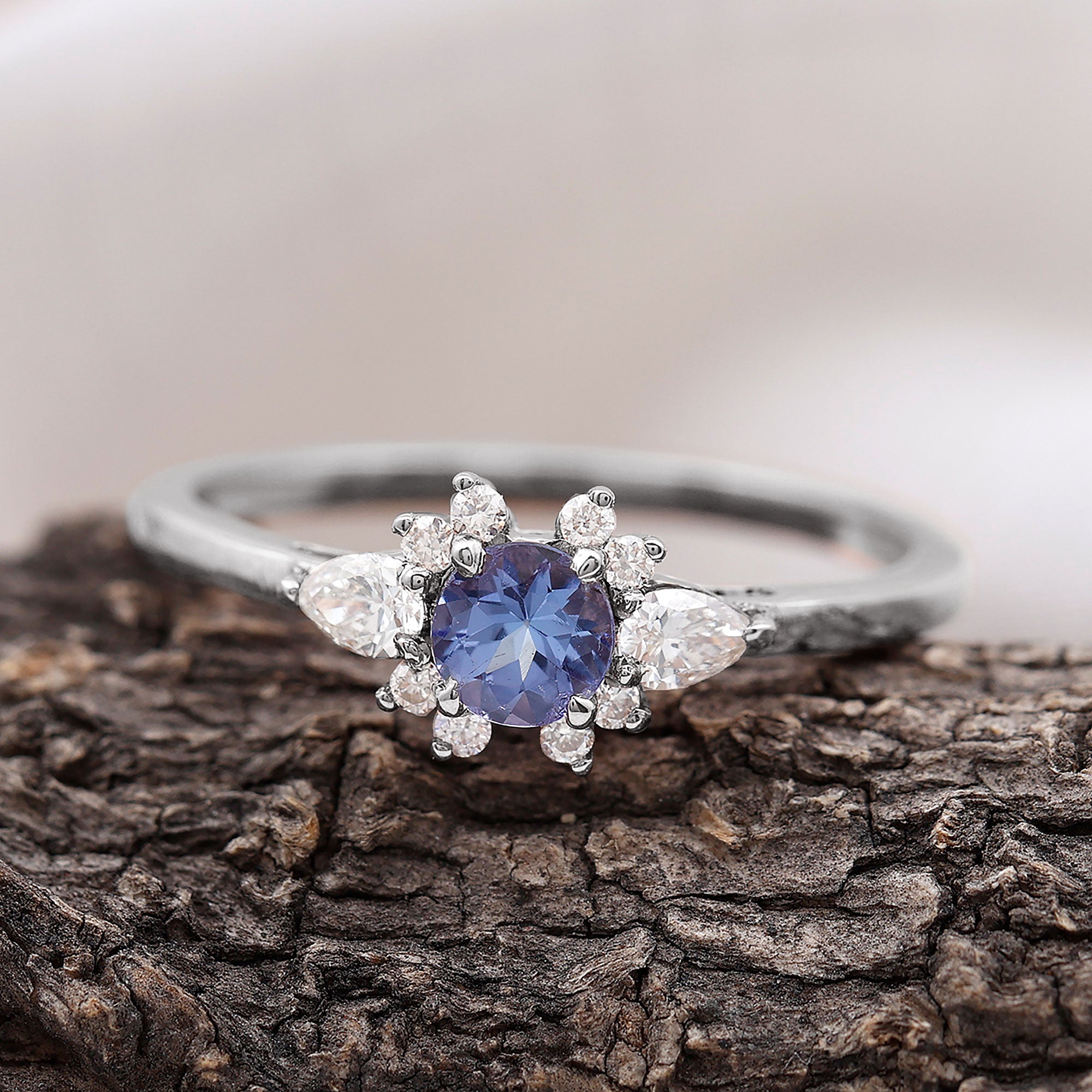 This natural tanzanite promise ring is designed to symbolize commitment with distinctive color. The center tanzanite displays its characteristic blue-to-violet tones, offering a refined alternative to traditional clear gemstones.