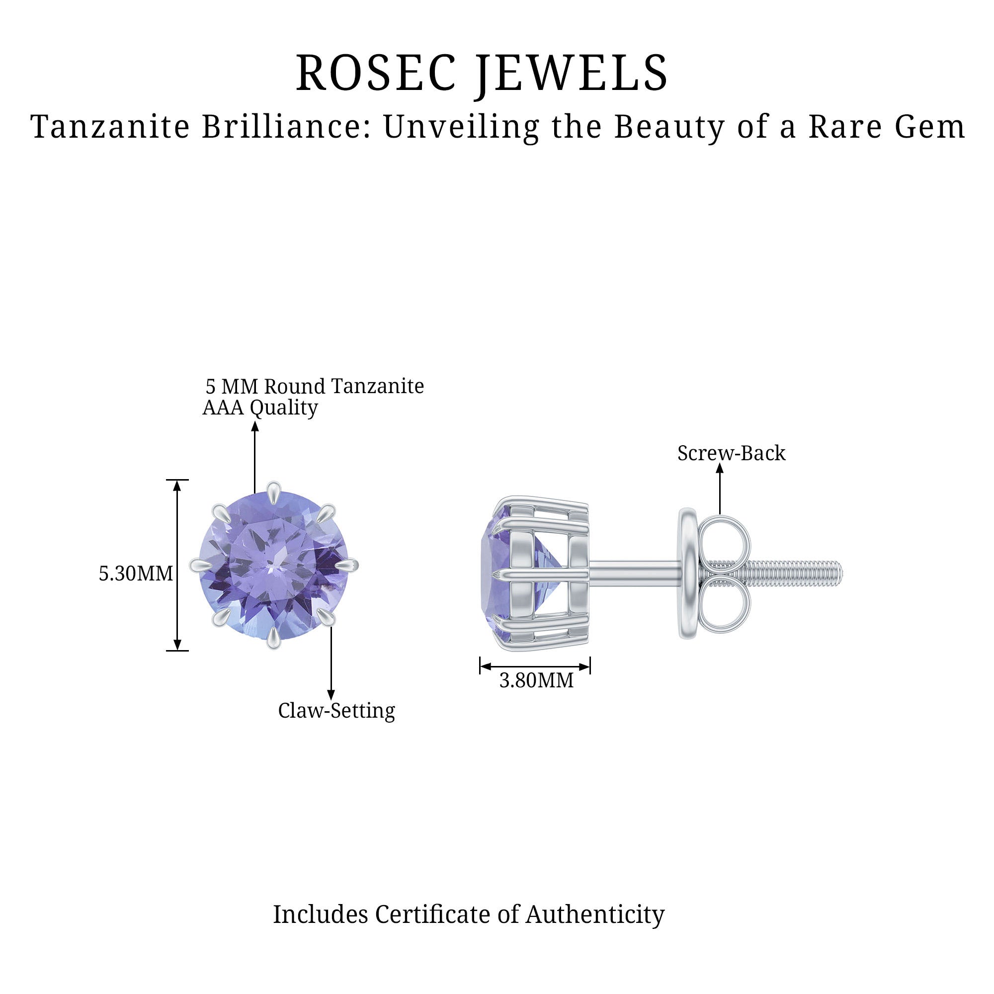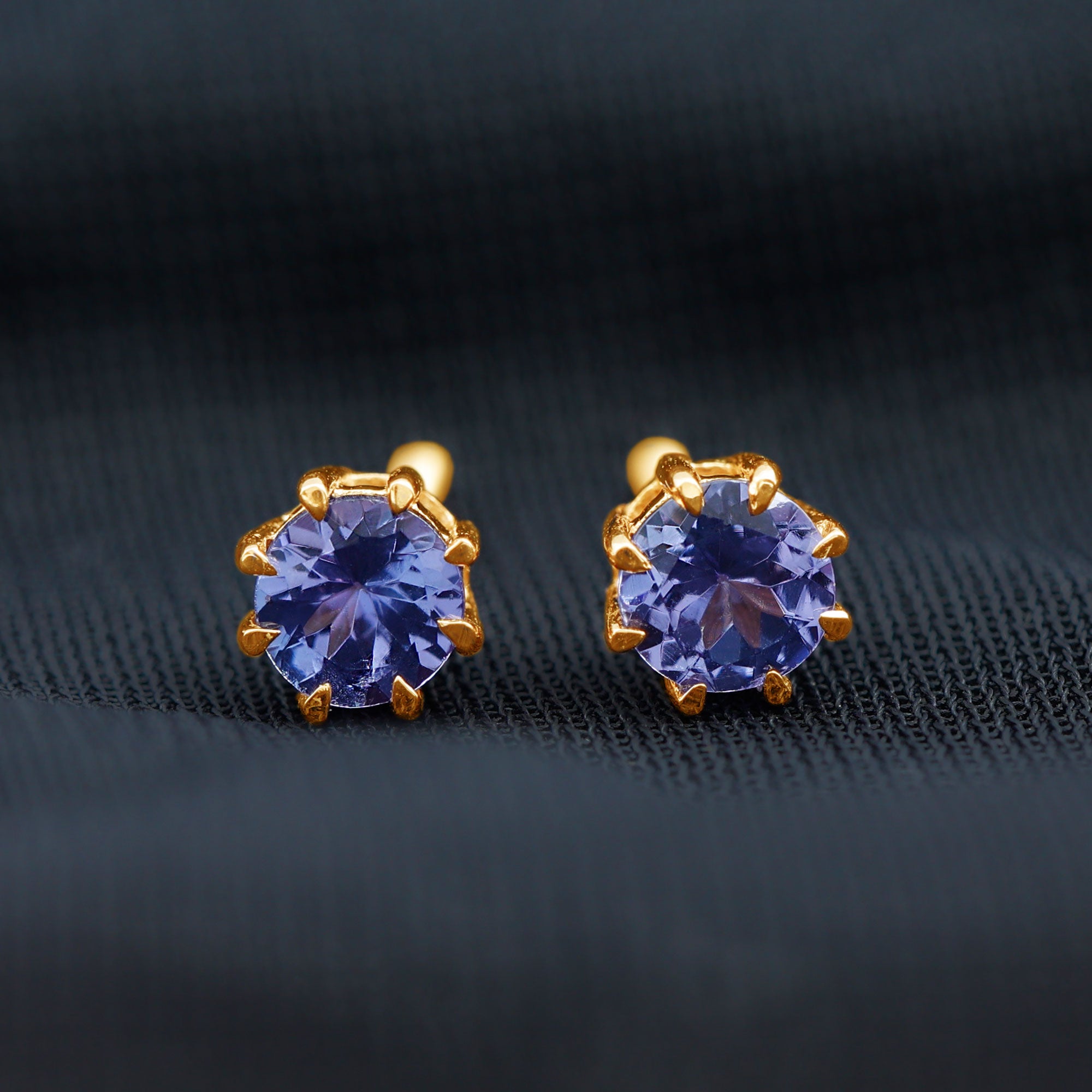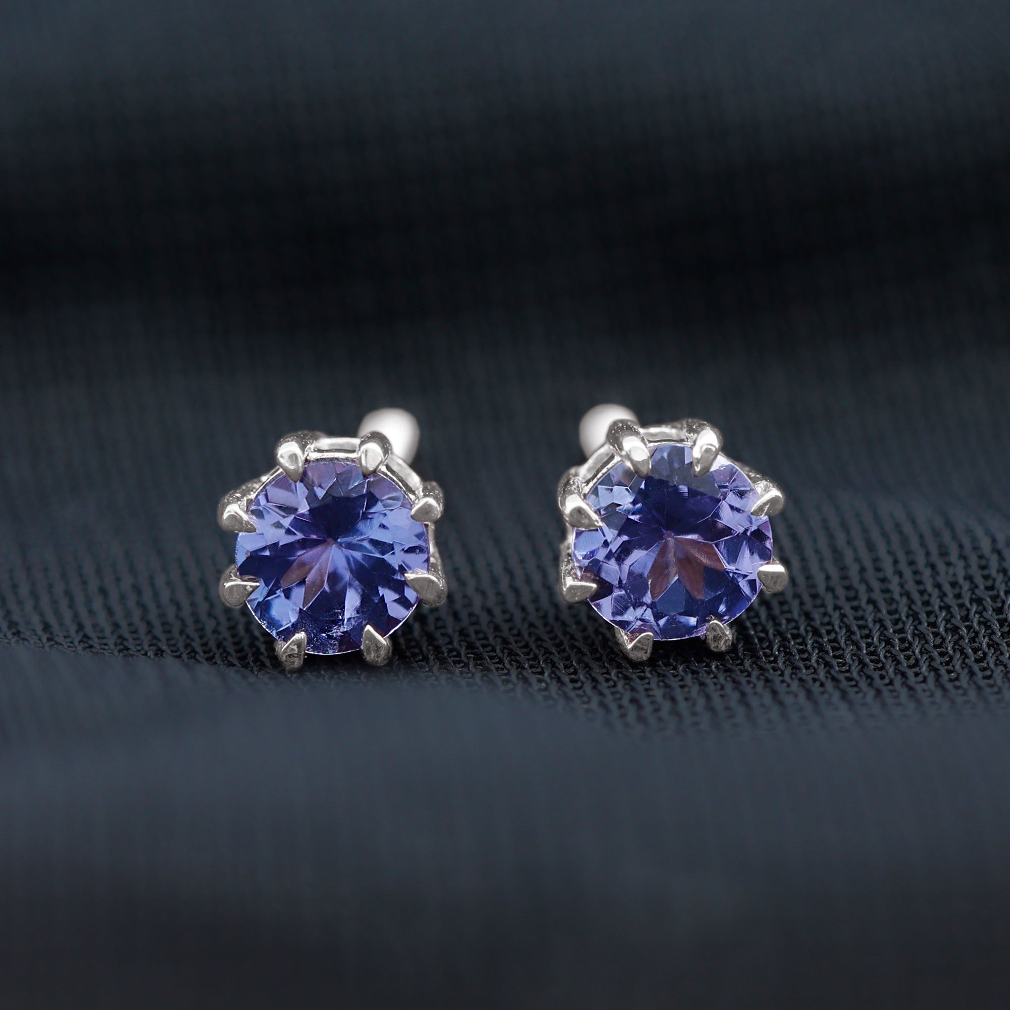 Whether it is a New Year Party or Everyday dressing, these Stud Earrings fit with every look. These Earrings are embellished with round shape Tanzanite set as Solitaire in 8 Claw Prong Setting. These Screw Back earrings are a fabulous choice for your loved one.