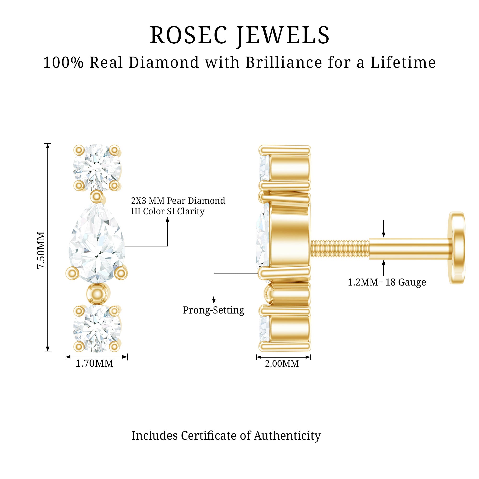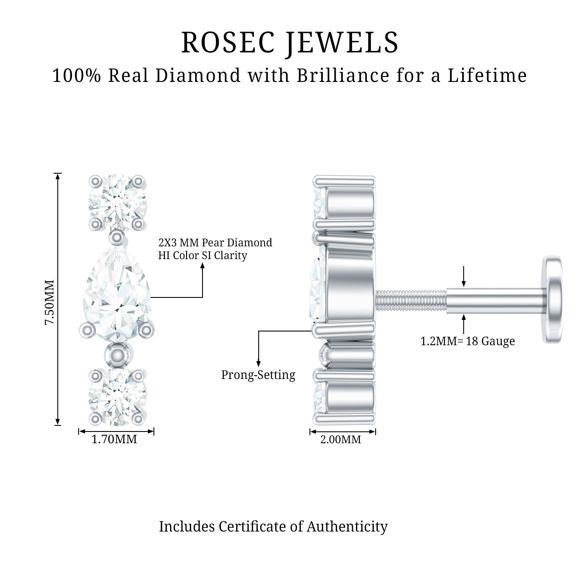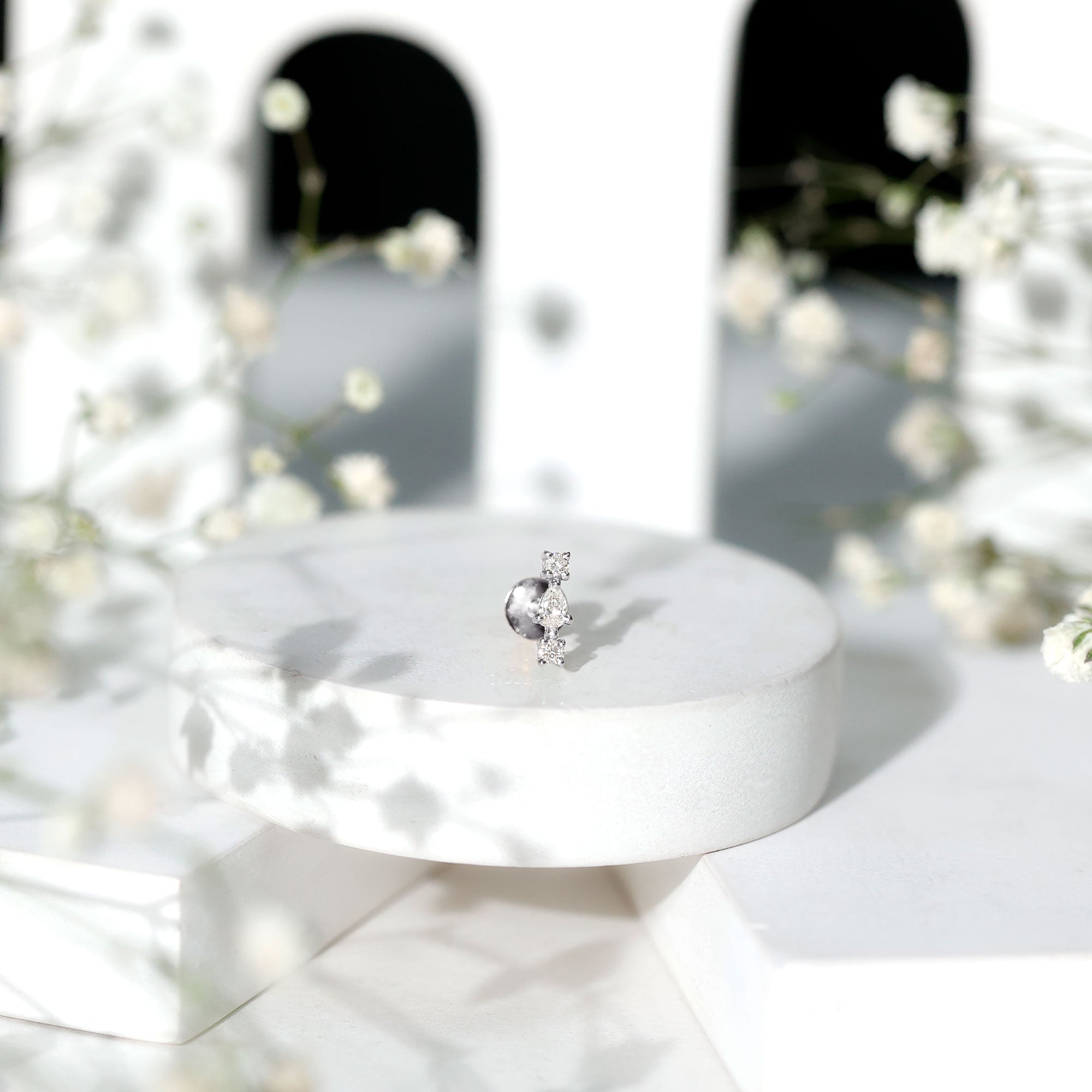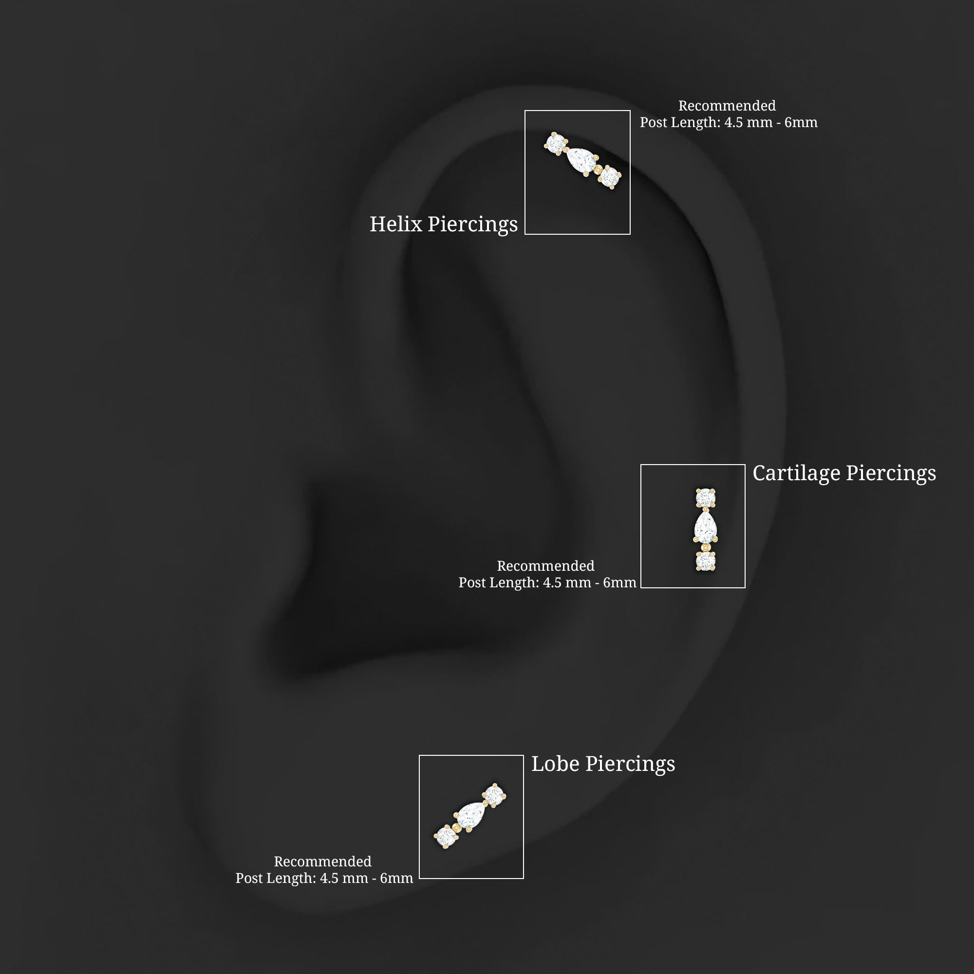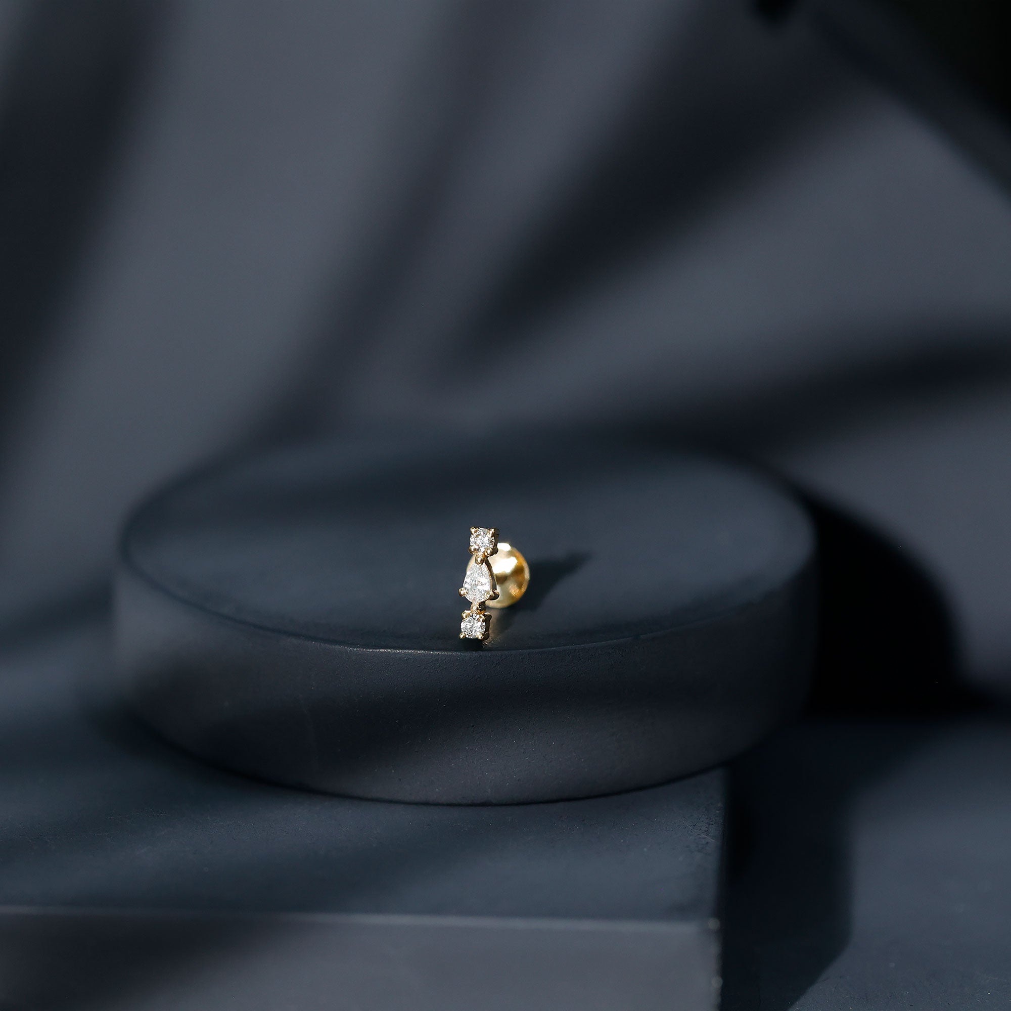 Bold, brilliant, and beautifully crafted, our Diamond 3 Stone Earring is a radiant statement piece designed to captivate on any special evening out. Featuring a stunning combination of pear and round shaped diamonds set securely in prong setting, this Helix Piercing Stud delivers a captivating sparkle that catches the light from every angle. Versatile and stylish, this Real Diamond Earring can be worn on the cartilage, helix, tragus, or upper lobe piercing, allowing you to personalize your look with ease. Whether worn on its own to create a striking focal point or paired with other pieces for a curated or stacked aesthetic, it brings a touch of glamour to any style. The secure flat back closure ensures comfort and stability, making it ideal for everyday wear or special occasions. A meaningful and luxurious gift, this Diamond Helix Earring is designed to make her feel truly cherished. Its timeless sparkle and graceful design reflect the brilliance of the one who wears it, making this Flat Back Cartilage Earring a cherished addition to any jewelry collection and a perfect way to elevate life’s unforgettable moments.