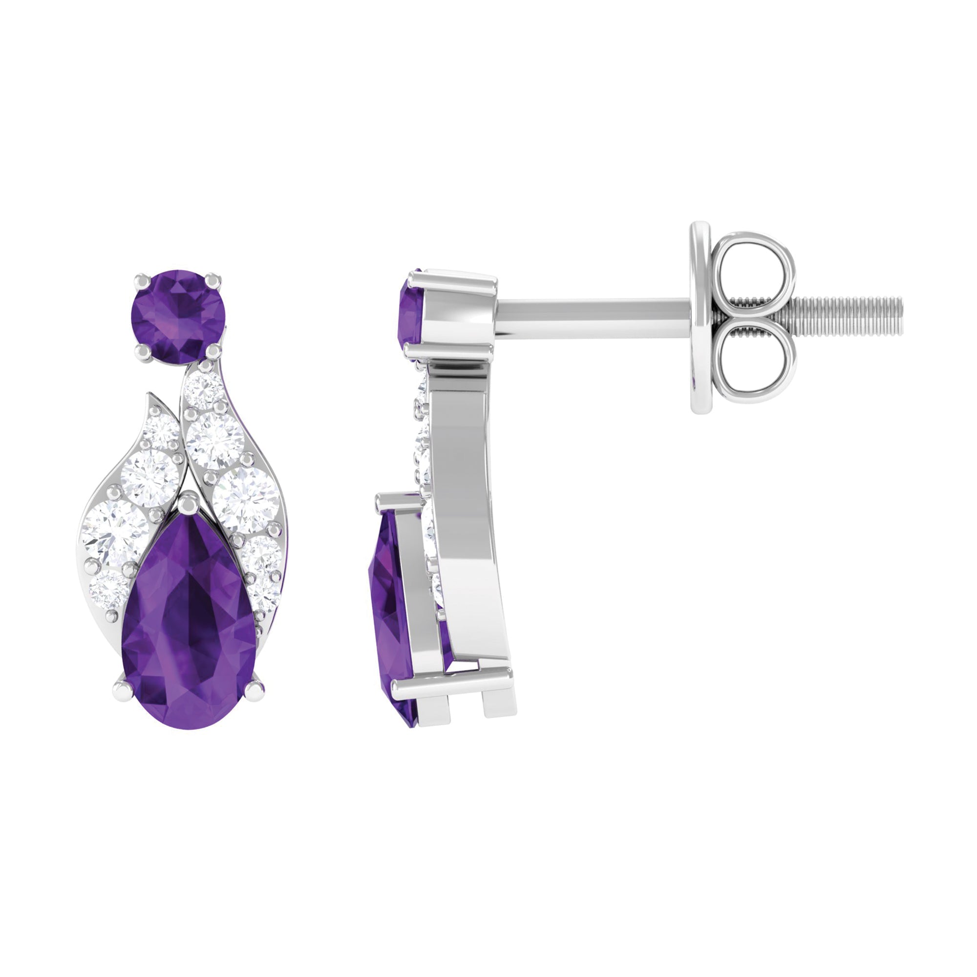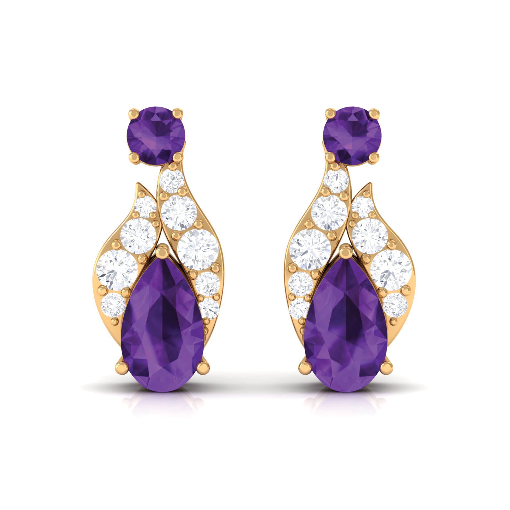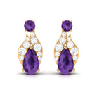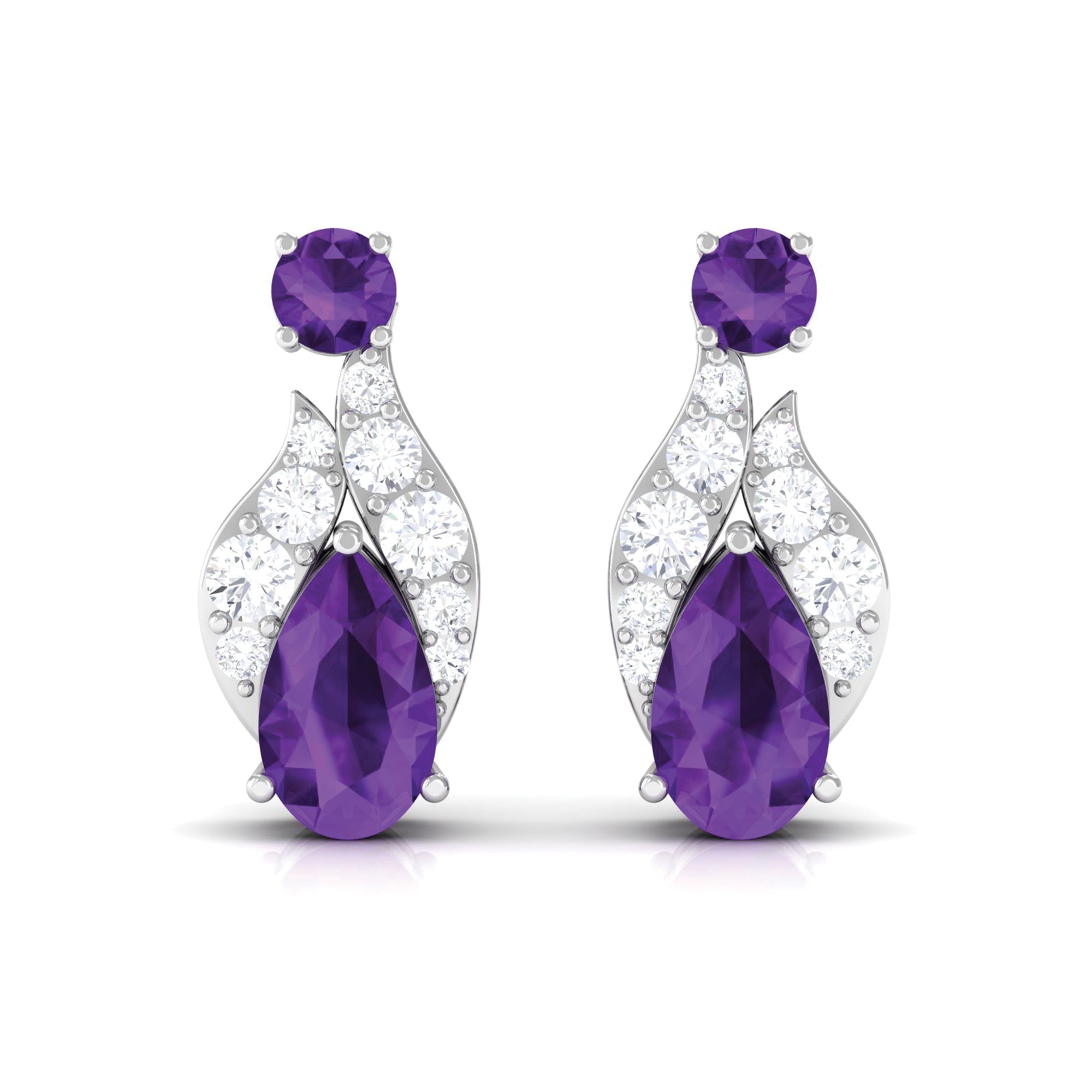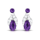 Embrace the beauty of nature with these Amethyst Leaf Earrings. These gorgeous stud earrings draw inspiration from the natural world, featuring a delicate leaf design adorned with pear and round shape Amethyst gemstones and round Diamonds. The Amethysts add a touch of regal charm, while the Diamonds provide a subtle sparkle. These amethyst and diamond earrings are a testament to the wonders of the outdoors, making them a perfect choice for those who appreciate the simplicity and grace of the world around us.