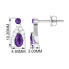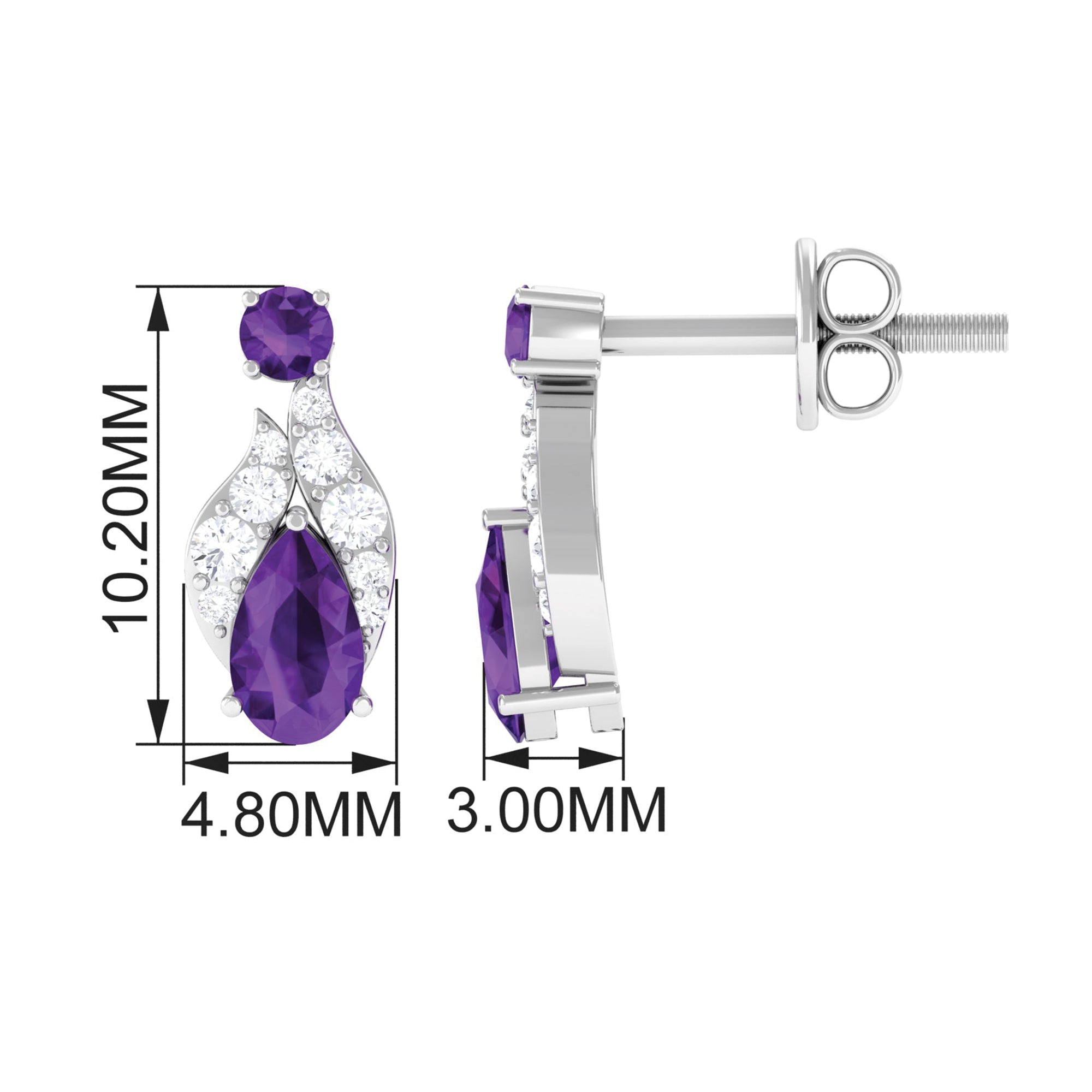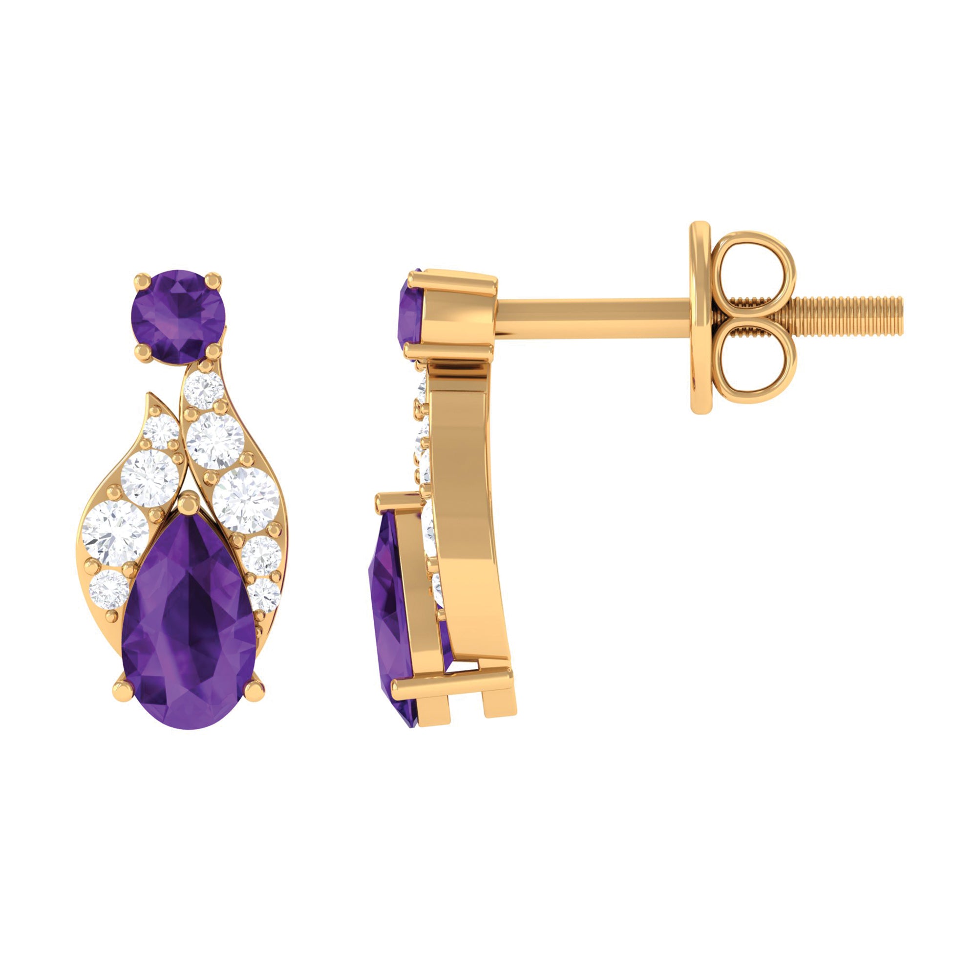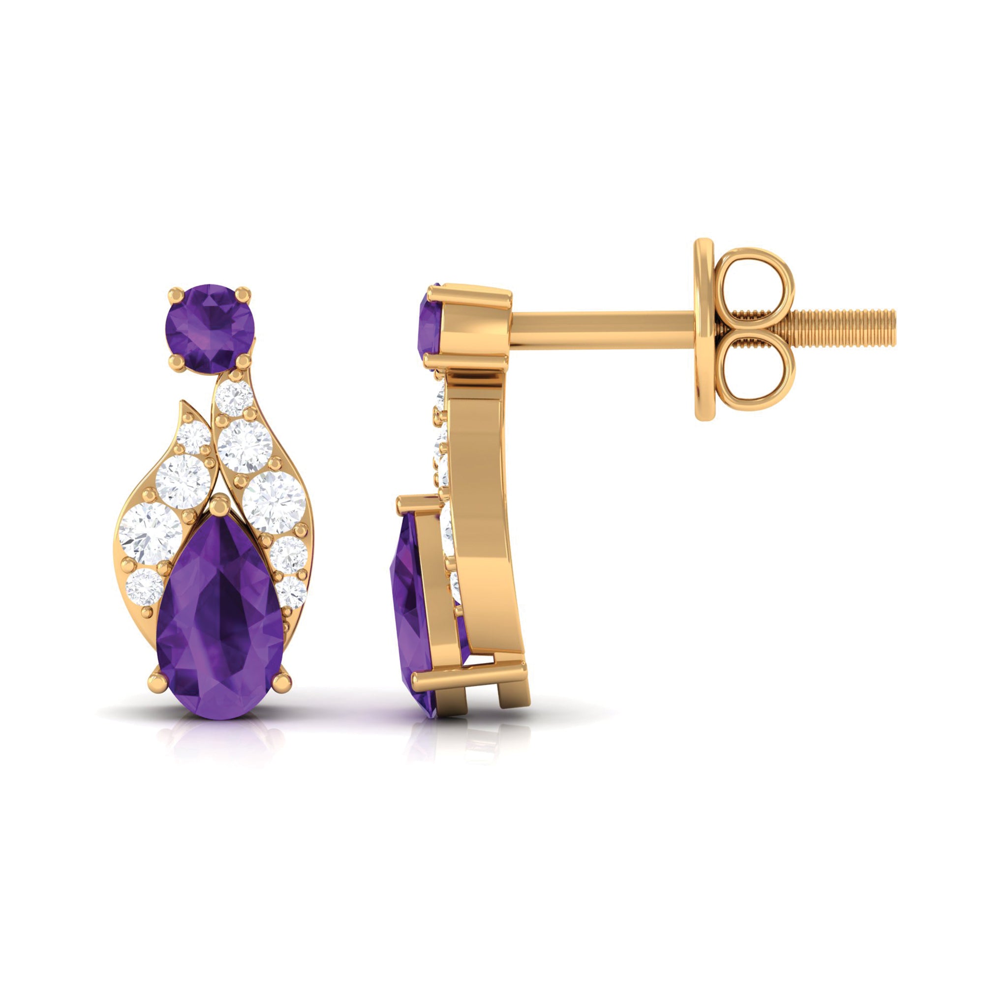 Embrace the beauty of nature with these Amethyst Leaf Earrings. These gorgeous stud earrings draw inspiration from the natural world, featuring a delicate leaf design adorned with pear and round shape Amethyst gemstones and round Diamonds. The Amethysts add a touch of regal charm, while the Diamonds provide a subtle sparkle. These amethyst and diamond earrings are a testament to the wonders of the outdoors, making them a perfect choice for those who appreciate the simplicity and grace of the world around us.