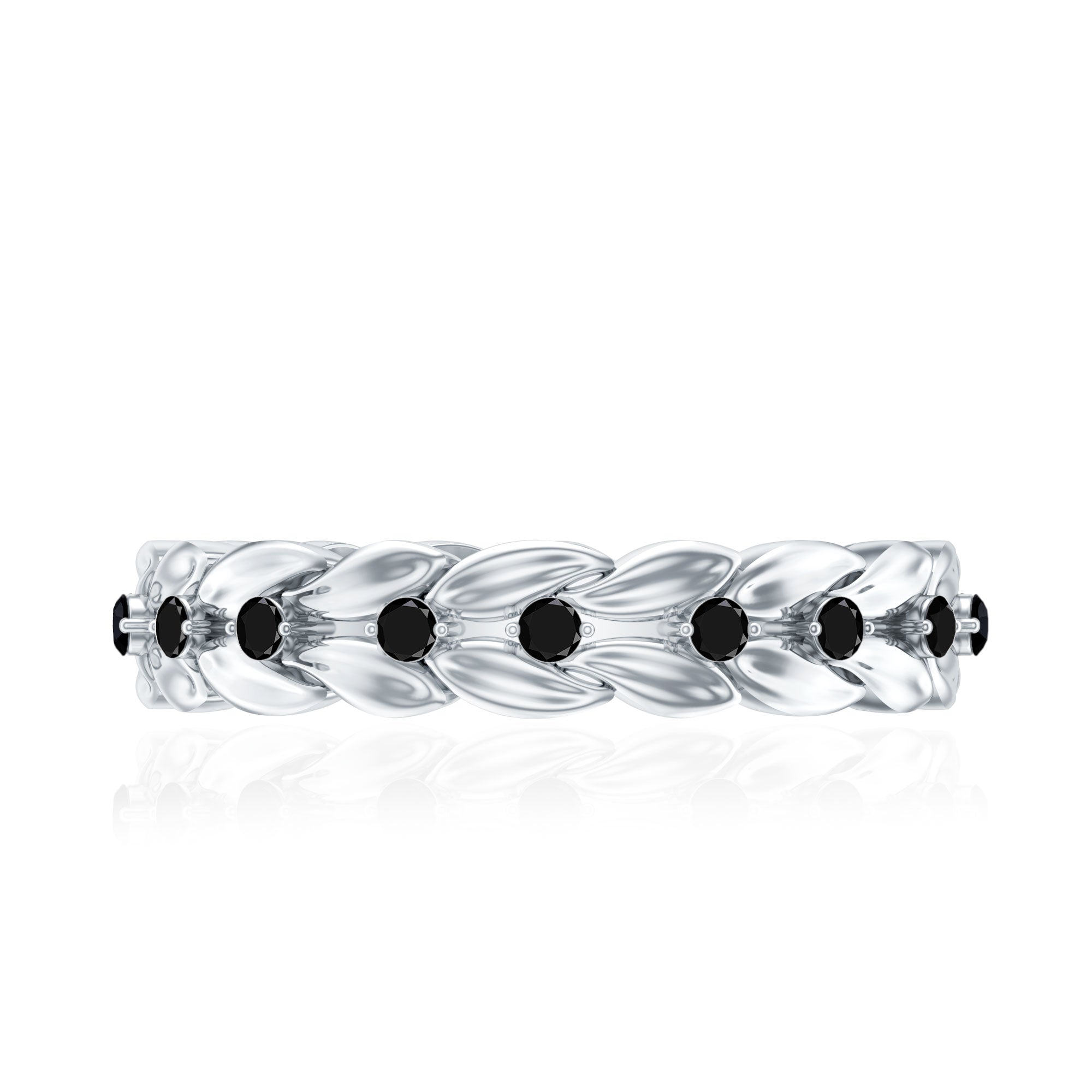 This black onyx leaf wedding band is designed for women who appreciate organic motifs and expressive contrast. The nature-inspired silhouette introduces soft curves and leaf detailing that create movement across the band.