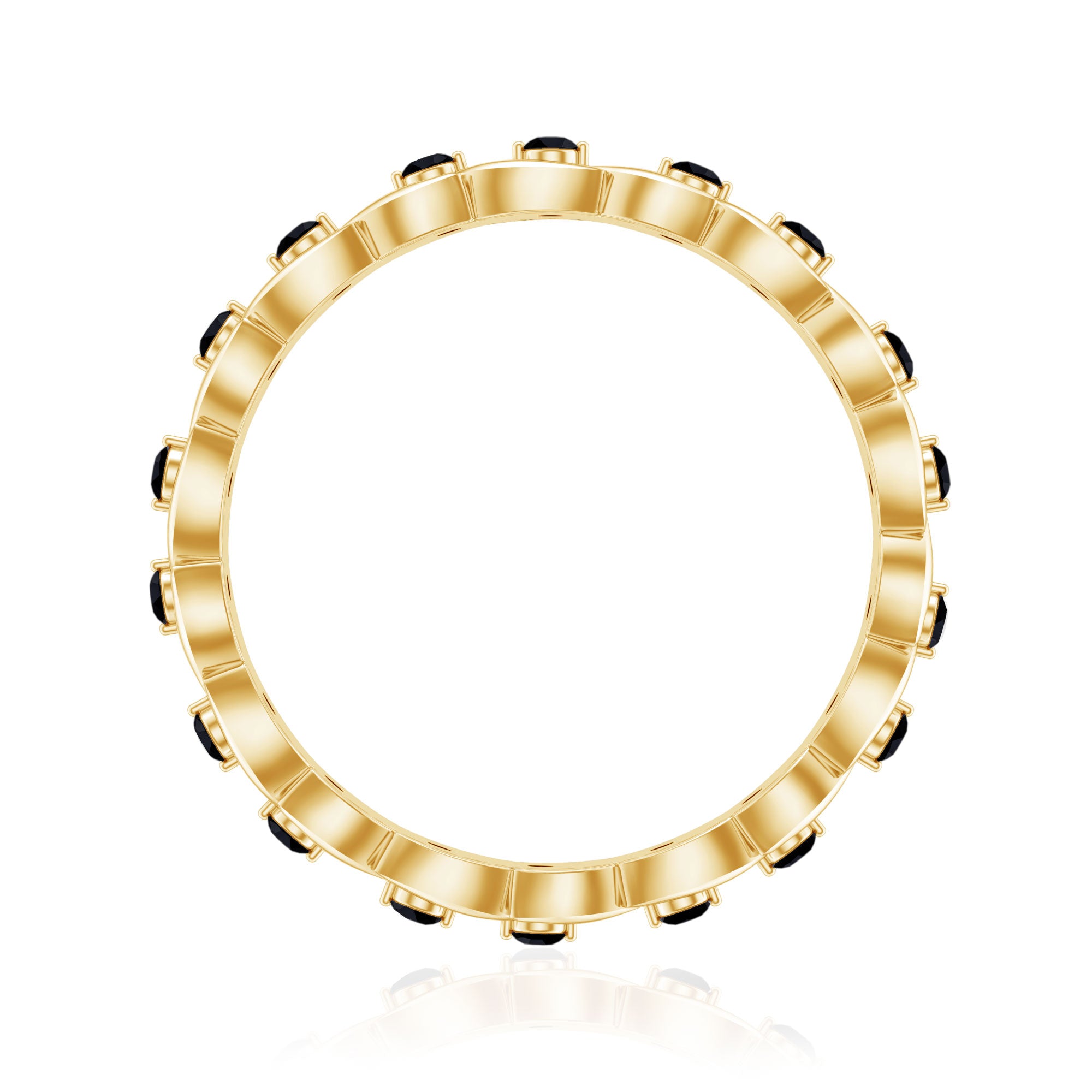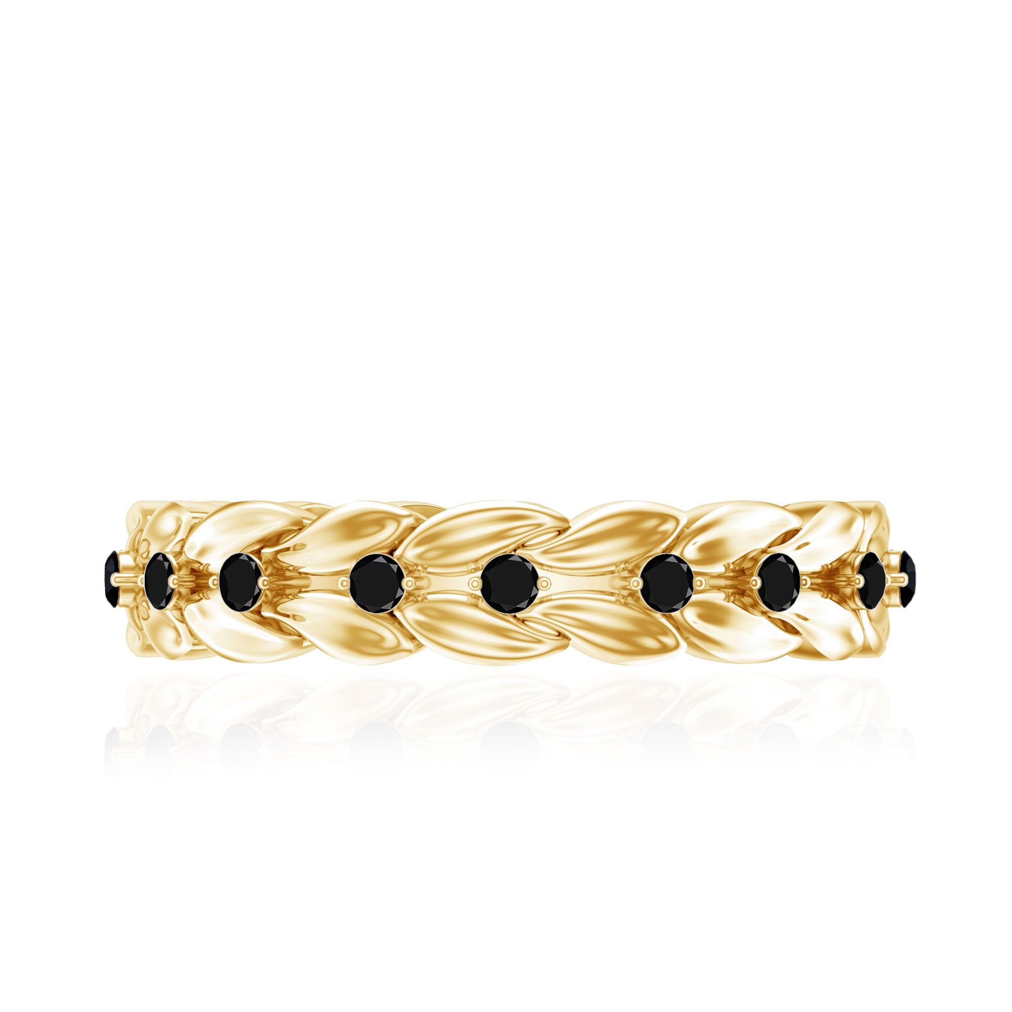 The placement of black onyx within this motif enhances depth and contrast, giving the band a layered, dimensional appearance.