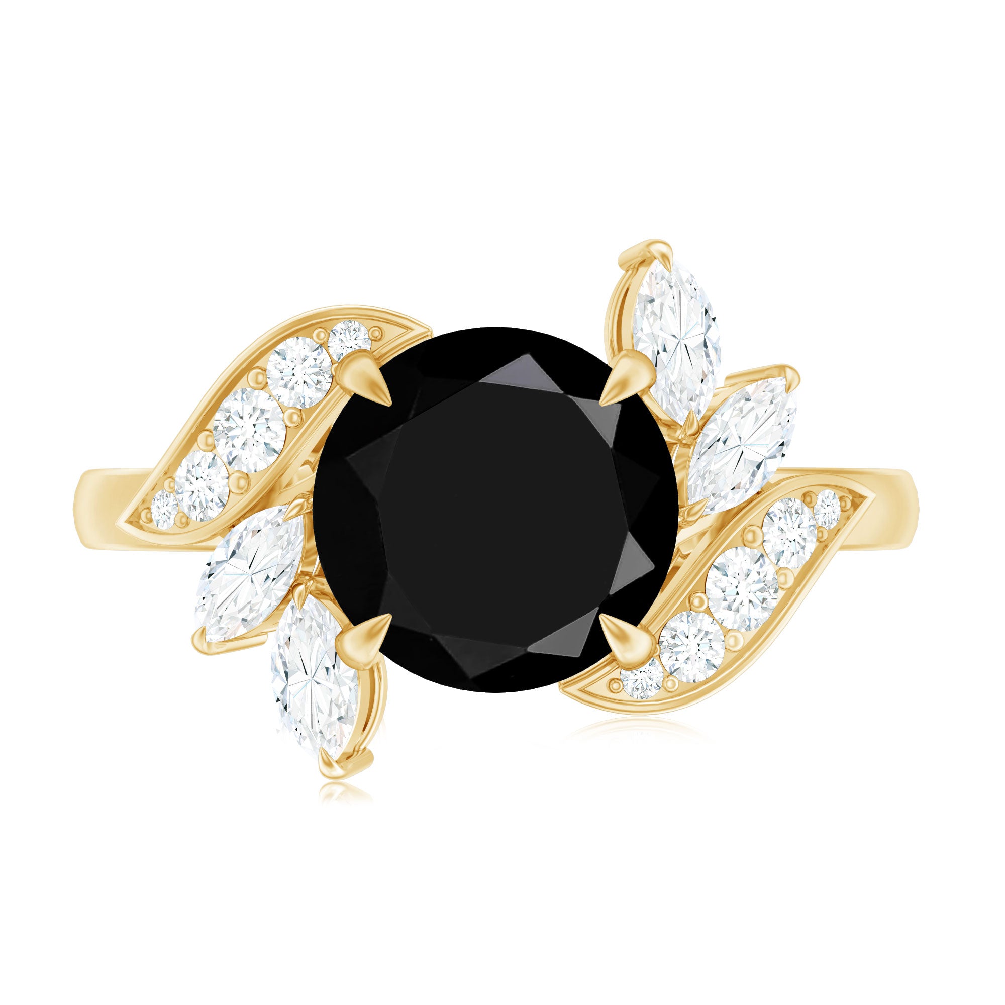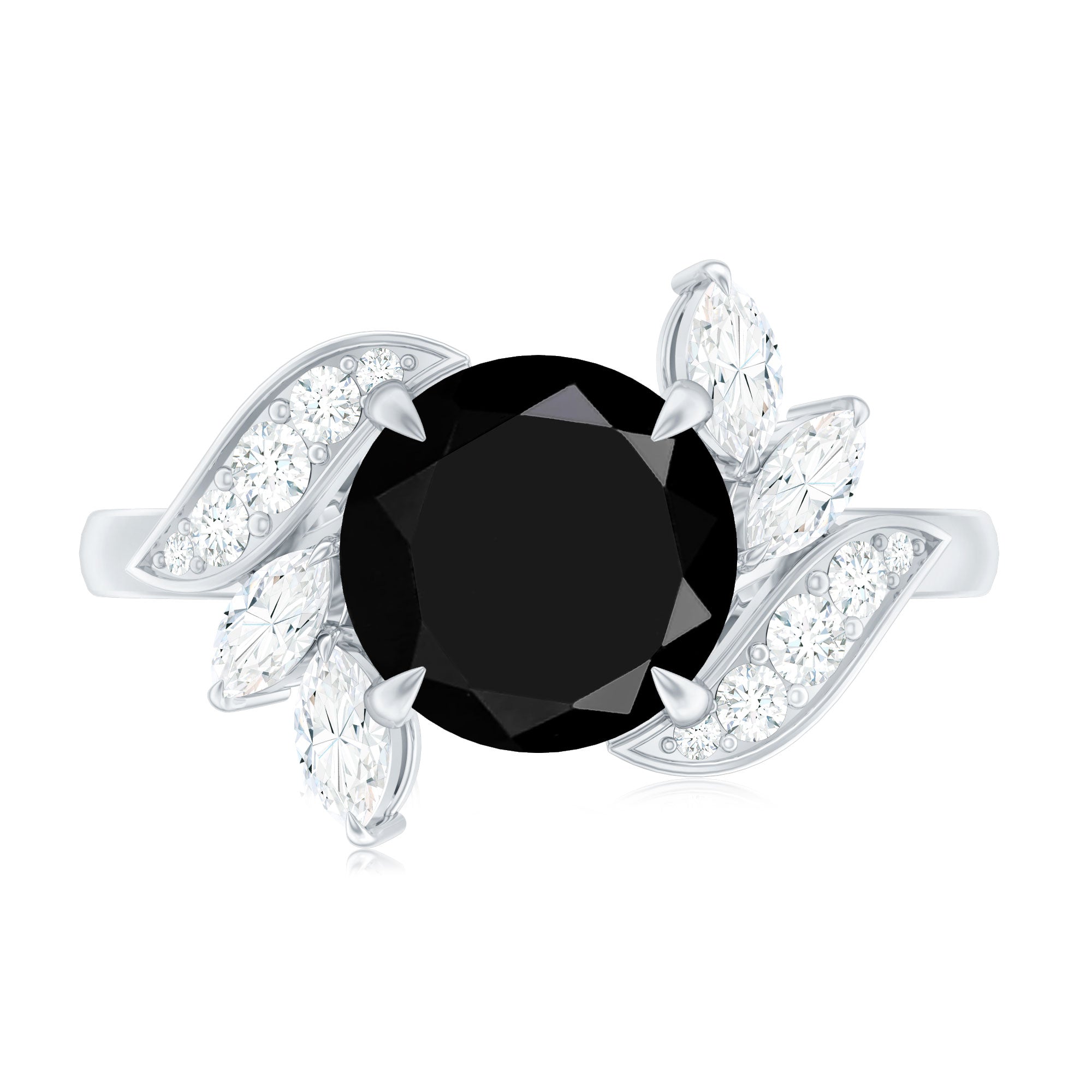 A timeless promise takes shape in this breathtaking Black Spinel Engagement Ring, designed for a love that feels alive and endlessly growing. At its center, a bold Claw Set 8 mm Round Shape Black Spinel shines, rich in depth and mystery. The centerpiece is gently embraced by delicate Leaf motifs, symbolizing growth, harmony and a future built together. Sparkling Round and Marquise shaped Diamond stones are placed within the leaves, adding soft flashes of light that feel like morning dew on a forest path. Every curve and detail feels romantic and full of meaning, making this Nature Inspired Engagement Ring perfect for someone who feels deeply connected to nature and the quiet beauty of love. This Leaf Engagement Ring is a story of two souls rooted together, ready to grow side by side through every season of life. Presented in a signature jewelry box and available in various ring sizes, this Black Spinel Diamond Ring is ready to become part of your most cherished moment.