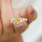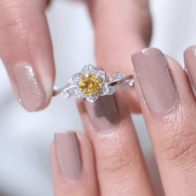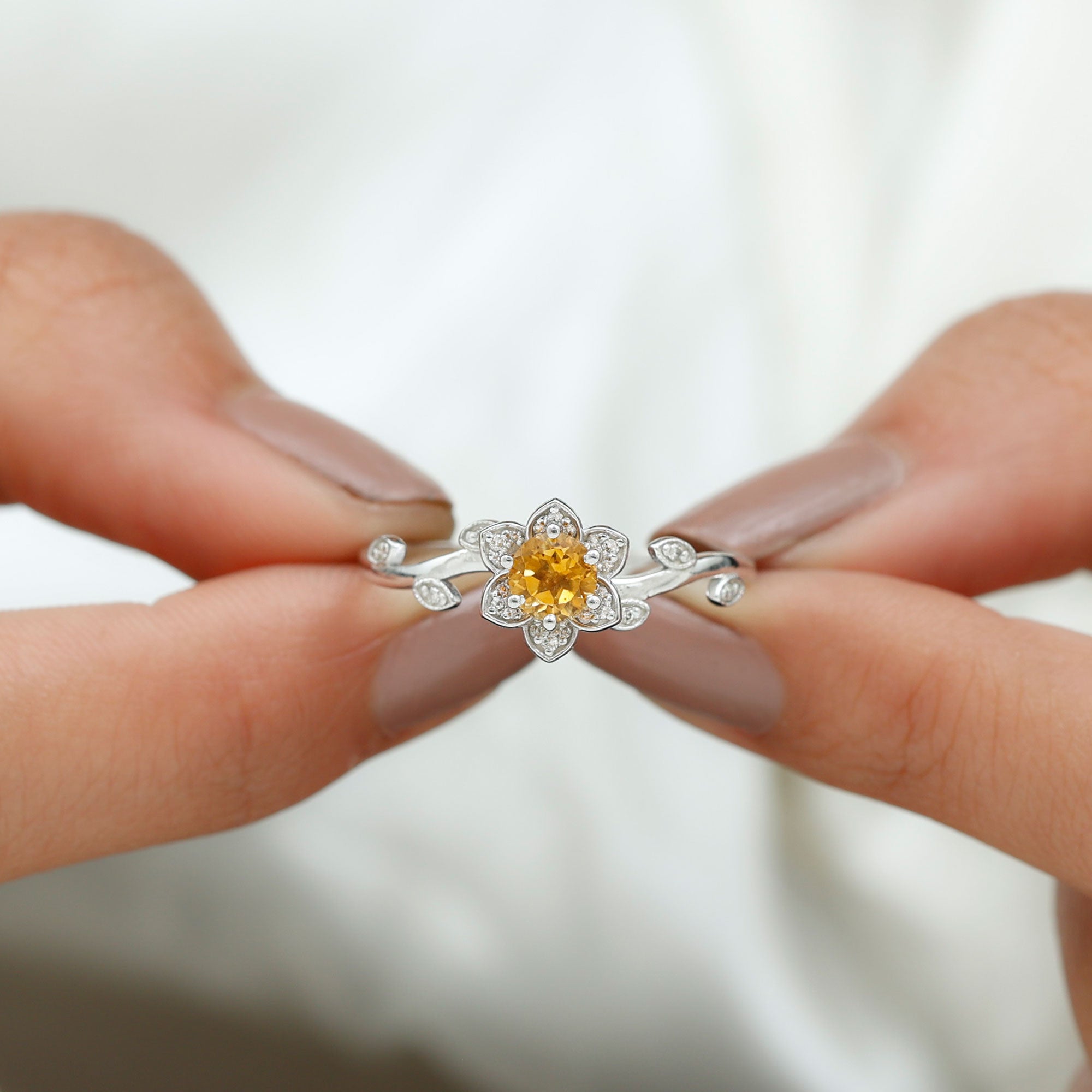 Experience the beauty of nature with this enchanting Nature Inspired Ring. A Round Shape Citrine Solitaire sits at the center, surrounded by petals adorned with Round Shape Diamond, creating a stunning floral design. The Metal Leaf design is further accentuated with additional Diamond, adding to its allure. Embrace the elegance and charm of this exquisite ring, a perfect choice for nature lovers and those who appreciate unique and captivating designs.