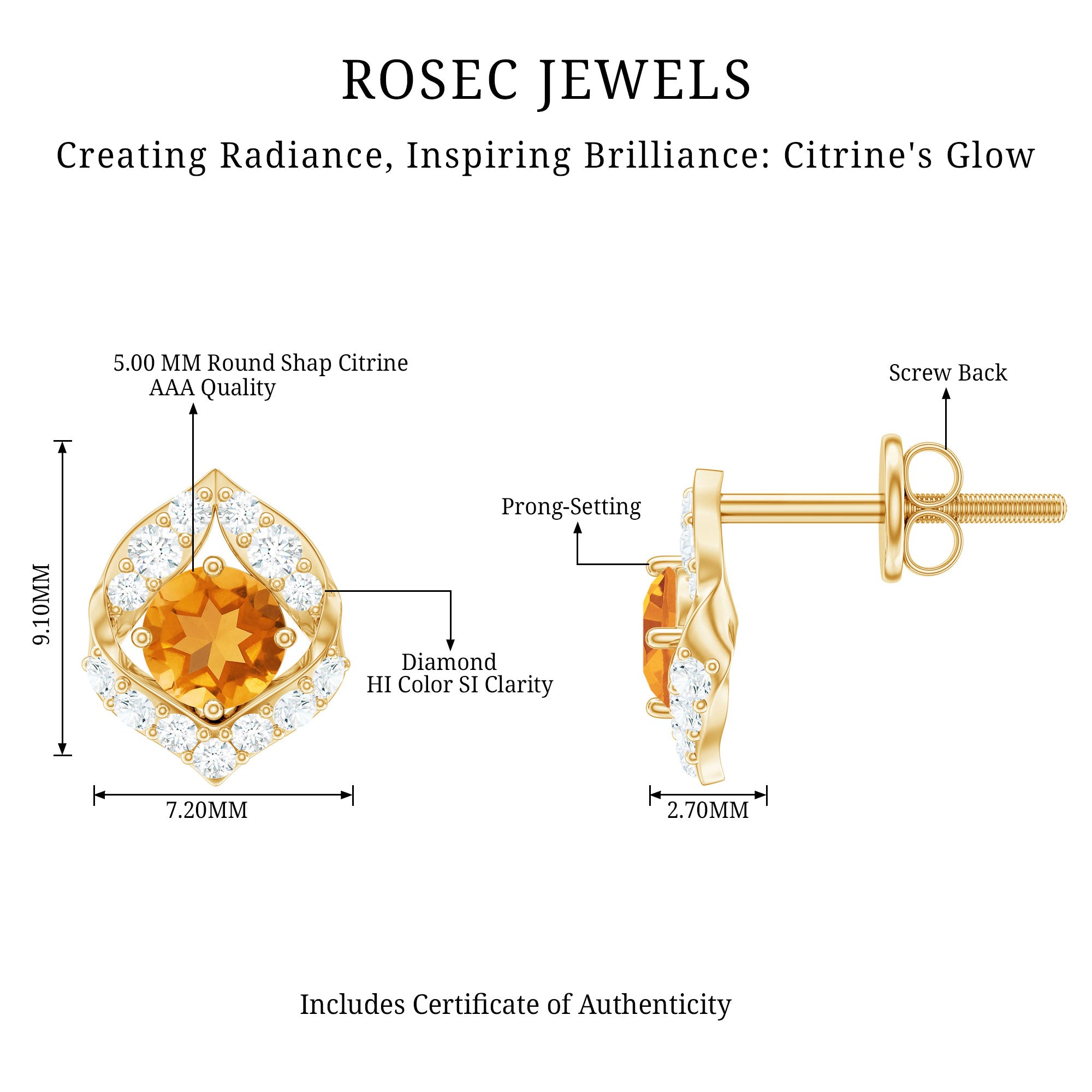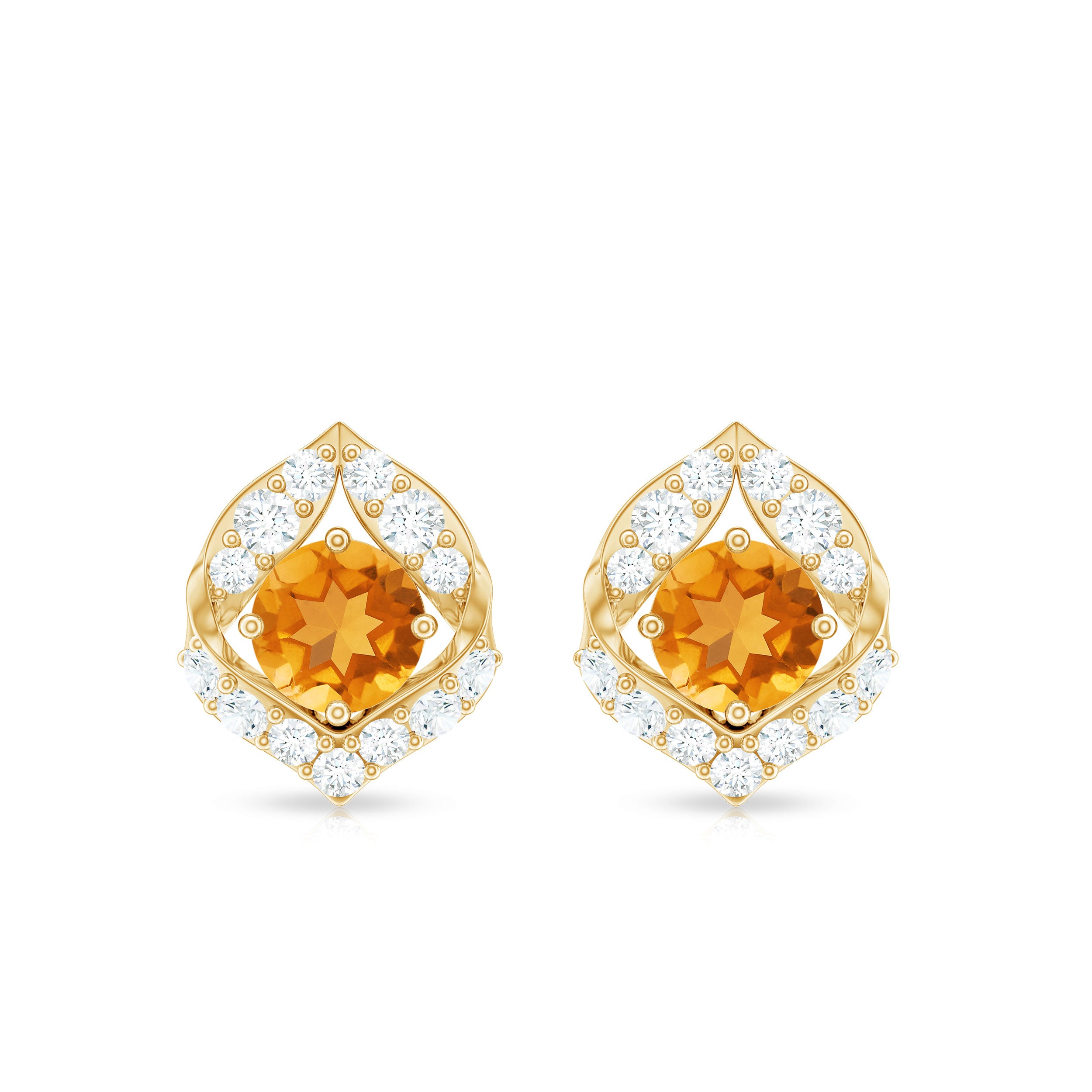 Indulge in a touch of nature inspired elegance with these adorable Leaf Earrings, a stunning blend of warm color, delicate sparkle and graceful design. At the center of each Leaf motif sits a 5 mm Round Shape Citrine set in Prong Setting, glowing with a golden hue that instantly brightens your look. Surrounding it, dainty Diamond stones are studded over the leaf motif, adding a soft shimmer that brings the entire design to life. The combination feels fresh and feminine, perfect for those who love jewelry that reflects the charm of the natural world. Crafted with Secure Screw Back Closure, these Citrine Stud Earrings stay comfortably in place whether you are heading to brunch, a special event or simply elevating your everyday style. They pair effortlessly with flowy dresses and elegant casual outfits, making them a versatile addition to any jewelry collection. These Real Citrine Diamond Earrings arrive in a signature jewelry box, ready to gift and guaranteed to make a memorable impression. Ideal for birthdays, holidays, anniversaries or a thoughtful surprise, these November Birthstone Citrine Studs offer a unique blend of sophistication and the beauty of nature. A perfect choice for anyone who wants to carry a little sunshine and sparkle wherever they go.