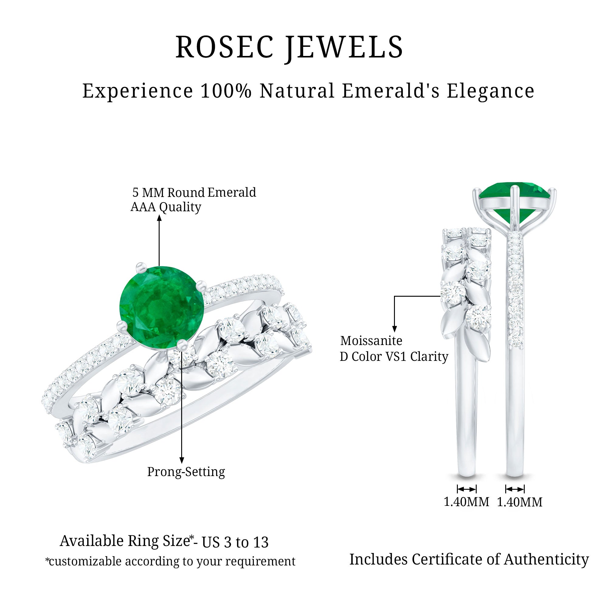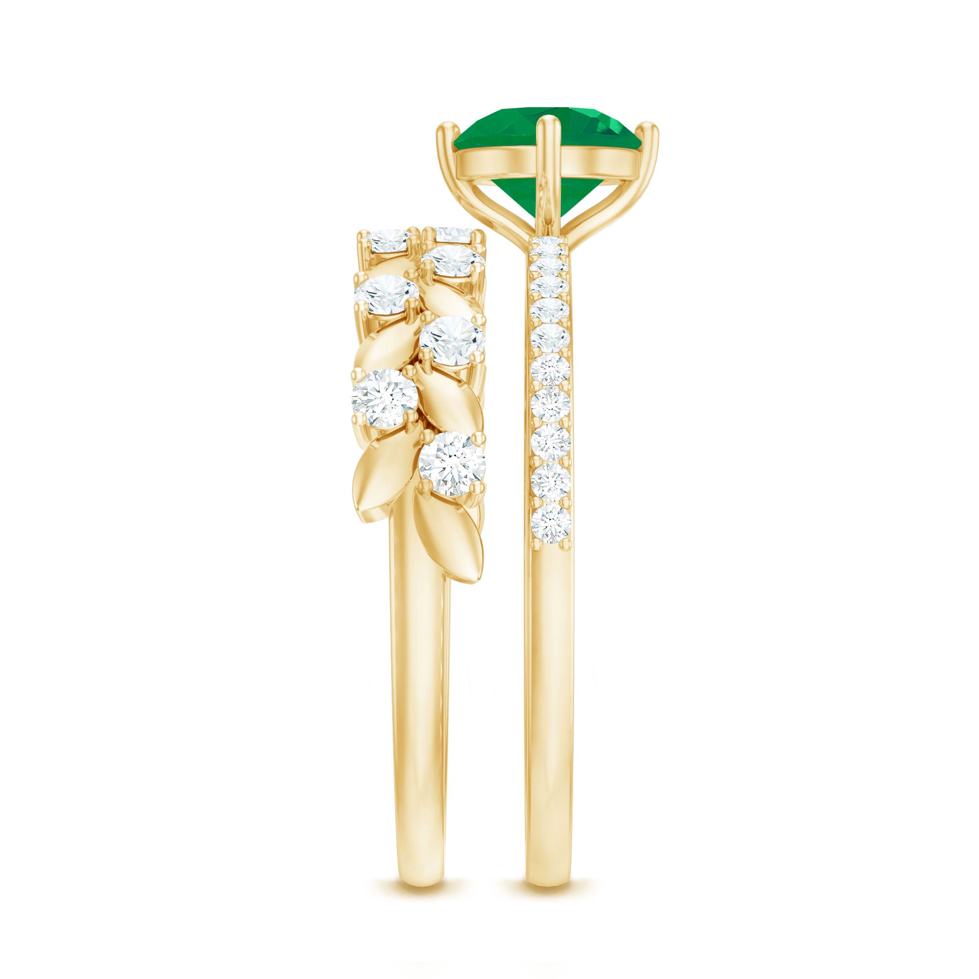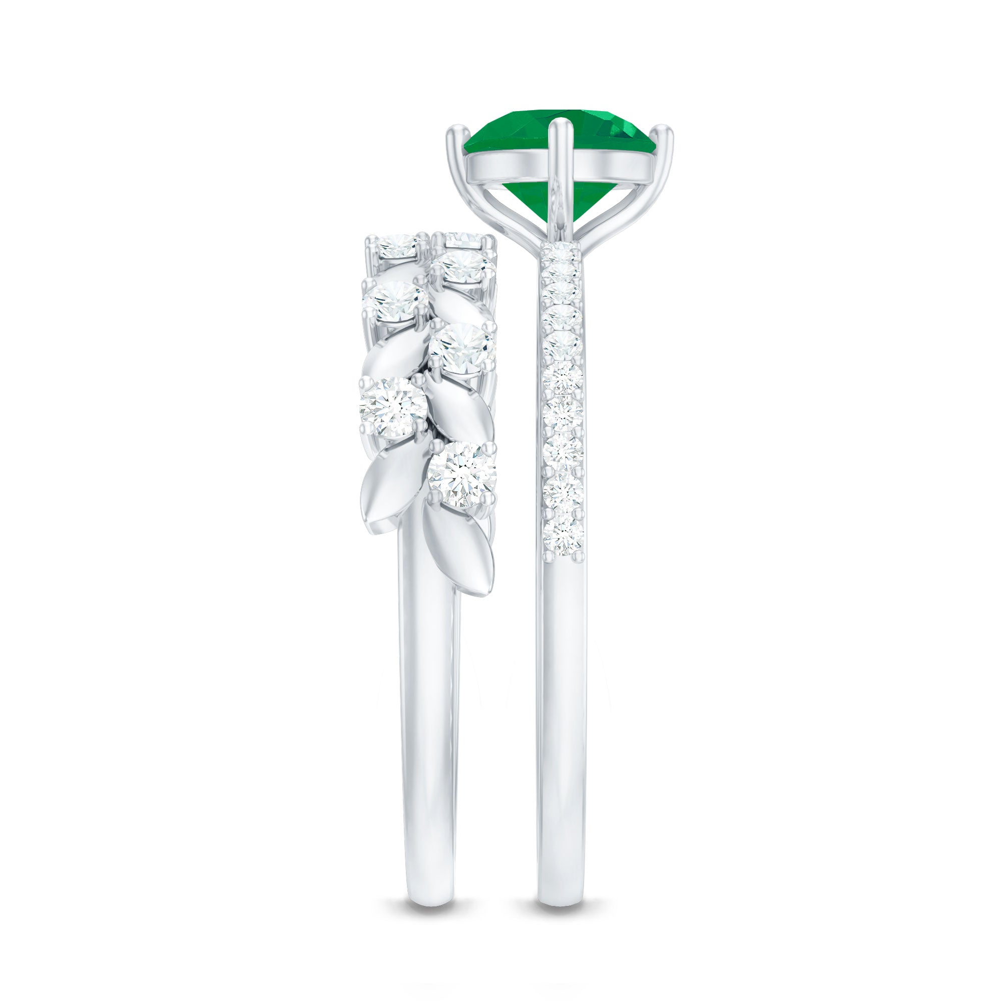 Let your love bloom with this exquisite Wedding Bridal Ring Set, a breathtaking duo that beautifully captures the spirit of romance and renewal. The Solitaire Engagement Ring showcases a 5 mm Round Shape Emerald center stone, glowing with rich green hues that symbolize harmony and everlasting devotion. Flanked by shimmering Moissanite side stones, it sparkles with the promise of a love that only grows stronger with time. Complementing it is the matching Wedding Band, a delicate work of art adorned with Leaf motifs and dazzling Moissanite stones, designed to mirror the graceful beauty of nature itself. Together, this Emerald Engagement Ring with Wedding Band creates a stunning harmony, where elegance meets artistry. Each curve, sparkle and leaf reflects the intertwining journey of two souls becoming one. Presented in an elegant jewelry box and available in a variety of sizes, this Emerald Wedding Ring Set is a celebration of love that feels everlasting. Perfect for the bride who finds magic in every detail, this ring set captures the essence of forever.