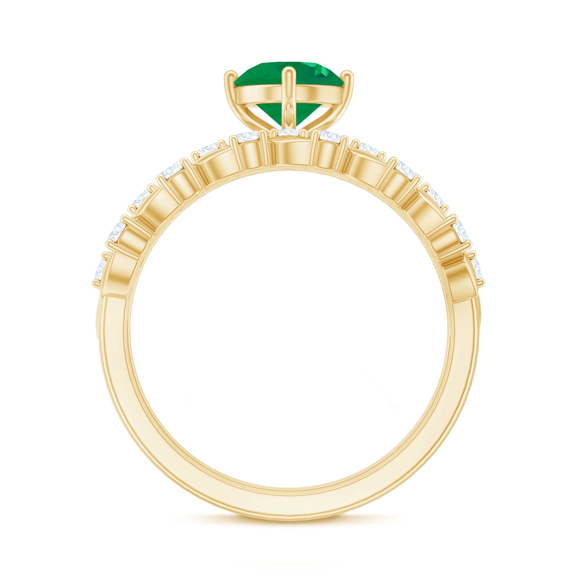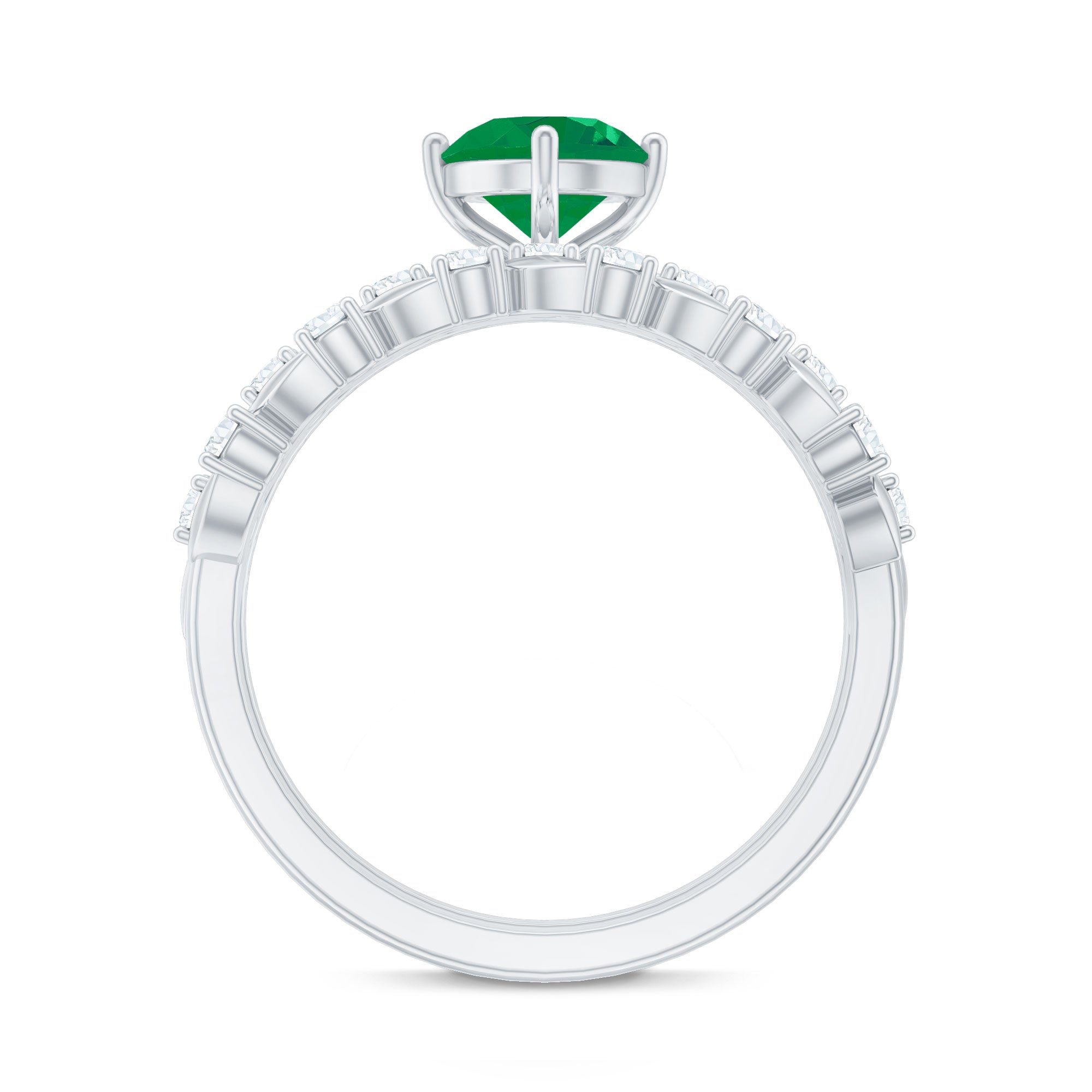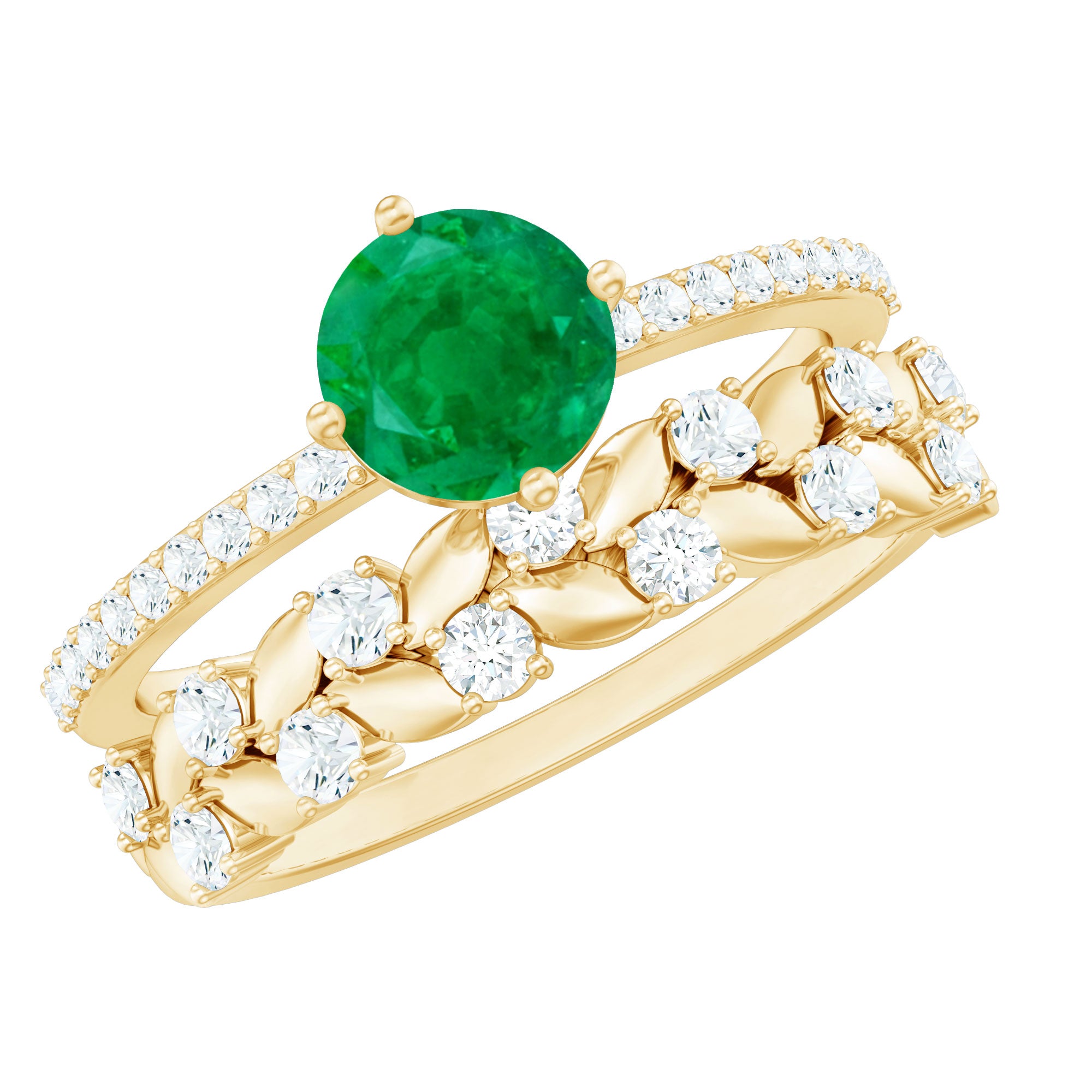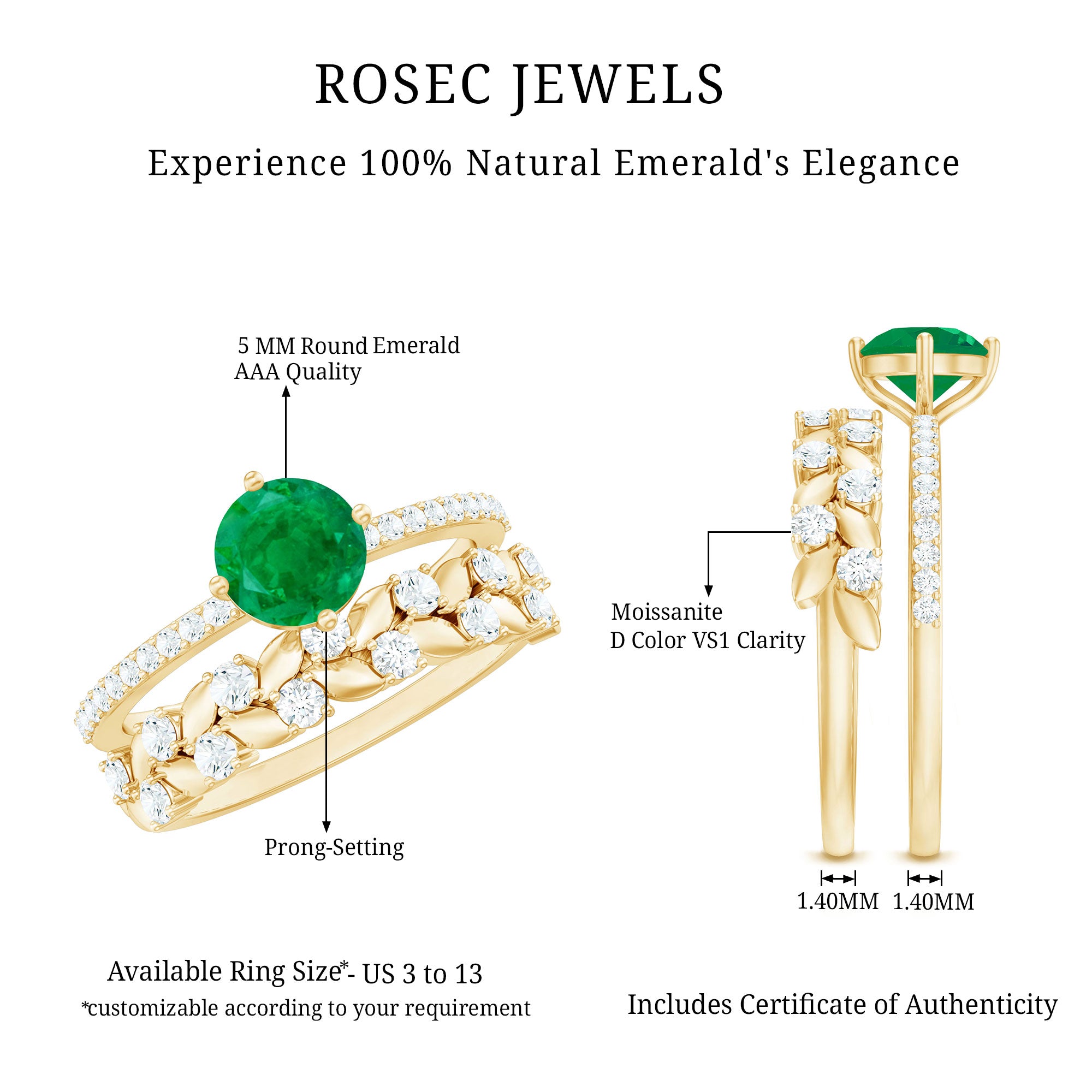 Let your love bloom with this exquisite Wedding Bridal Ring Set, a breathtaking duo that beautifully captures the spirit of romance and renewal. The Solitaire Engagement Ring showcases a 5 mm Round Shape Emerald center stone, glowing with rich green hues that symbolize harmony and everlasting devotion. Flanked by shimmering Moissanite side stones, it sparkles with the promise of a love that only grows stronger with time. Complementing it is the matching Wedding Band, a delicate work of art adorned with Leaf motifs and dazzling Moissanite stones, designed to mirror the graceful beauty of nature itself. Together, this Emerald Engagement Ring with Wedding Band creates a stunning harmony, where elegance meets artistry. Each curve, sparkle and leaf reflects the intertwining journey of two souls becoming one. Presented in an elegant jewelry box and available in a variety of sizes, this Emerald Wedding Ring Set is a celebration of love that feels everlasting. Perfect for the bride who finds magic in every detail, this ring set captures the essence of forever.