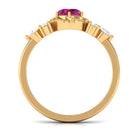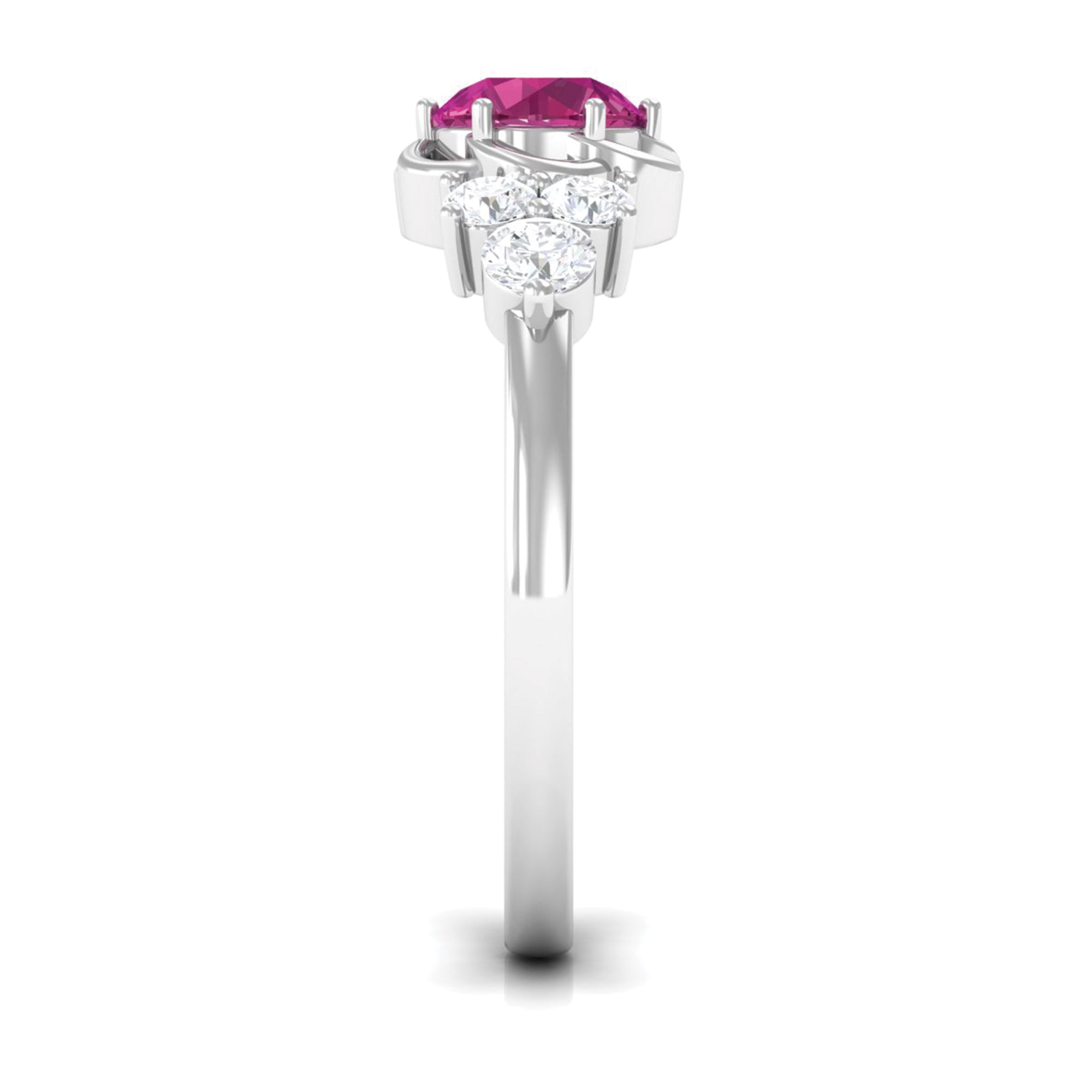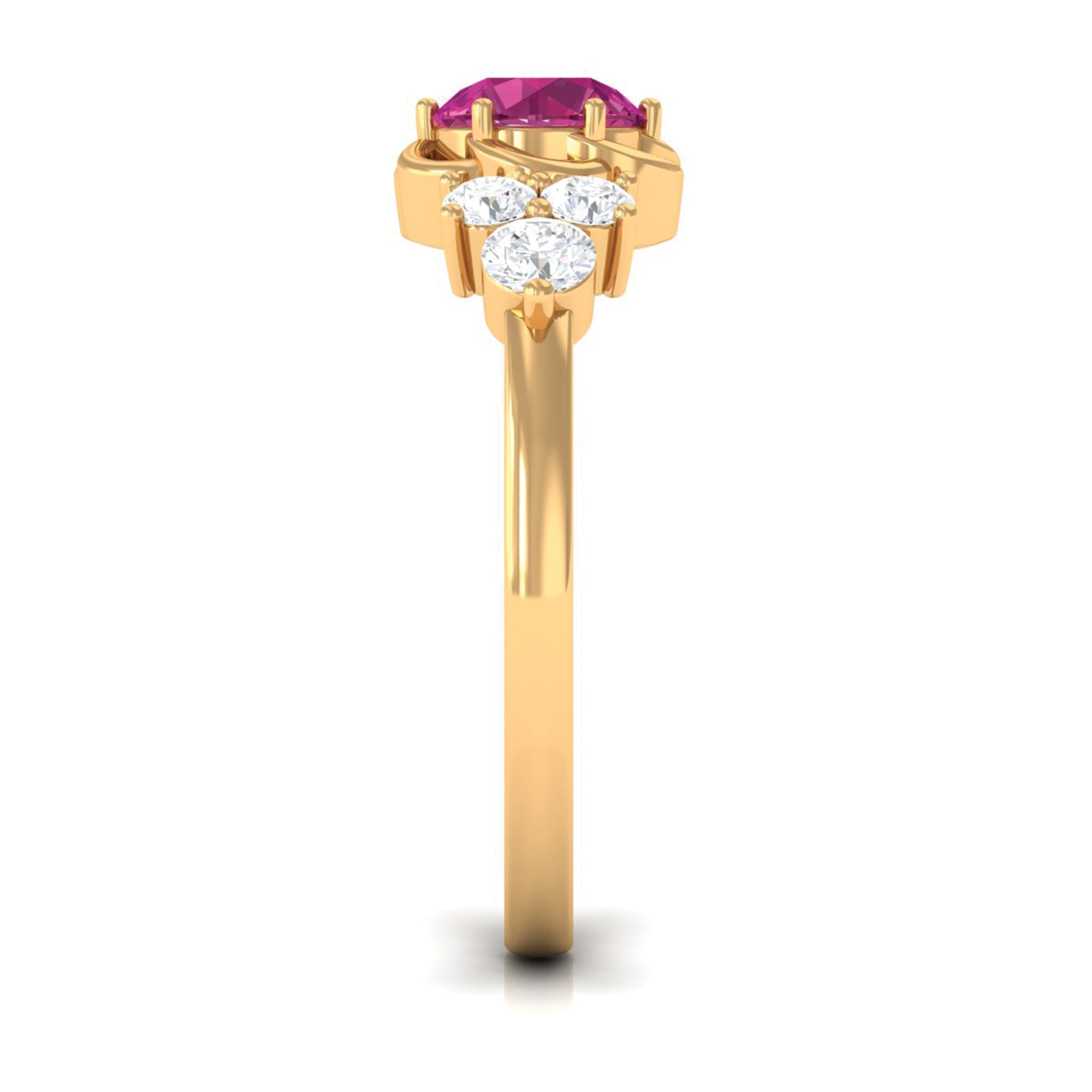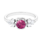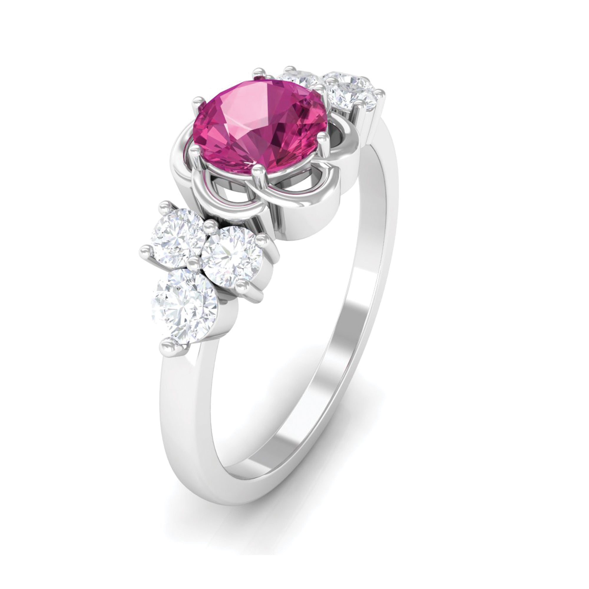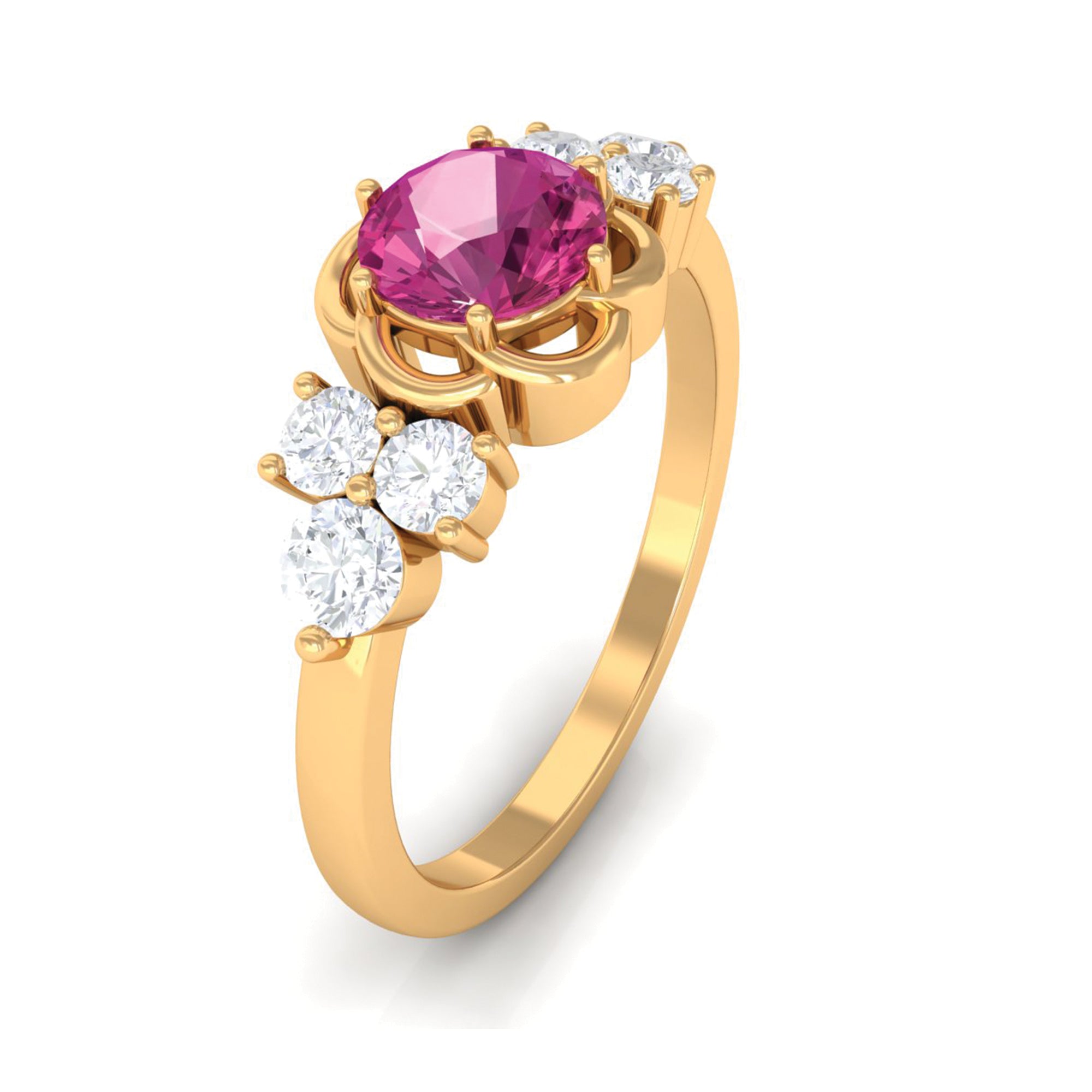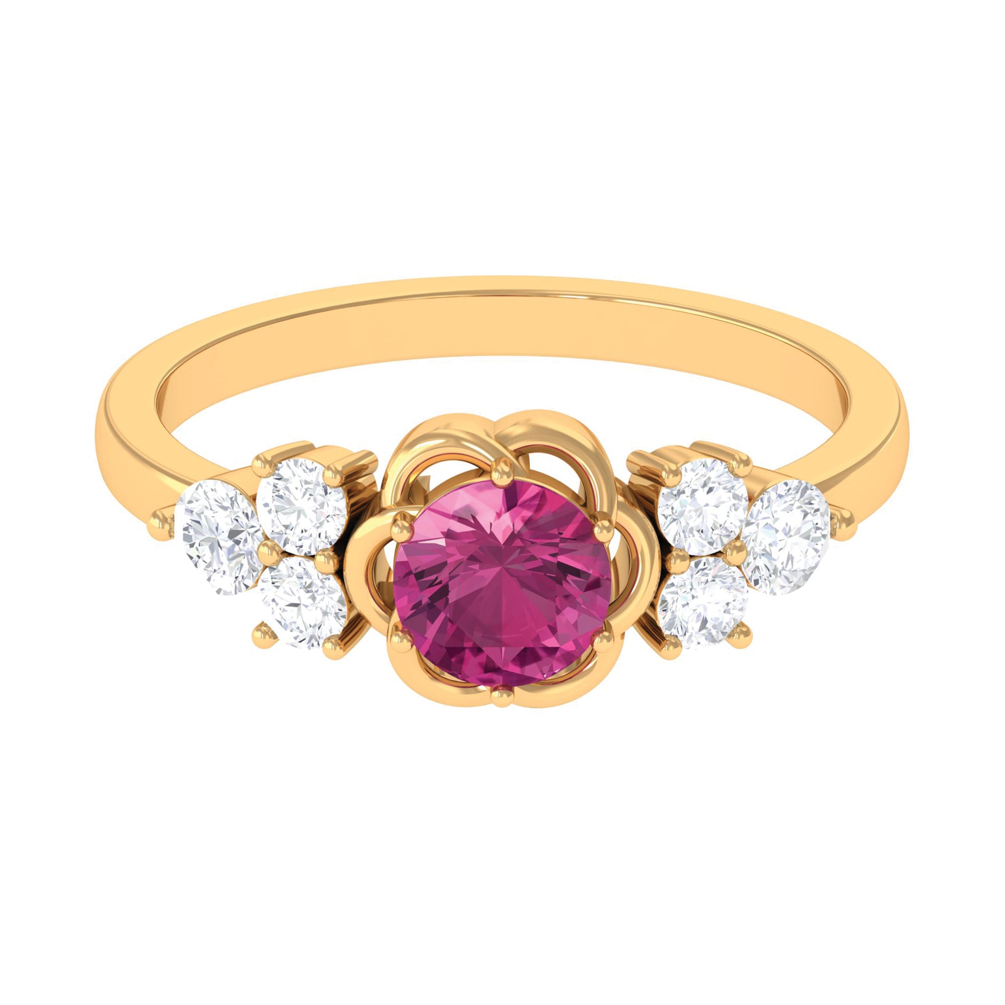 A masterpiece of nature-inspired design, this Floral Ring showcases the delicate beauty of Pink Tourmaline and Diamond. A 5 MM Round Shape Pink Tourmaline gemstone is set above the flower design, accentuated by a Trio of Diamond gemstones set on both sides of the Flower. This ring harmoniously blends natures grace with luxurious sparkle, making it a unique and enchanting symbol of your love and connection to the beauty of the world.