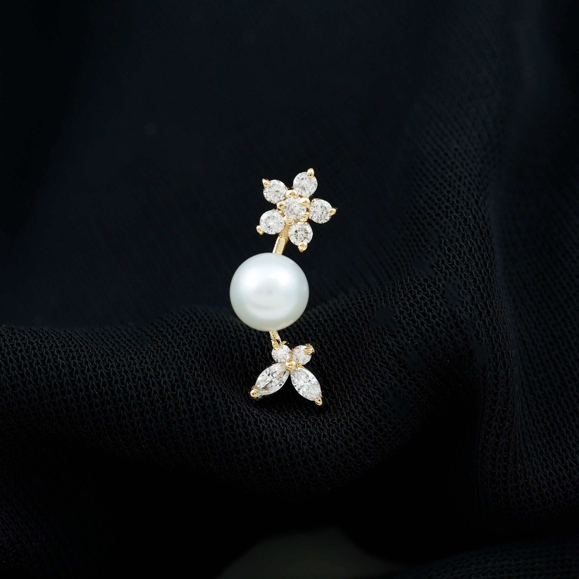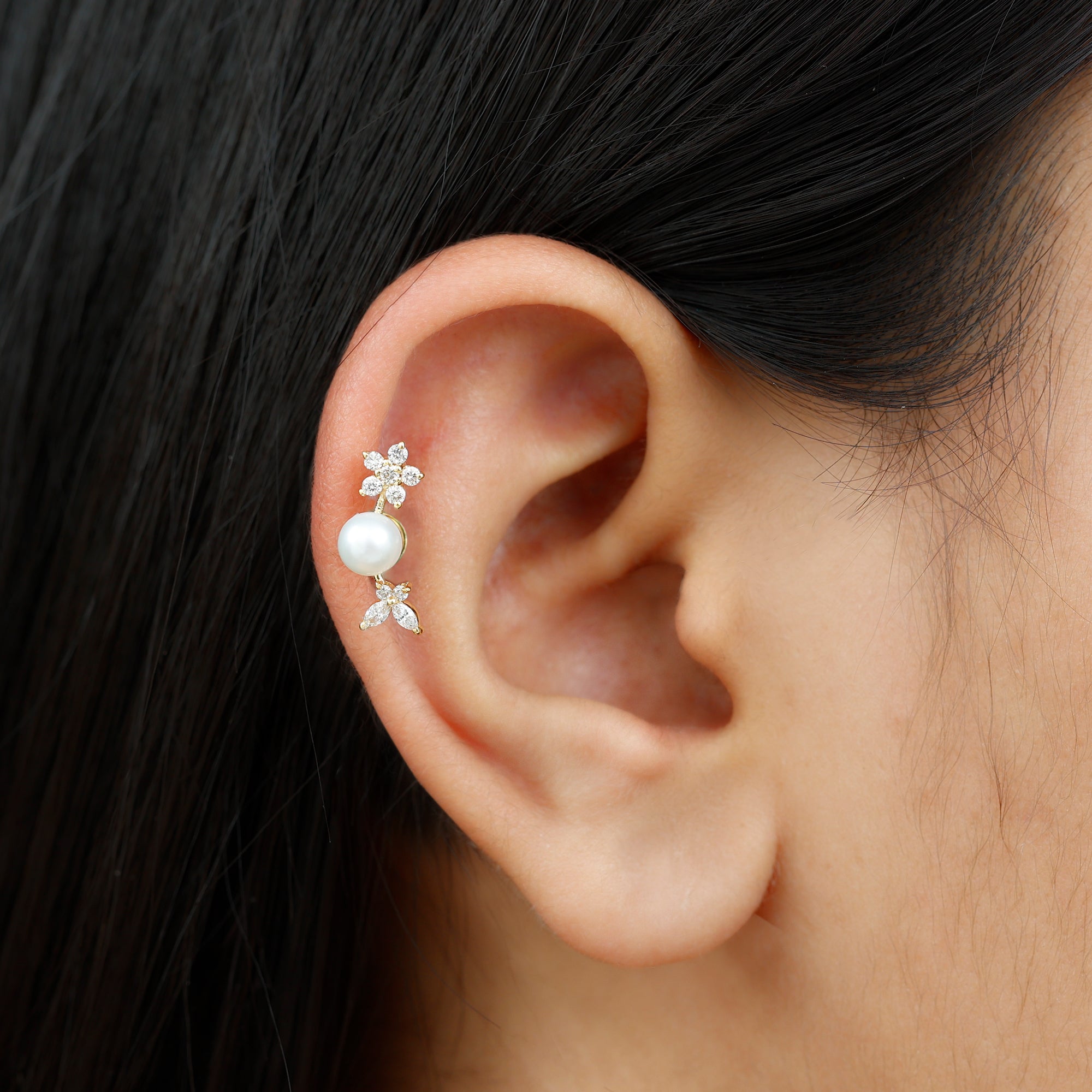 Make a stunning impression with this Climber Earring, boasting an elegant design that is sure to turn heads. Composed of Gold and adorned with a Round Shape Freshwater Pearl and Round Cut Moissanites set in Prong Setting, this Cartilage Earring is perfect for adding a touch of glamour to your Helix Piercing. You can also wear this versatile Body Jewelry as a Cartilage, Helix, or Conch Piercing.