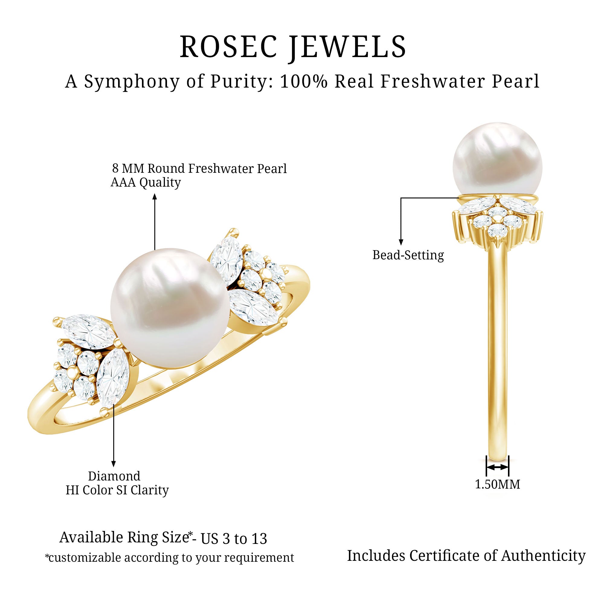 Wrap your fingers in the elegance of nature by slipping on this nature-inspired Freshwater Pearl Solitaire Ring! The Single Stone of 8 MM Round Shape Freshwater Pearl serves as the ultimate show-stopper in this design and its grace is best brought out by the side-stones of Diamond that playfully bloom in a floral-inspired motif. Delicate with a sprinkle of whimsical, this Certified Pearl Ring ticks all the right boxes.