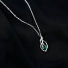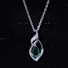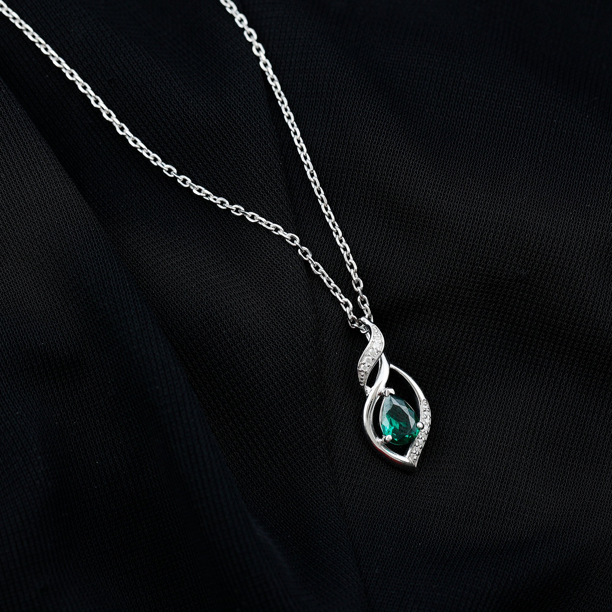 Our Lab Grown Emerald Necklace is a perfect fusion of timeless elegance and the beauty of nature, offering a sophisticated appearance with its lasting allure. Made from white gold plated silver, this Leaf Necklace showcases a style and beauty that will endure through the ages. With meticulous attention to detail, this Drop Necklace features a 5X7 MM pear brilliant cut lab created emerald set in a prong setting at the center of a leaf motif, which is partially embellished with delicate moissanite stones. Enhance your style with the stunning mix of deep green tones and brilliant sparkle, making this Designer Emerald Necklace an ideal and glamorous accessory for any significant occasion or daily luxury. It is suspended from a fine yet sturdy chain, a timeless piece that will be treasured for years to come. Enjoy the enchanting elegance of this beautiful accessory that captivates with its charming presence. Elevate your outfit with this classic piece that boasts AAAA quality lab made emerald and D-VS1 quality moissanite, radiating brilliance.