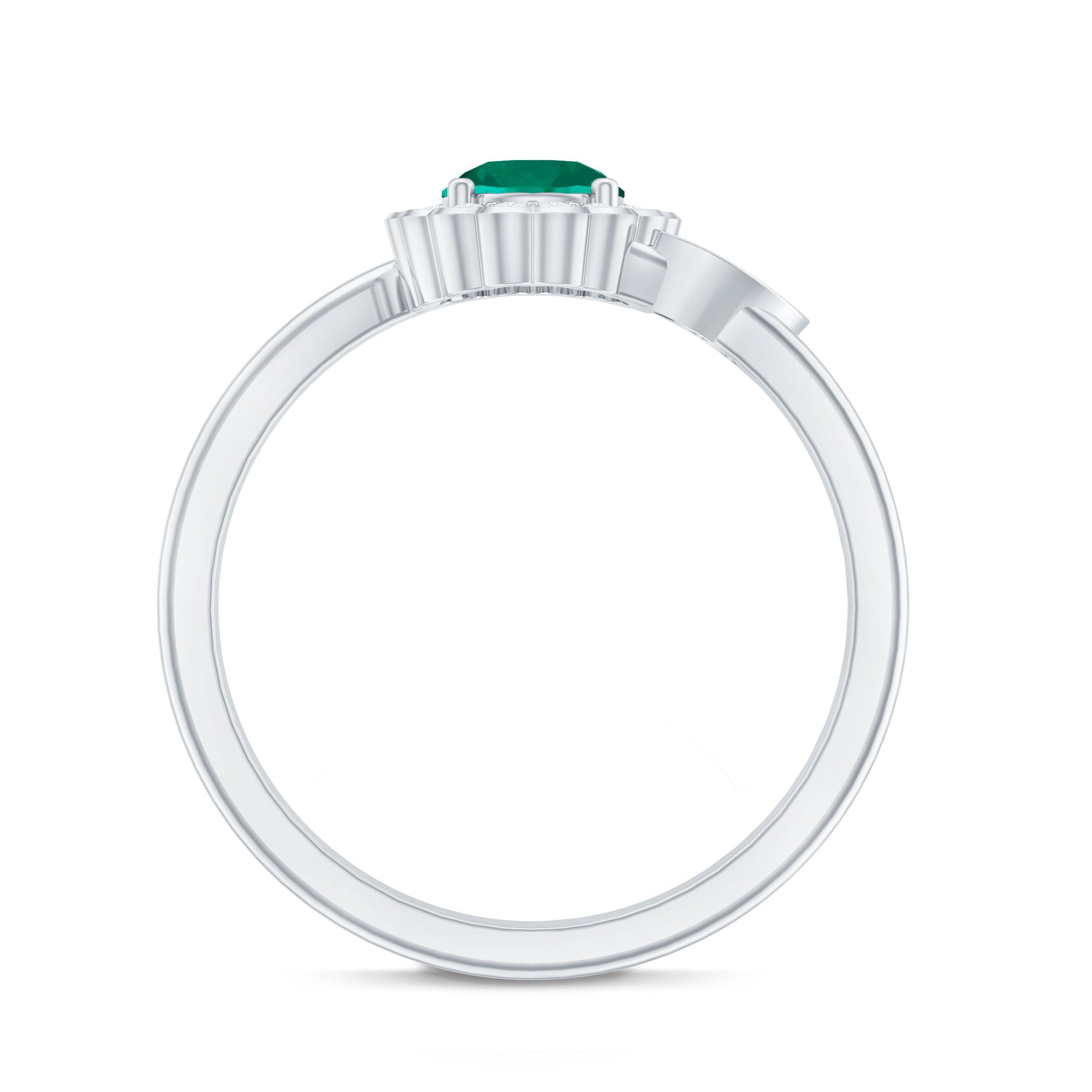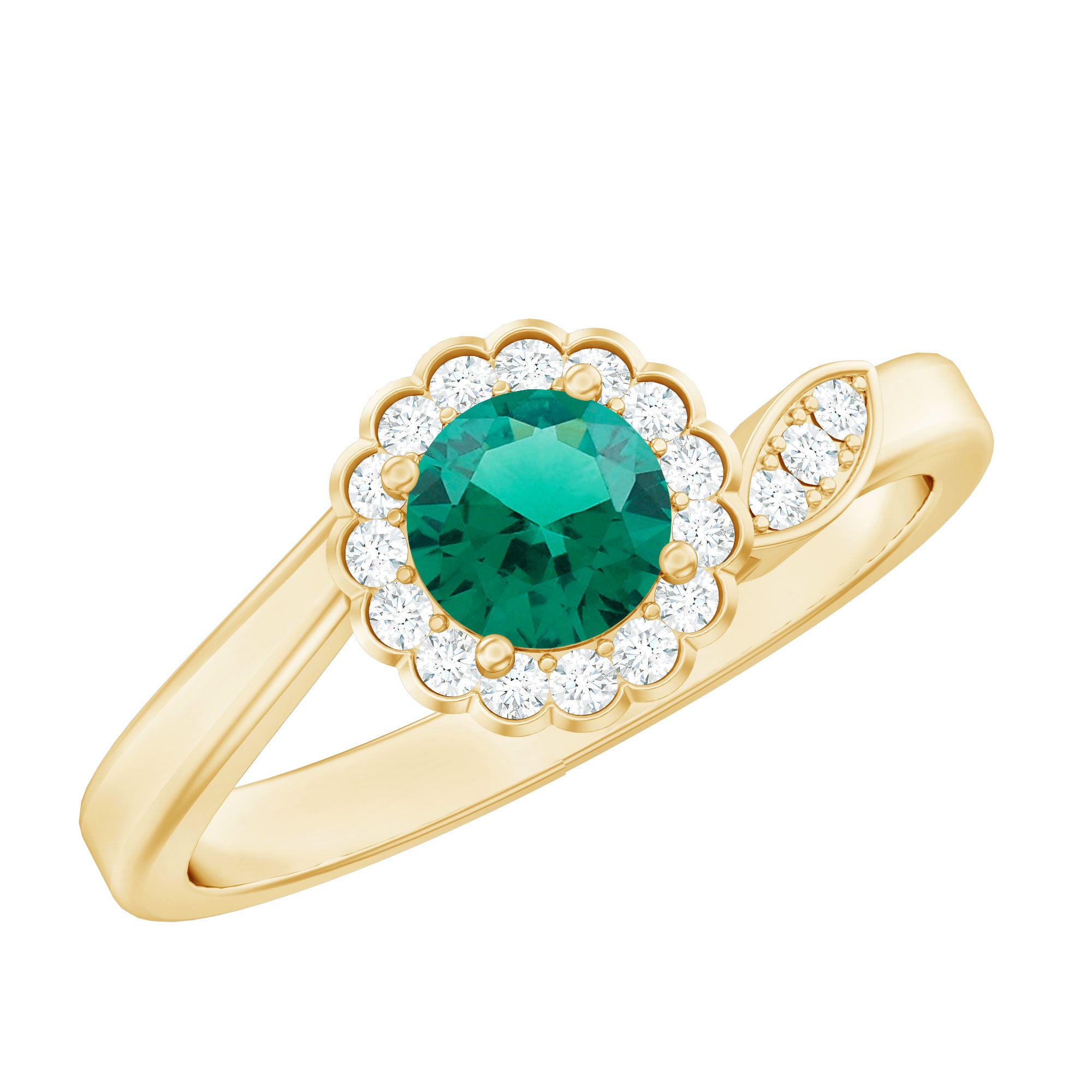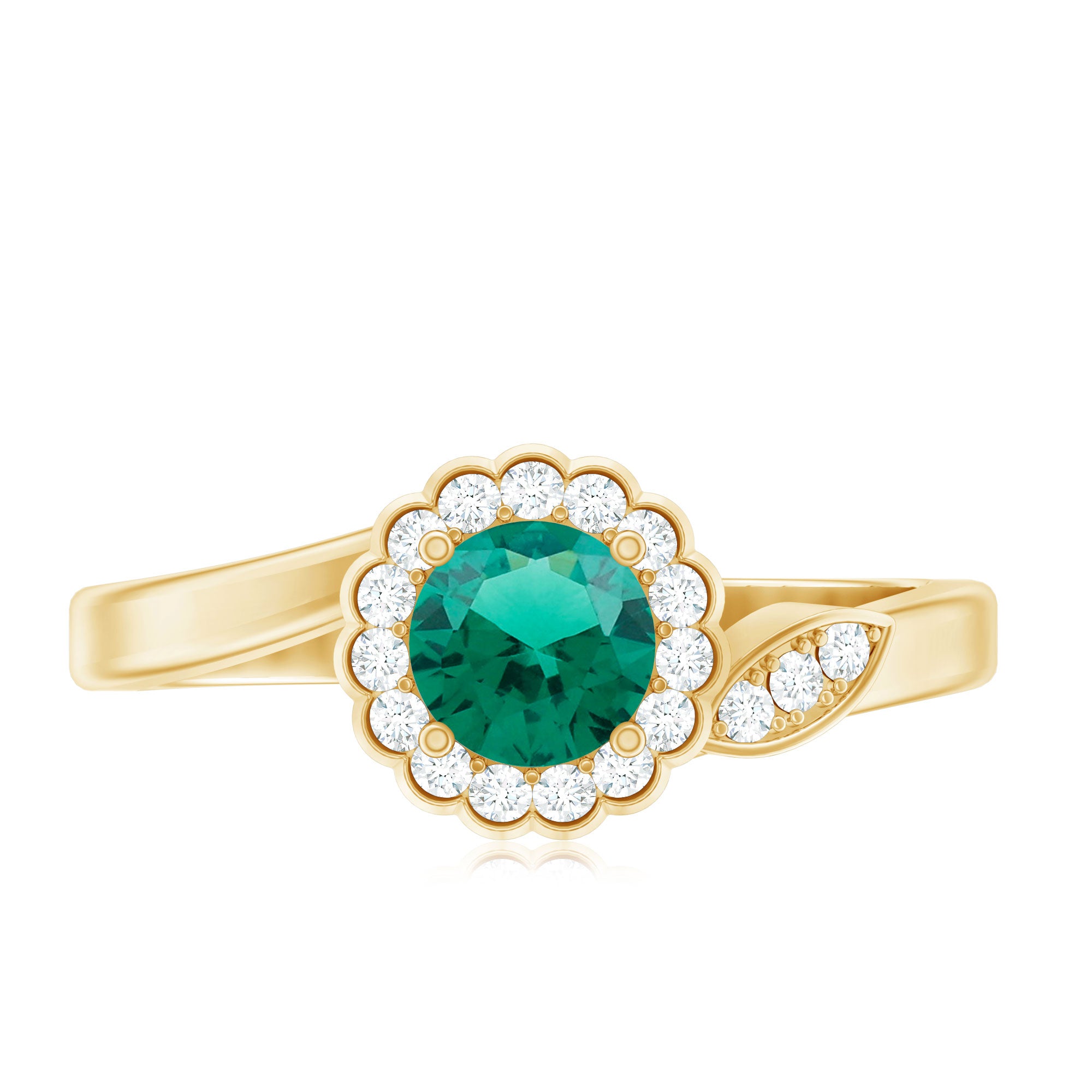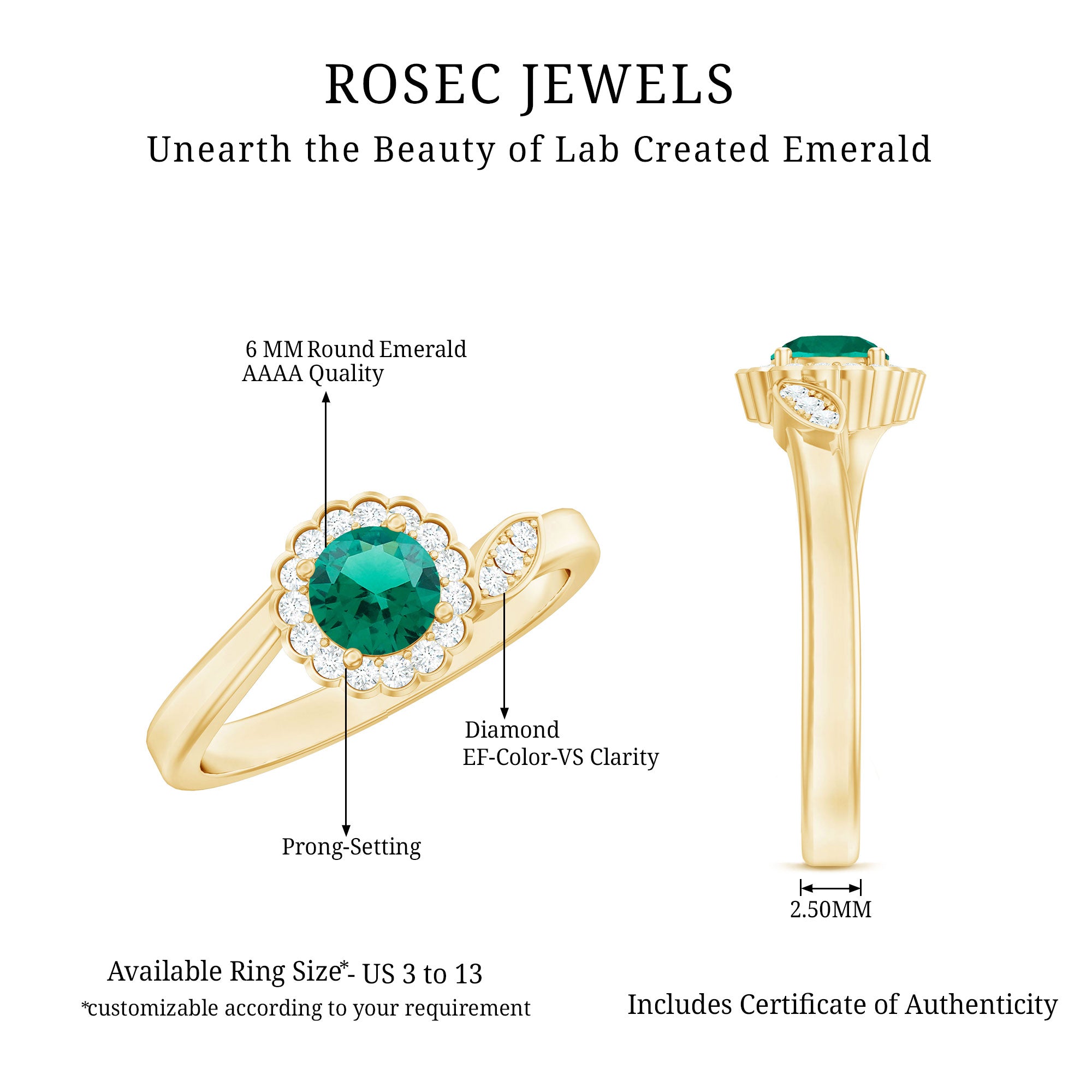 Elevate your promise with our Nature Inspired Promise Ring, a vision of elegance with a brilliant 6 mm Round Shaped Lab Created Emerald as the centerpiece. Encircled by a sparkling Lab Grown Diamond Floral Halo and adorned with a subtle leaf motif on the bypass shank, this Emerald Diamond Ring seamlessly blends natures beauty with modern minimalism. Meticulously crafted by Rosec Jewels, it stands as a testament to eco-conscious luxury, offering a conflict-free alternative that symbolizes your commitment in a uniquely captivating way.