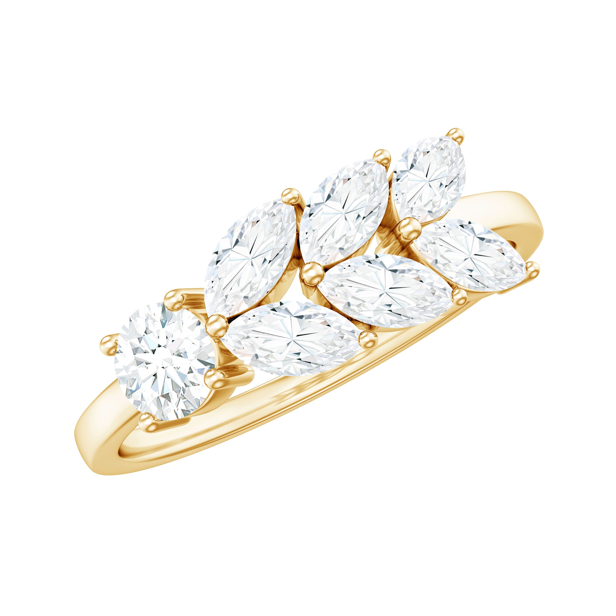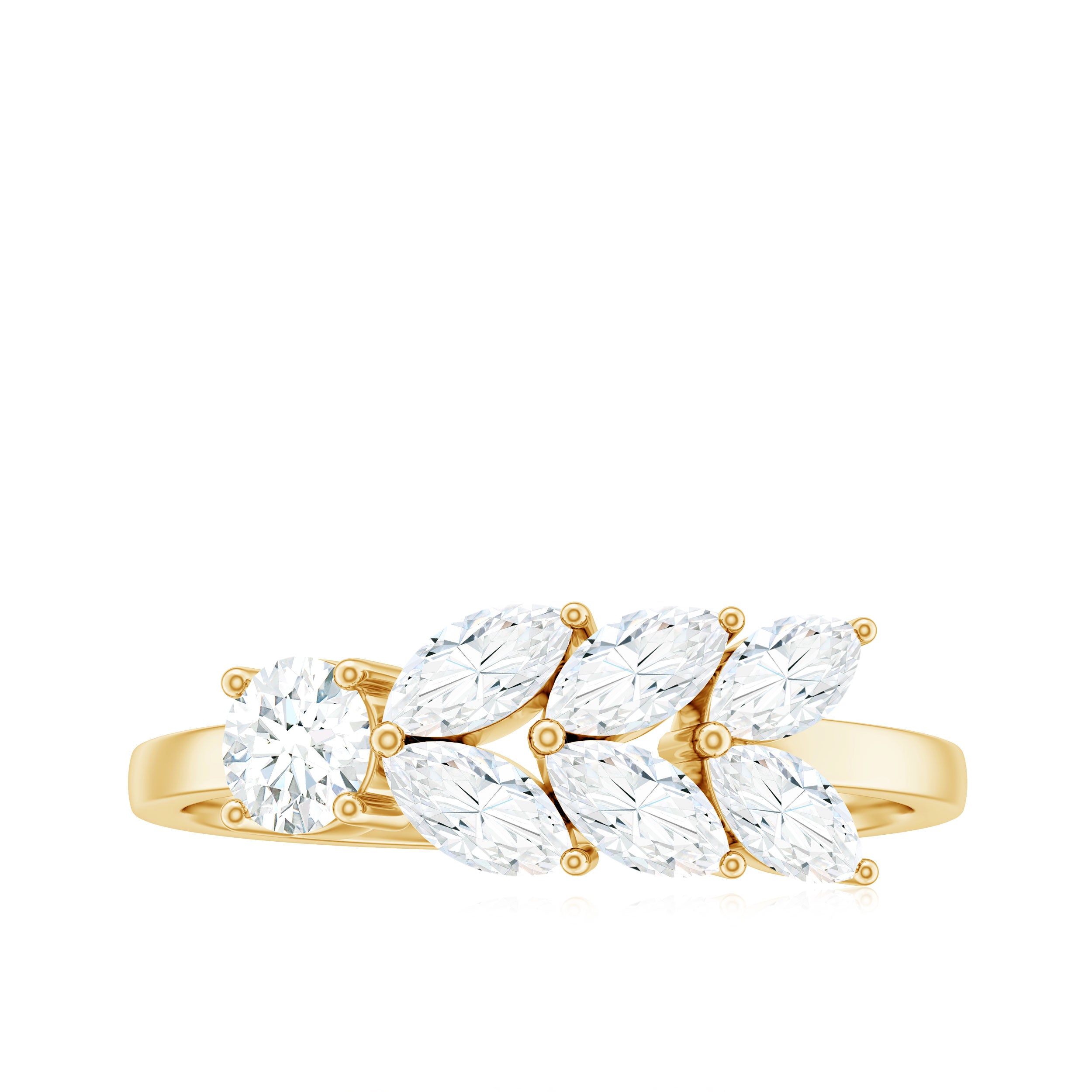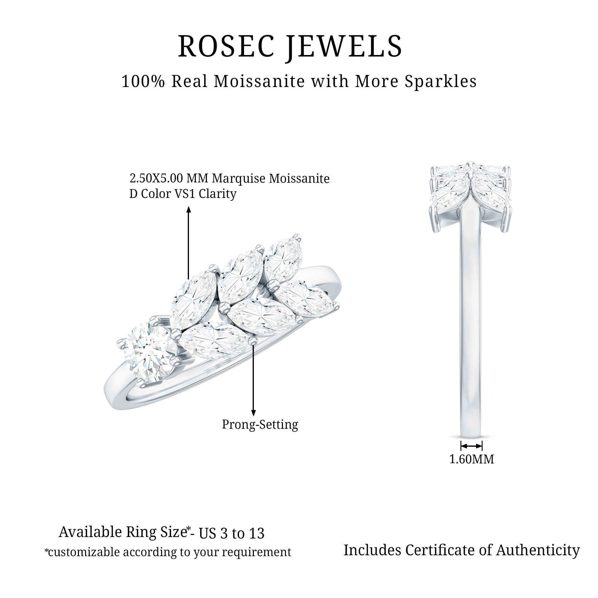 Inspired by the beauty of nature, this Moissanite Anniversary Ring is a perfect way to celebrate your journey. It features a 4 MM round shaped moissanite that sparkles brightly with every move. With D color and VS1 clarity, the stone offers clear brilliance and a glow that is hard to miss. Adding a special touch, a trail of marquise cut moissanite stones flows gently along one side of the Nature Inspired Ring, forming a leaf-like pattern that gives the ring a fresh, natural look. Each stone is set in prong setting, giving the design a detailed and secure finish. This nature inspired design reflects love that grows over time, beautiful, strong, and full of life. Whether you are marking an anniversary, a special milestone, or simply want to gift something meaningful, this Leaf Ring is a lovely choice. The band is simple and smooth, letting the moissanite stones stand out. It is designed to be comfortable enough for everyday wear, yet still special enough to stand out during important moments. Carefully handcrafted with attention to detail, this 10 Year Anniversary Ring blends elegance with natural beauty. It comes in a lovely jewelry box, ready to be gifted and cherished.