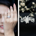 Directly picked from the garden of gemstones, this Moissanite Engagement Ring will definitely win her heart with its nature-inspired beauty. An Oval Shaped Moissanite is set in between floral leaf branch studded with petite round gemstones, seems like flower and leaves are covering the finger. The ring is crafted with 14K White Gold Plated Silver, featuring a 6X8 MM Oval Shape Moissanite securely placed in Prong Setting. This Flower Engagement Ring holds an adorable shine of D-VS1 Quality, which makes it perfect for the big day. This Nature Inspired Ring will be delivered to you in a velvet pouch with the certificate of authenticity.