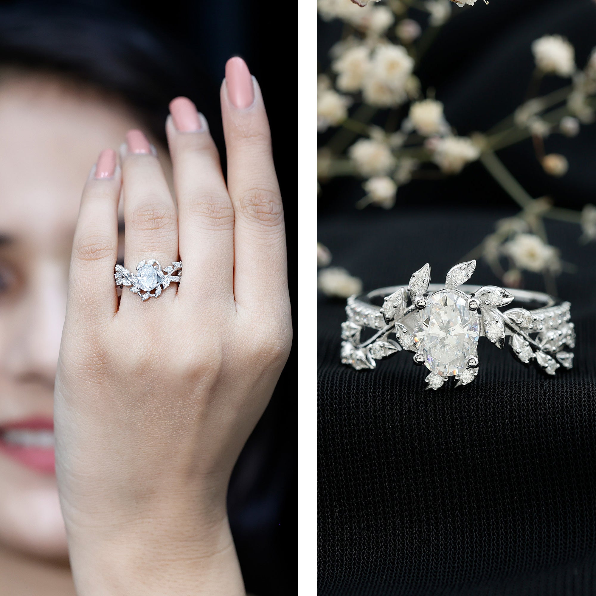 Nature Inspired Moissanite Oval Engagement Ring in Silver