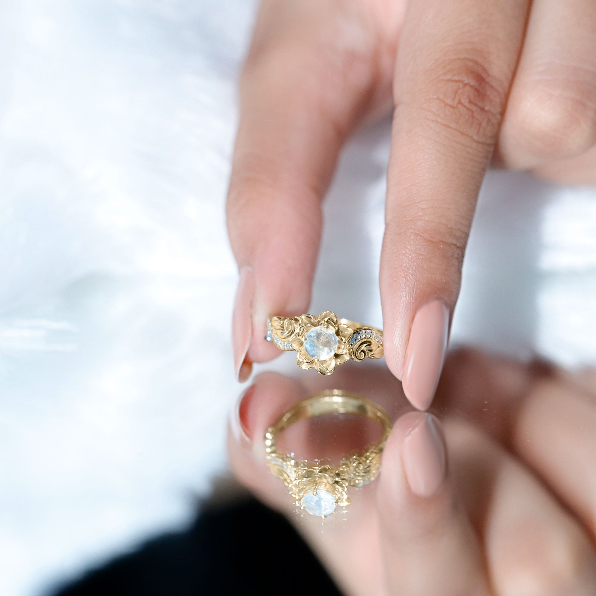 Let your love story blossom with the soft glow of this Flower Engagement Ring, a symbol of beauty, grace, and a forever bond. At the heart of this nature-inspired piece lies a 5 MM Round Shape Moonstone of AAA quality in secure prong setting. Crafted in 14k white gold plated silver to resemble a blooming rose flower, the band features delicate petal-like textures and is adorned with EF-VS quality lab grown diamonds, adding a gentle sparkle to the overall design. This Moonstone and Diamond Ring captures the essence of natures romantic beauty while embracing ethical craftsmanship. Ideal for anyone who loves vintage or nature-inspired styles, this Moonstone Engagement Ring is a beautiful tribute to a love that is soft yet strong, delicate yet enduring. It is the perfect promise ring, engagement ring, or special gift for a June-born loved one. Available in US sizes 3 to 13, this Rose Engagement Ring comes nestled in a signature jewelry box and includes a gemstone certificate for authenticity. Let the magic of a moonstone and the symbolism of a blooming rose make your proposal unforgettable, because some love stories are best told through nature’s most beautiful designs.