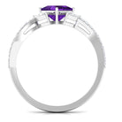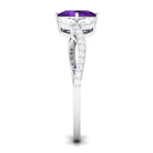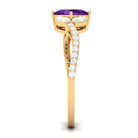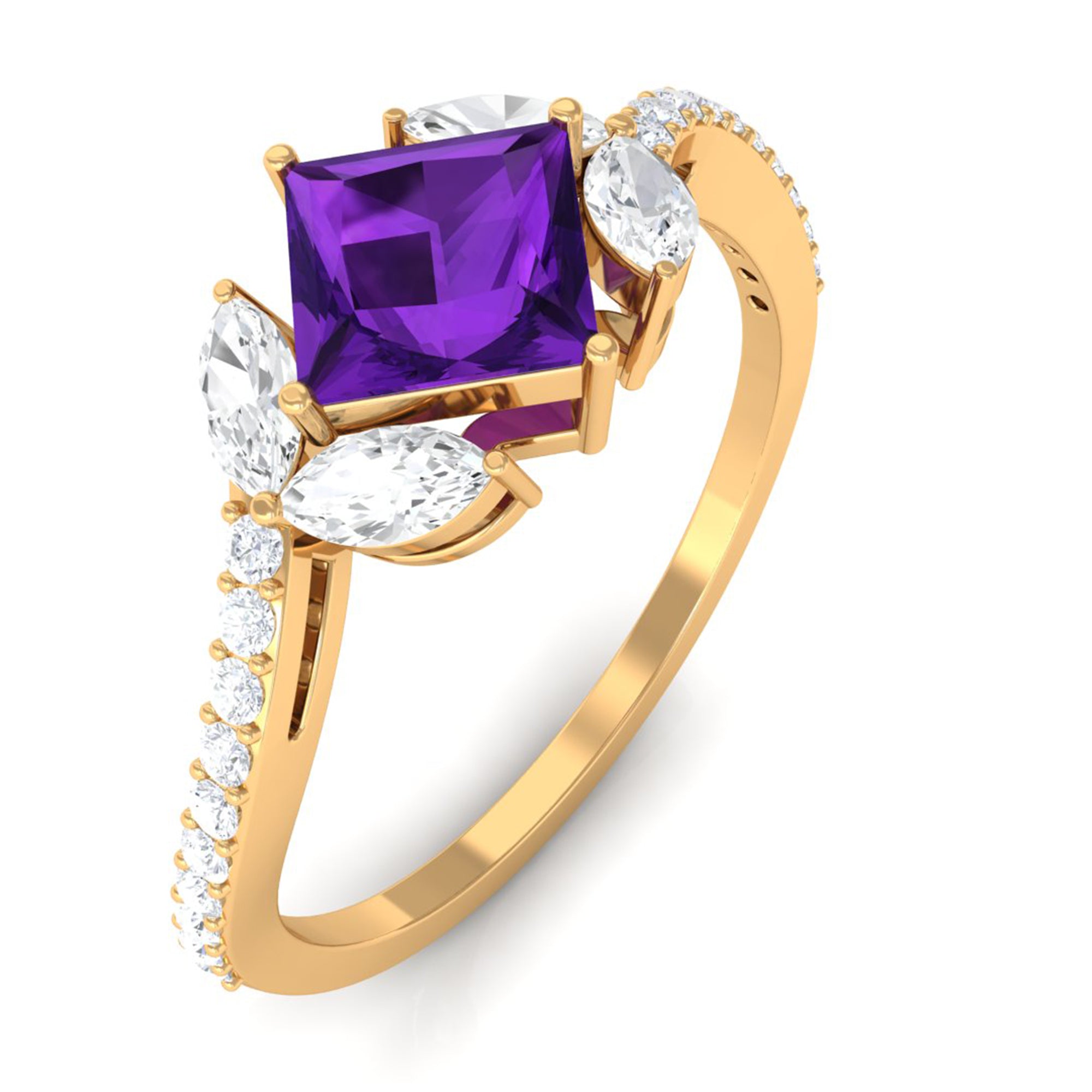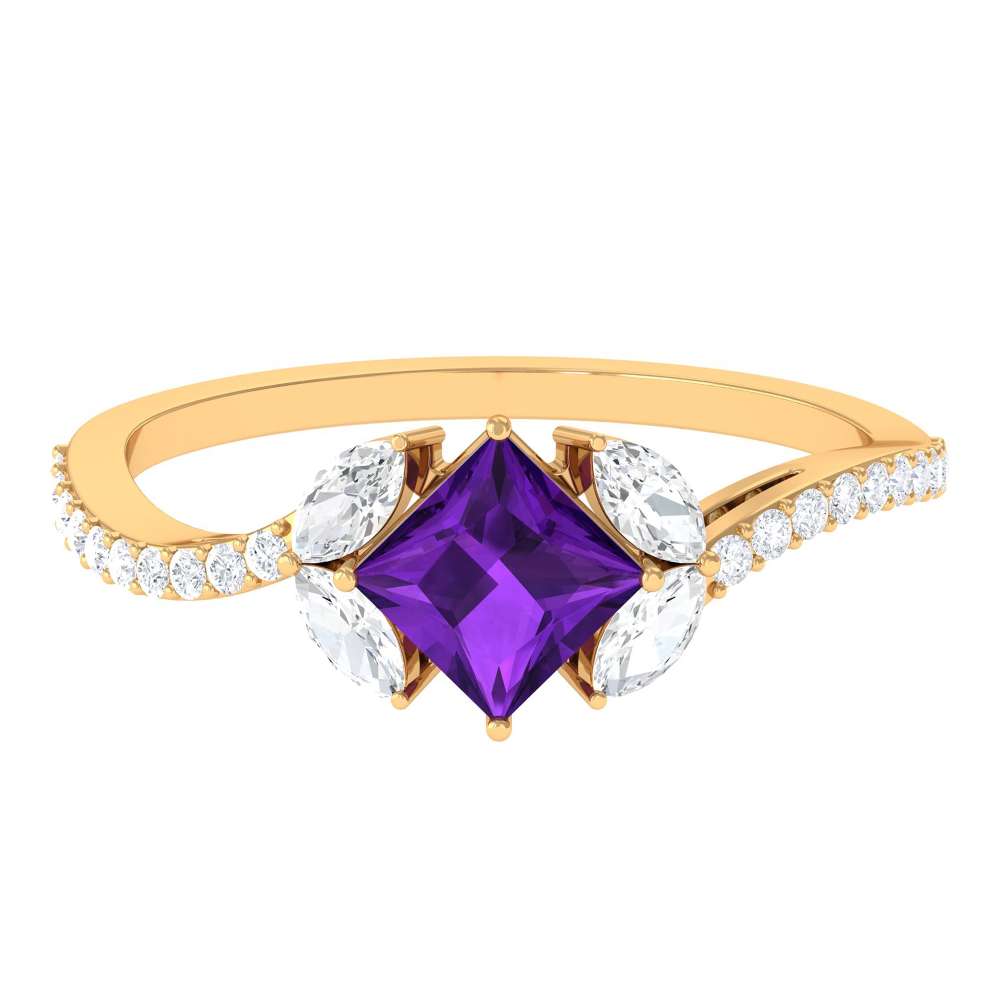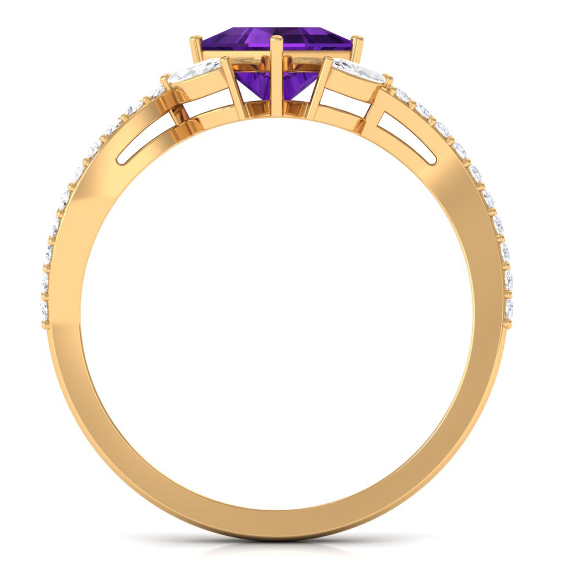Since modern love stories are meant to be celebrated with just as much grandeur, we bring to you our Royal Amethyst Engagement Ring. Nestled atop is the Centerpiece of 5 MM Princess Cut Amethyst secured by Prong Setting that stands solo to make an impression with its regal charm. A series of Marquise Shape Diamond mimic elegant petals to lend it a surreal touch while Round Shape ones adorn it half way through the Bypass Shank. Contemporary yet classic, this Certified Amethyst Ring brings little bit of everything to the table.