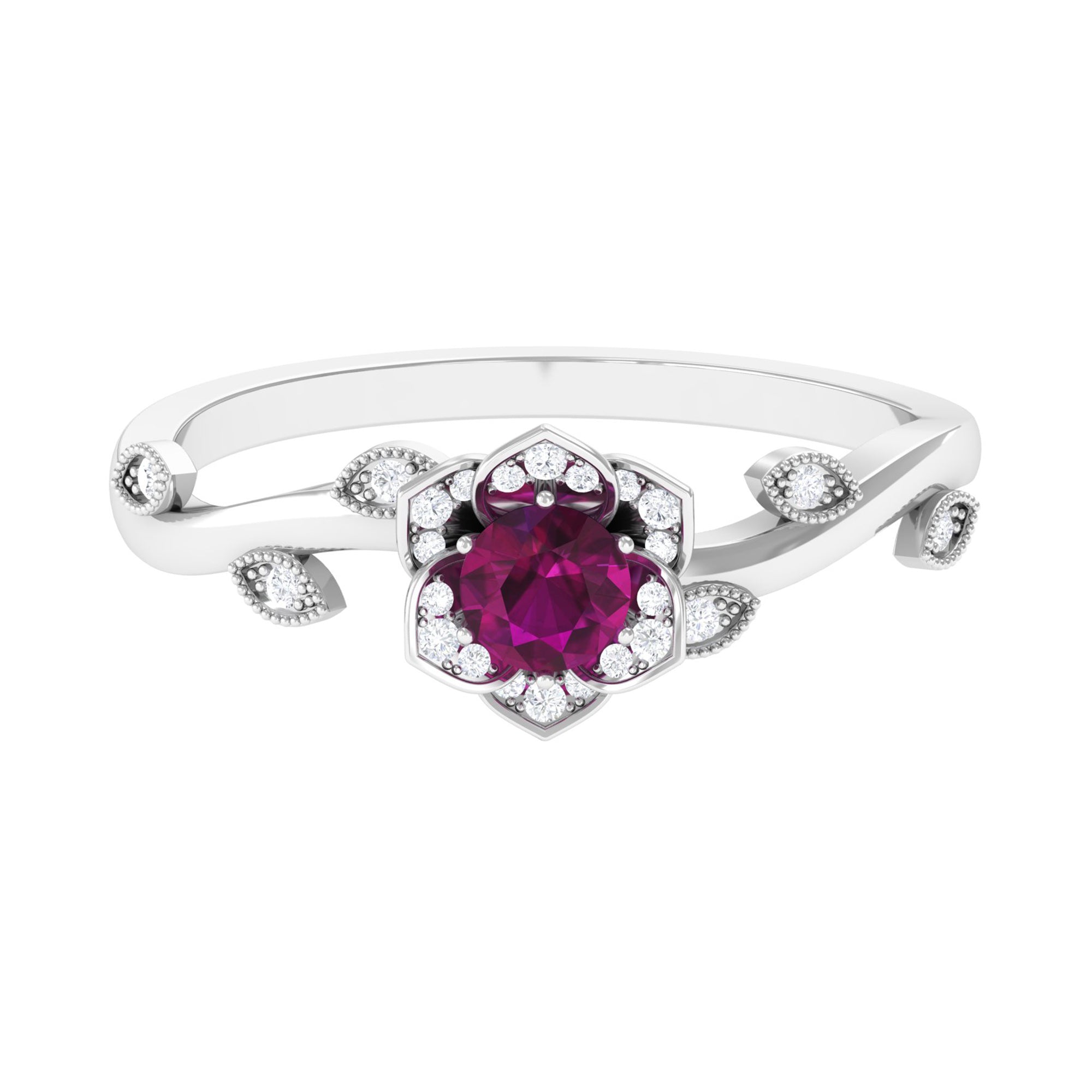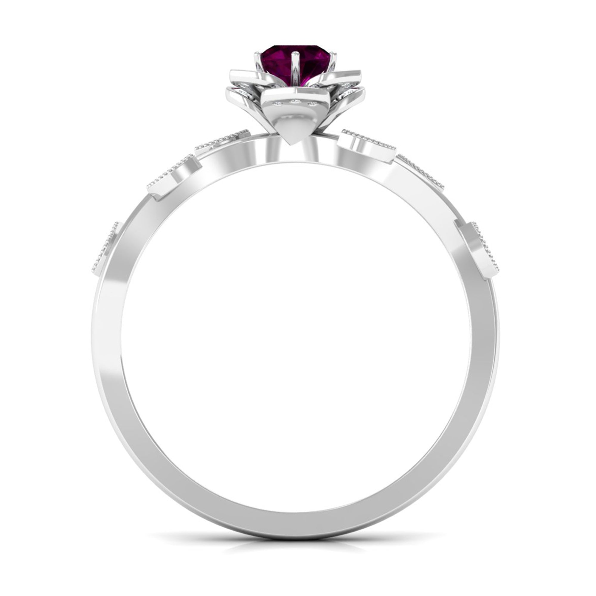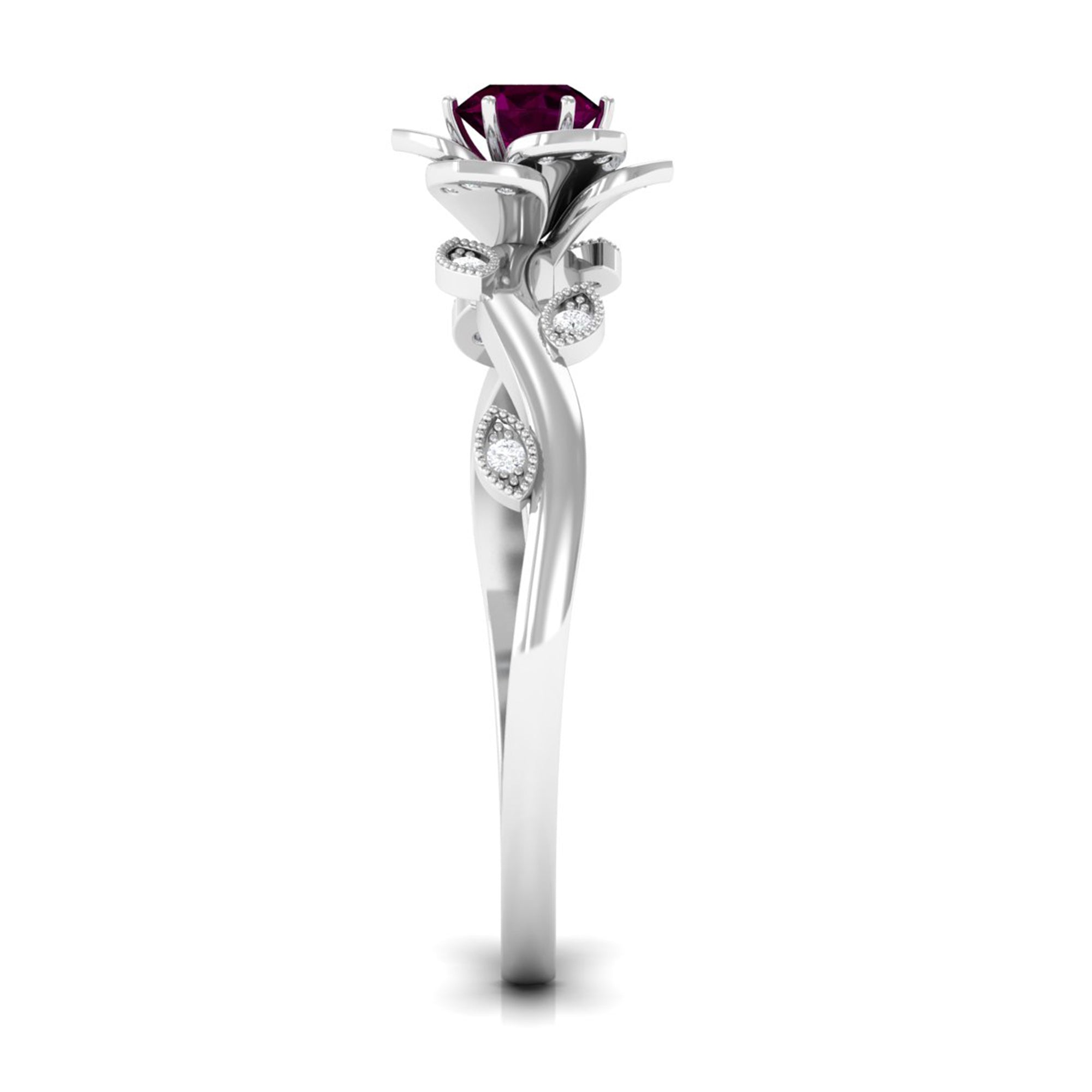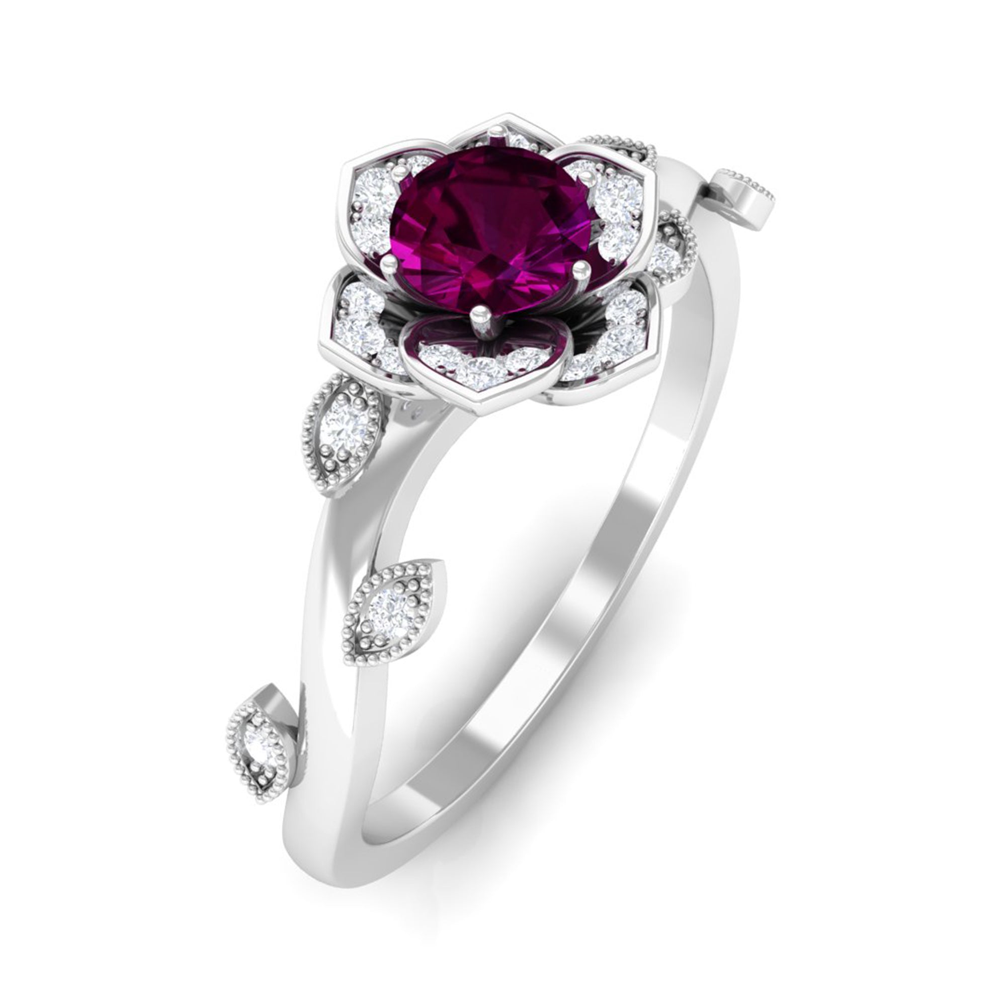 Let the beauty of nature inspire your love with this breathtaking nature-inspired Rhodolite garnet engagement ring. The deep red gemstone, reminiscent of a fiery sunset, is nestled in a delicate prong setting, evoking the organic grace of the natural world. This stunning engagement ring features a 4 mm rhodolite center gemstone surrounded by a halo of sparkling diamonds. This ring is perfect for the nature-lover at heart.