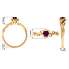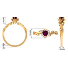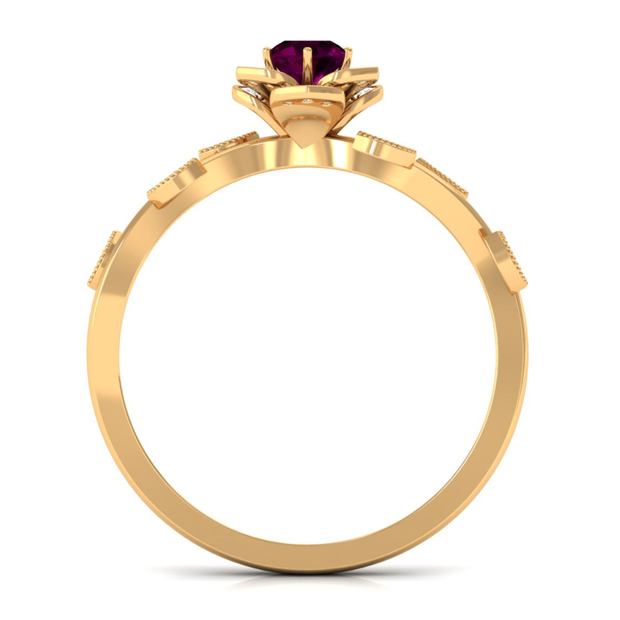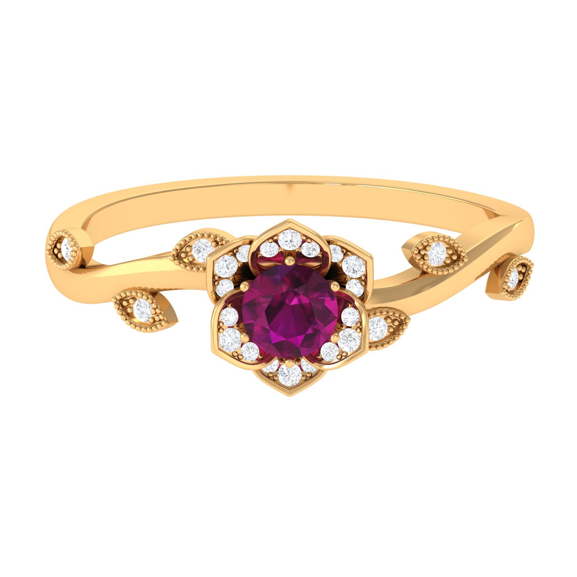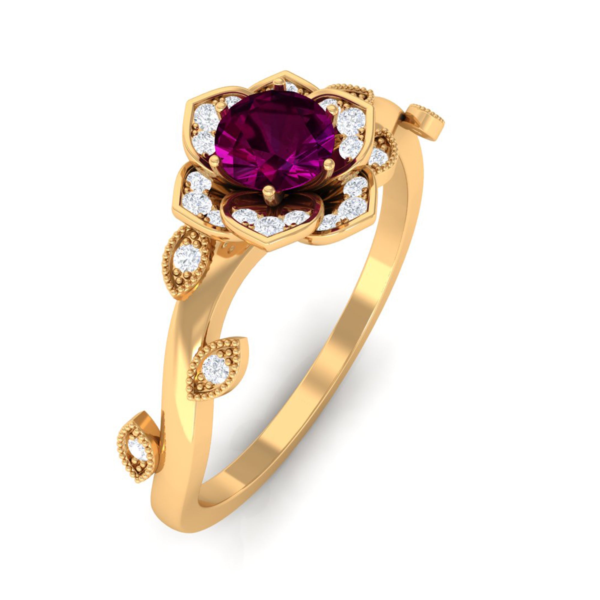 Let the beauty of nature inspire your love with this breathtaking nature-inspired Rhodolite garnet engagement ring. The deep red gemstone, reminiscent of a fiery sunset, is nestled in a delicate prong setting, evoking the organic grace of the natural world. This stunning engagement ring features a 4 mm rhodolite center gemstone surrounded by a halo of sparkling diamonds. This ring is perfect for the nature-lover at heart.