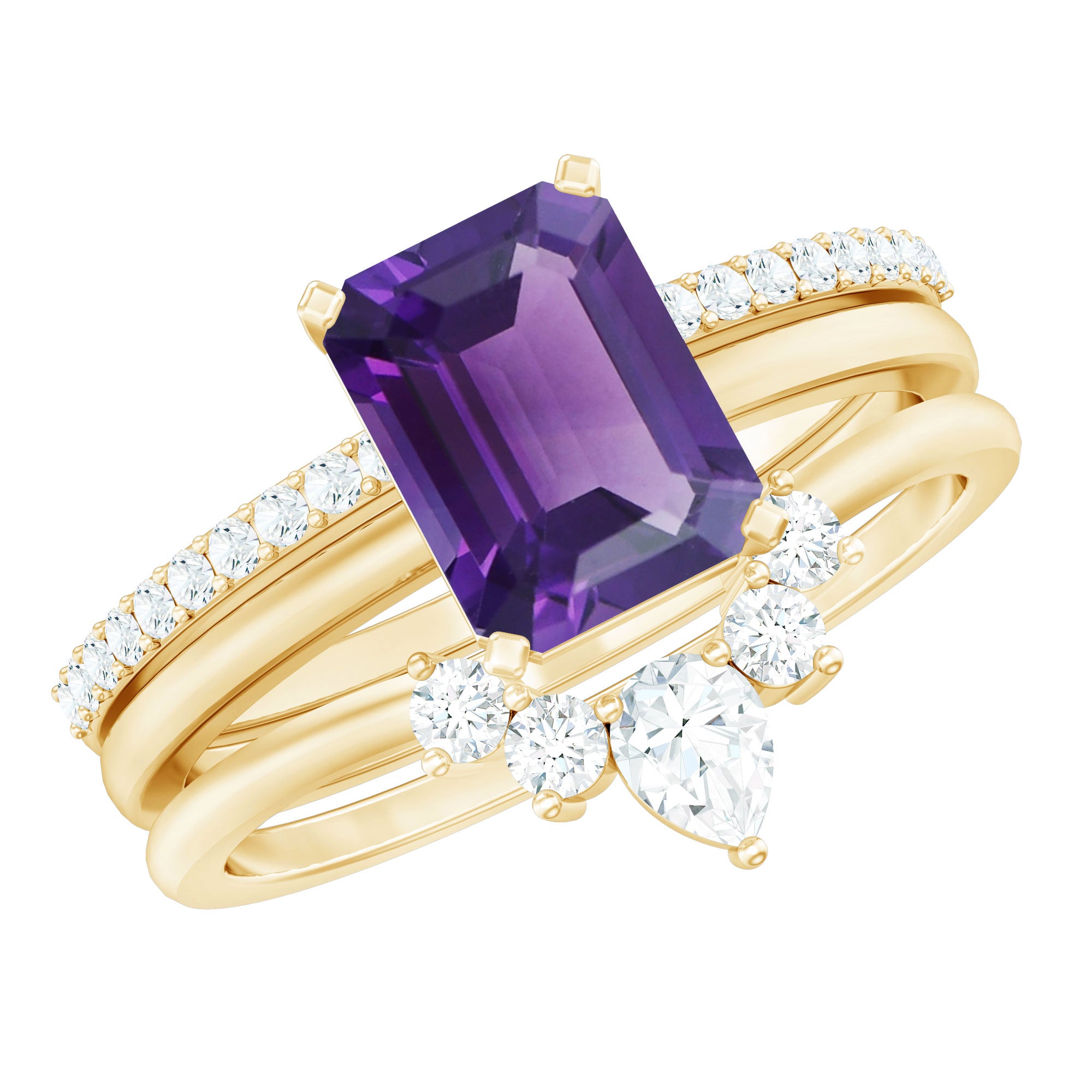 Put this Solitaire Ring Set on your loved one for a stylish look. Additionally, this ring set is adorned with an Octagon Shape Amethyst that is placed in a prong setting. Two additional rings feature Round and Pear Cut Moissanite in prong settings. There is gold metal mounting on this Amethyst Ring Set.