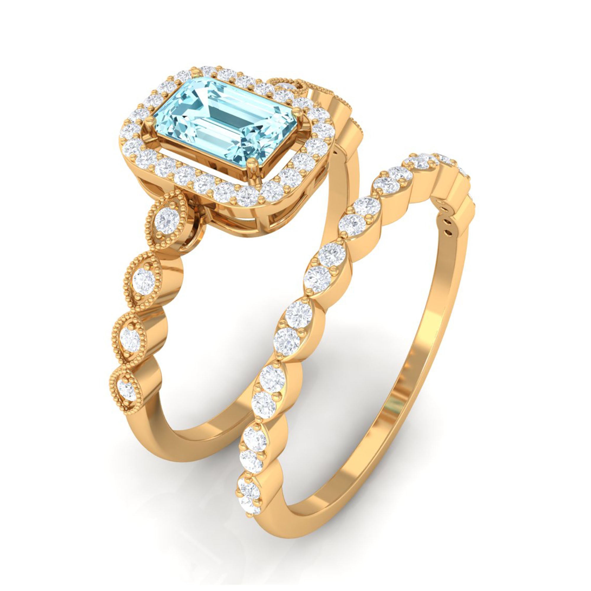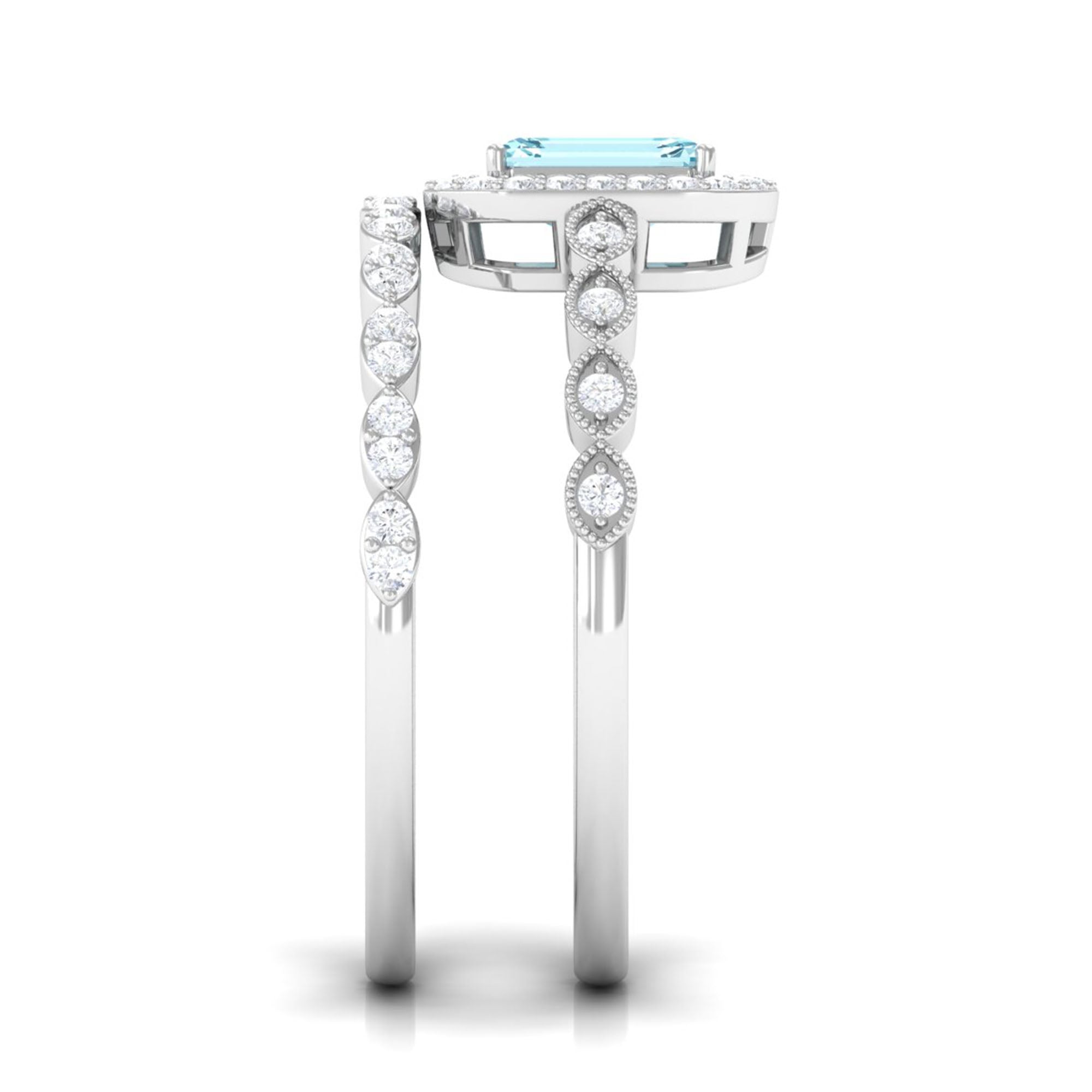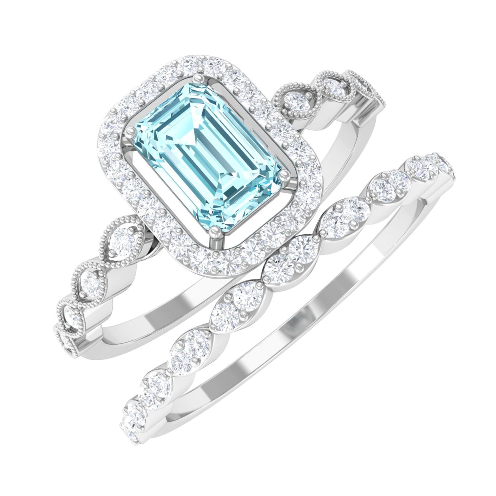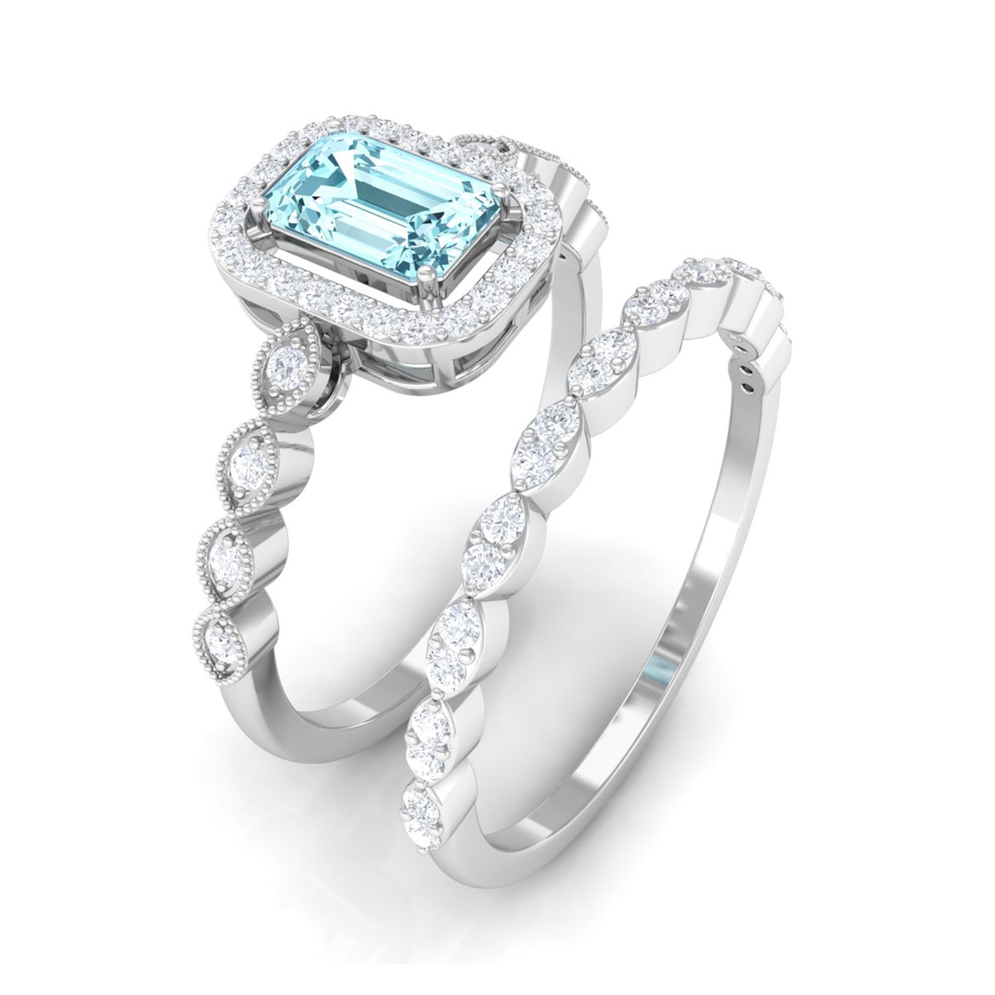 Get this alluring Wedding Ring Set for her and make a commitment to a lifelong promise of caring, laughter, and love. Decorated with Emerald Cut Aquamarine secured in 4 Prong Setting while dainty Round Diamond adding a touch of sparkle. This Aquamarine Ring Set will shine brighter on your special day. Make your bond stronger by giving her this Ring Set as a symbol of love.