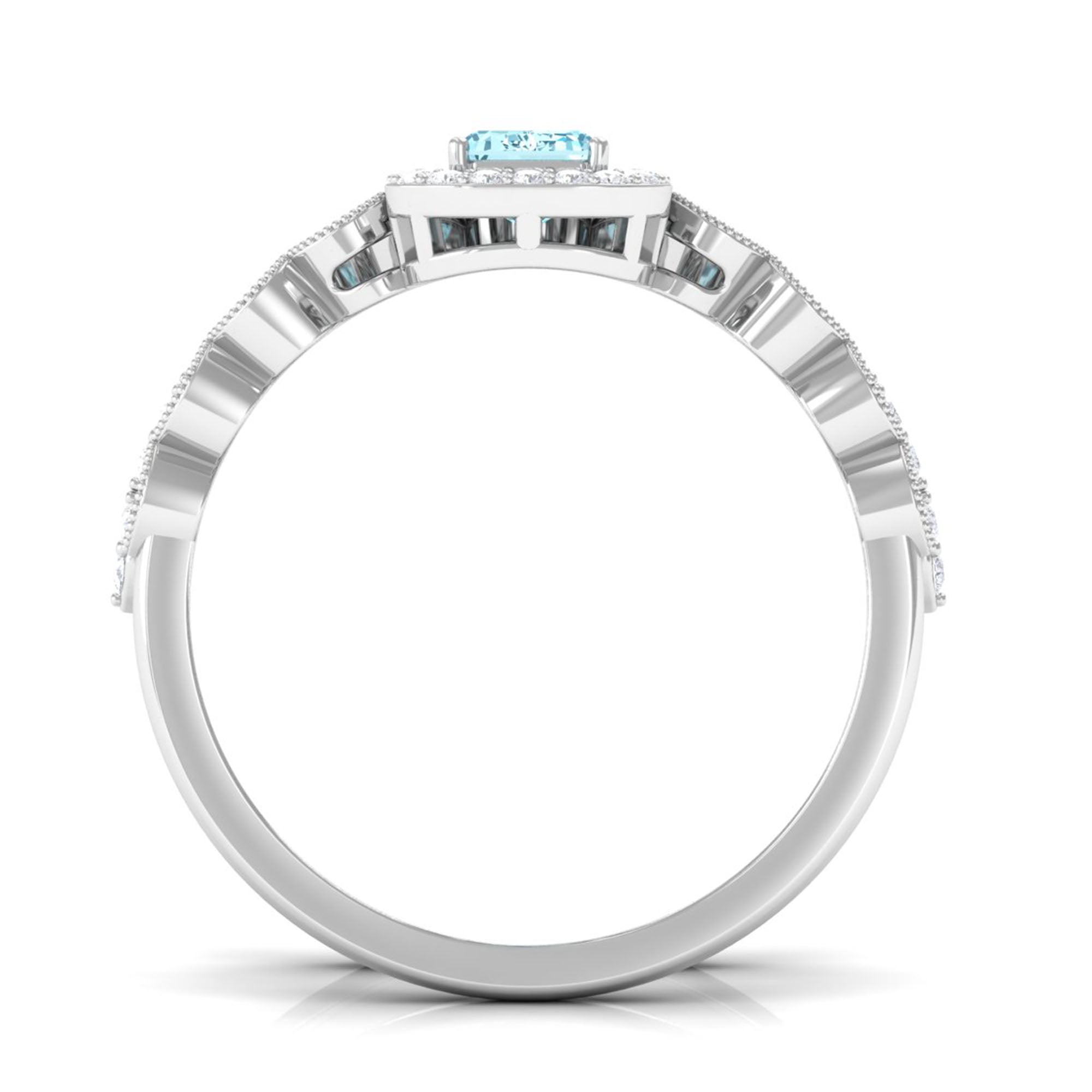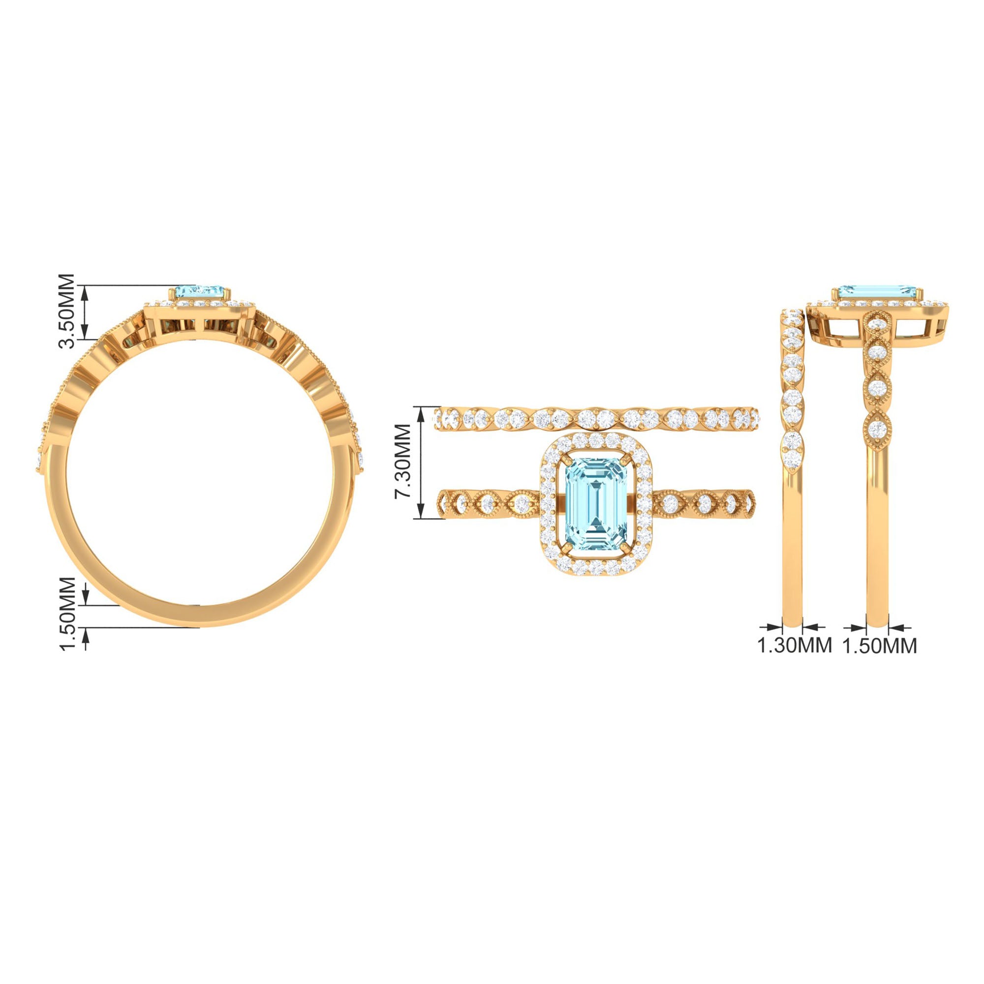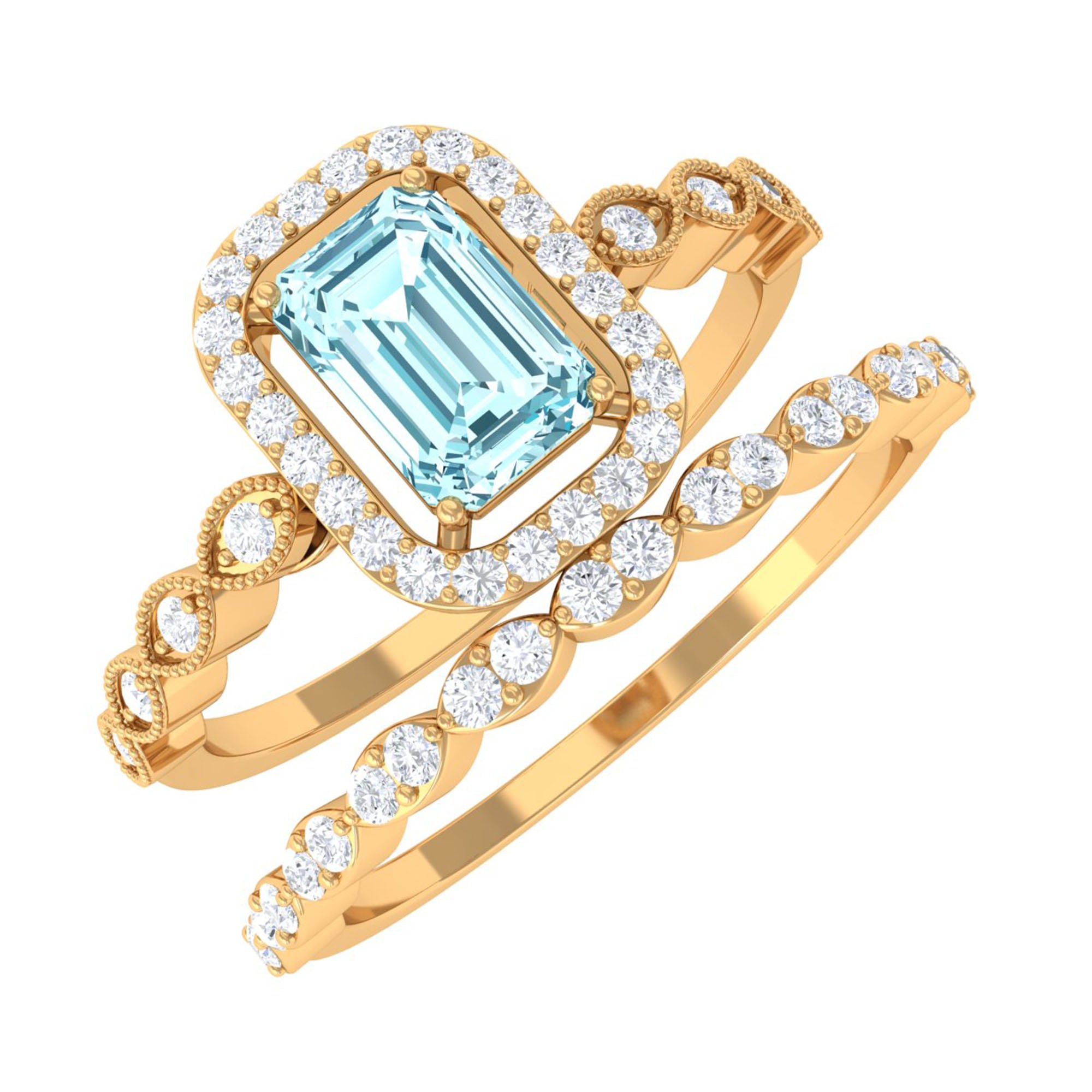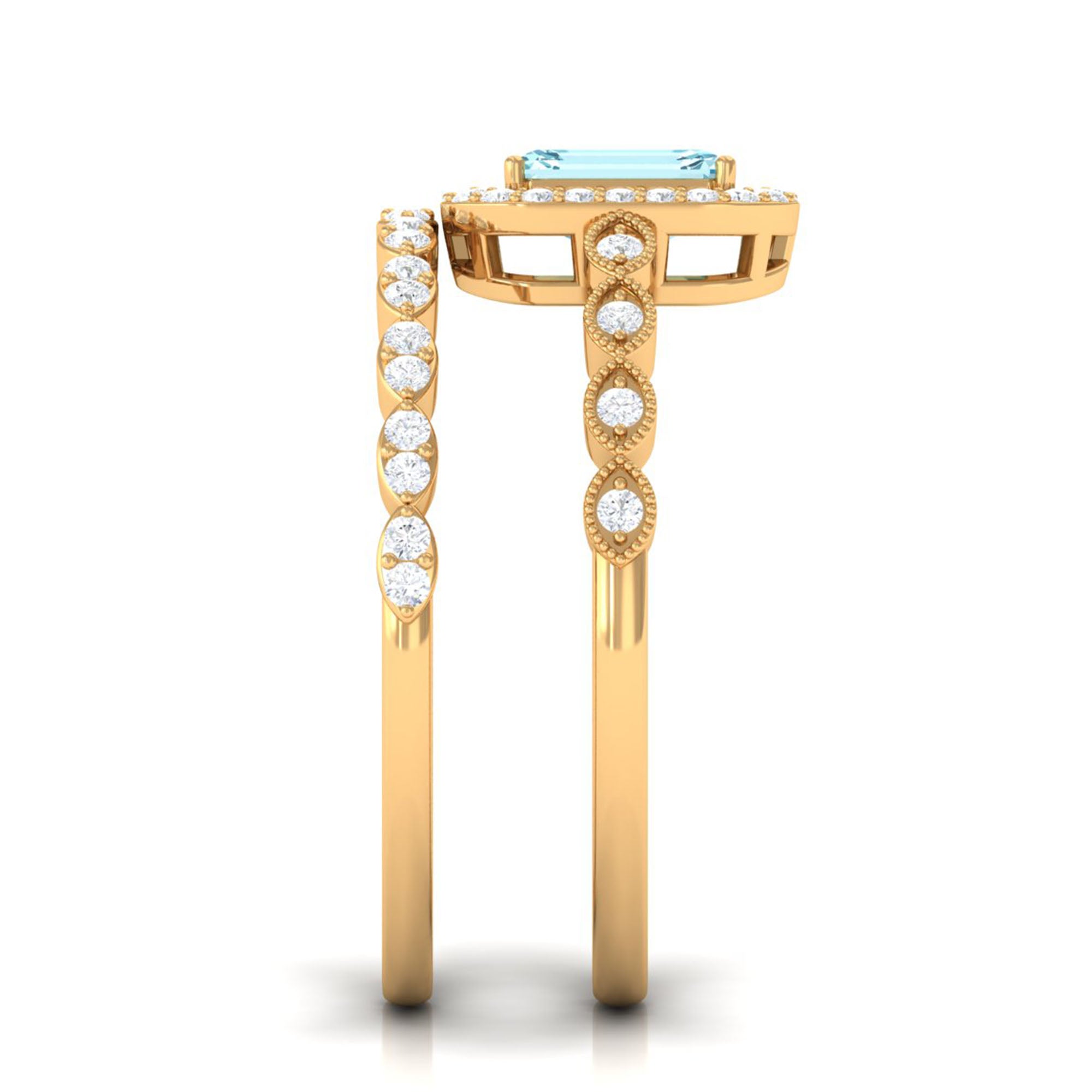 Get this alluring Wedding Ring Set for her and make a commitment to a lifelong promise of caring, laughter, and love. Decorated with Emerald Cut Aquamarine secured in 4 Prong Setting while dainty Round Diamond adding a touch of sparkle. This Aquamarine Ring Set will shine brighter on your special day. Make your bond stronger by giving her this Ring Set as a symbol of love.