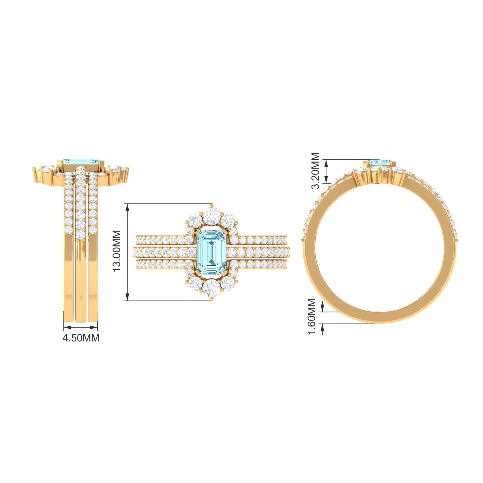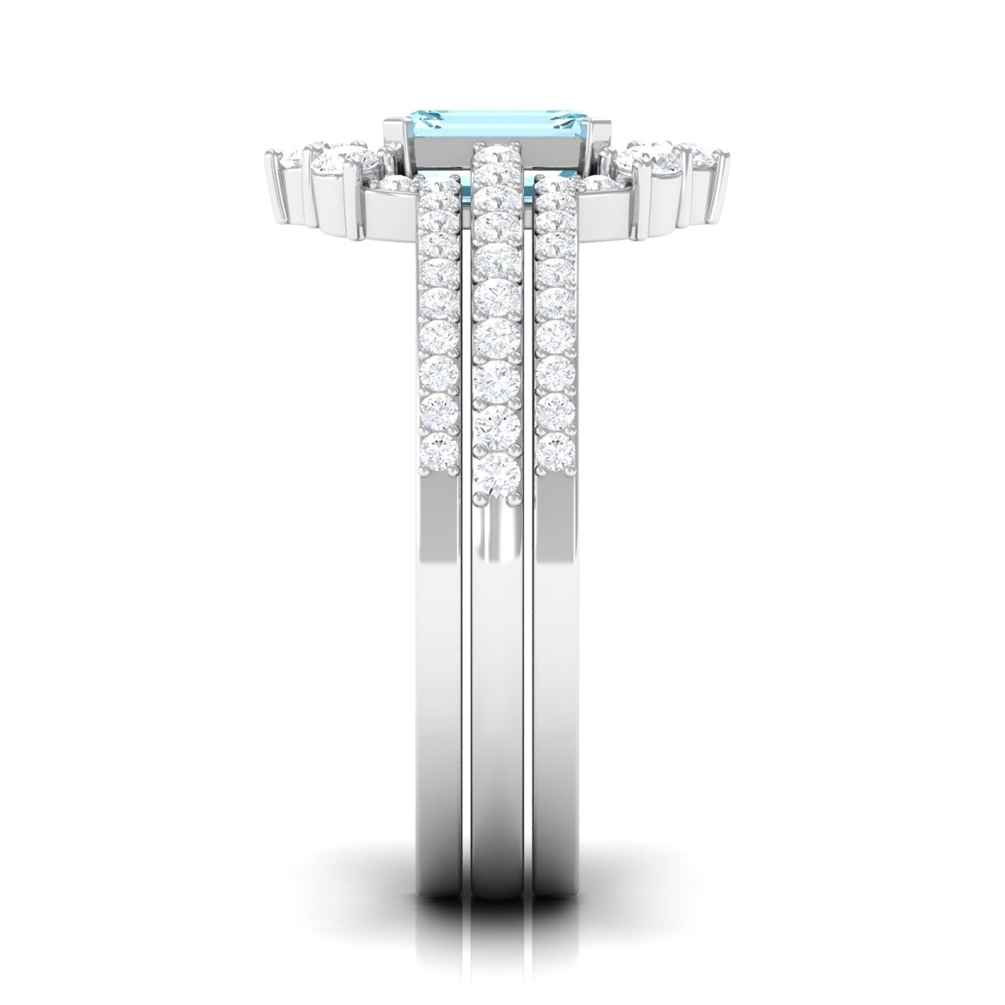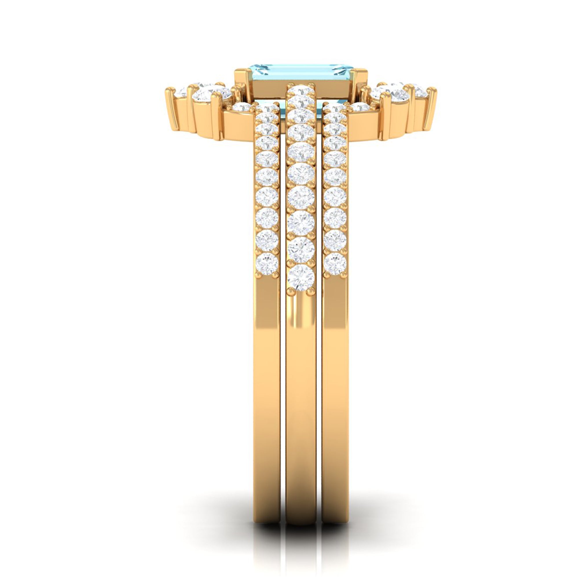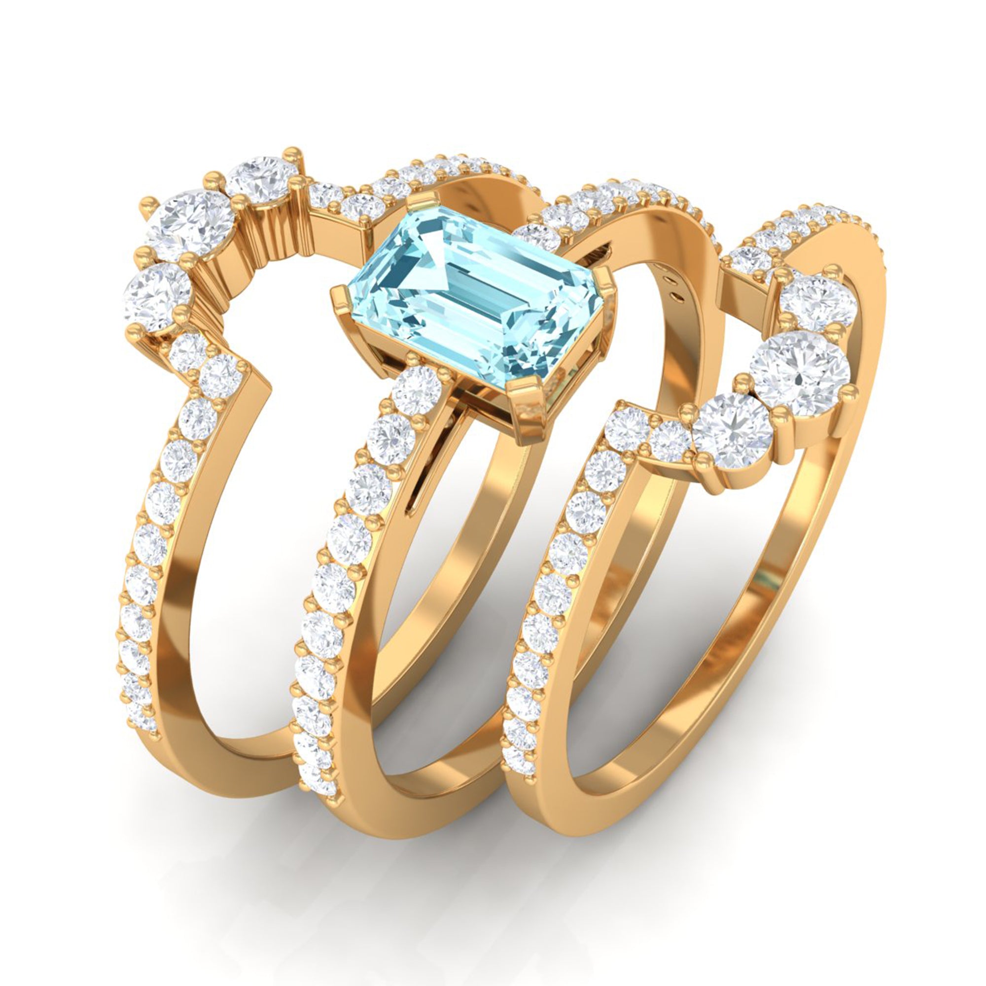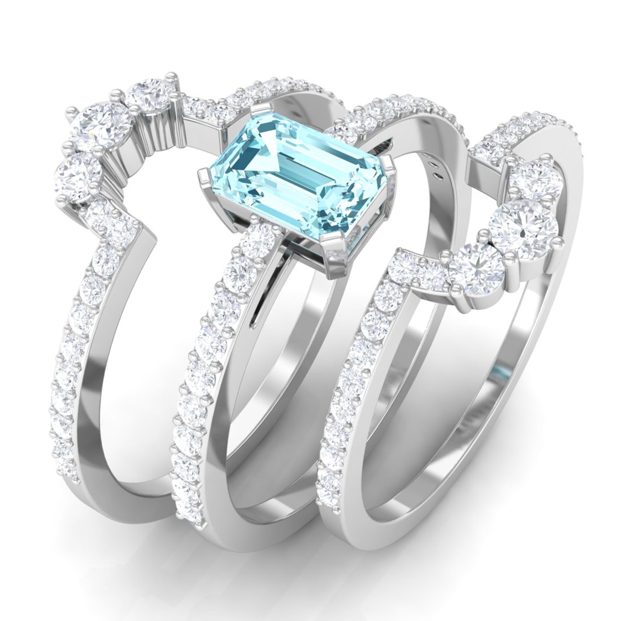 You will definitely steal the spotlight of any event by wearing this Solitaire Engagement Ring Set. Adorned with Emerald Cut Aquamarine secured in Prong Setting while dainty Round Diamonds studded on two matching bands.• The Trio Ring Set will sparkle forever and her jewelry collection wont be complete without including this Aquamarine Ring Set.