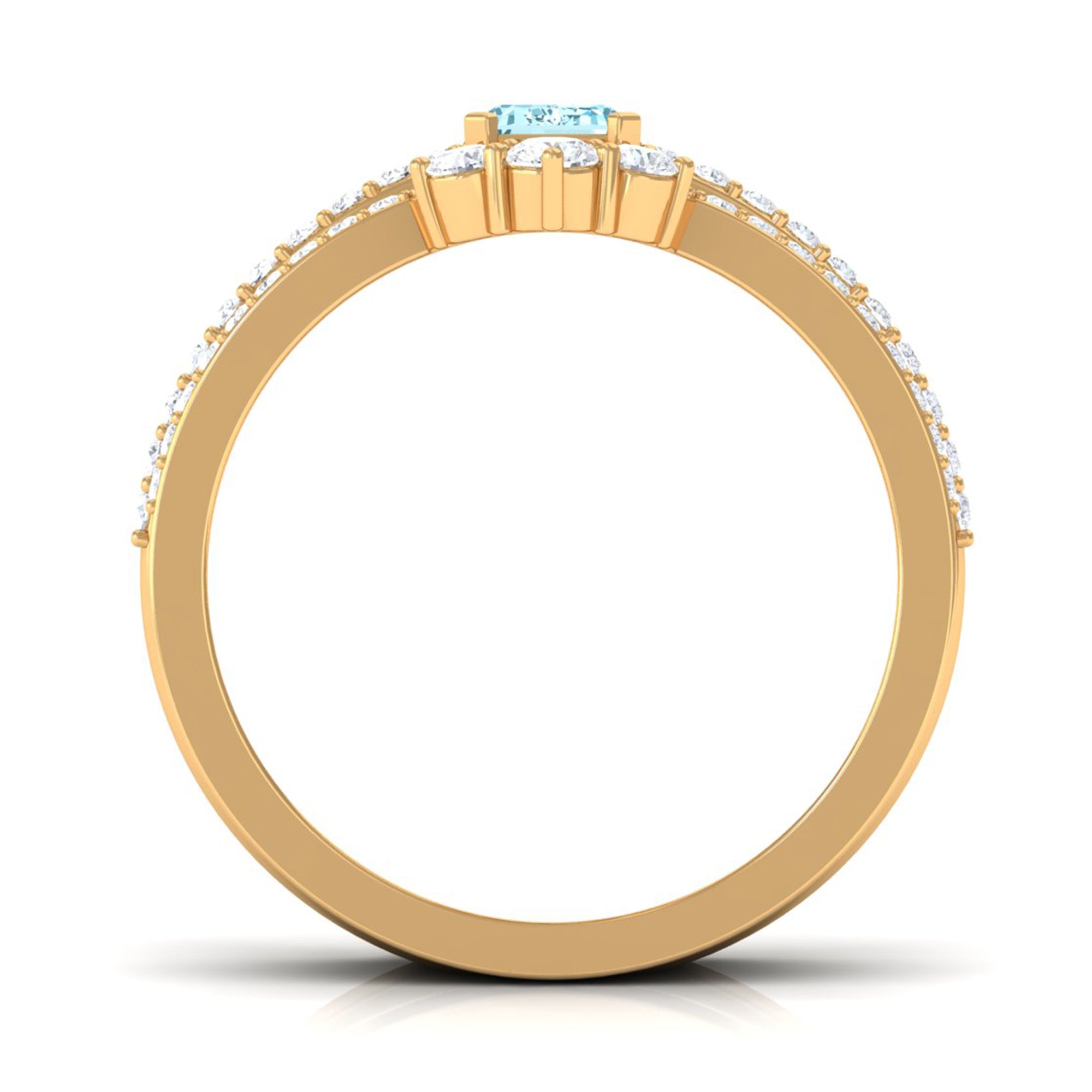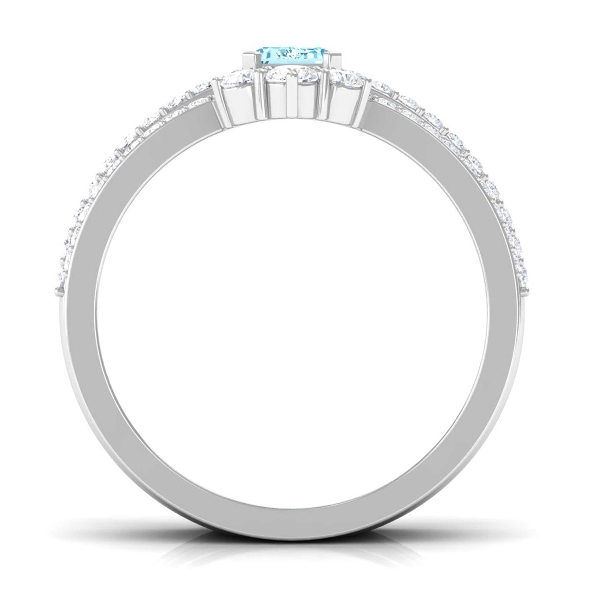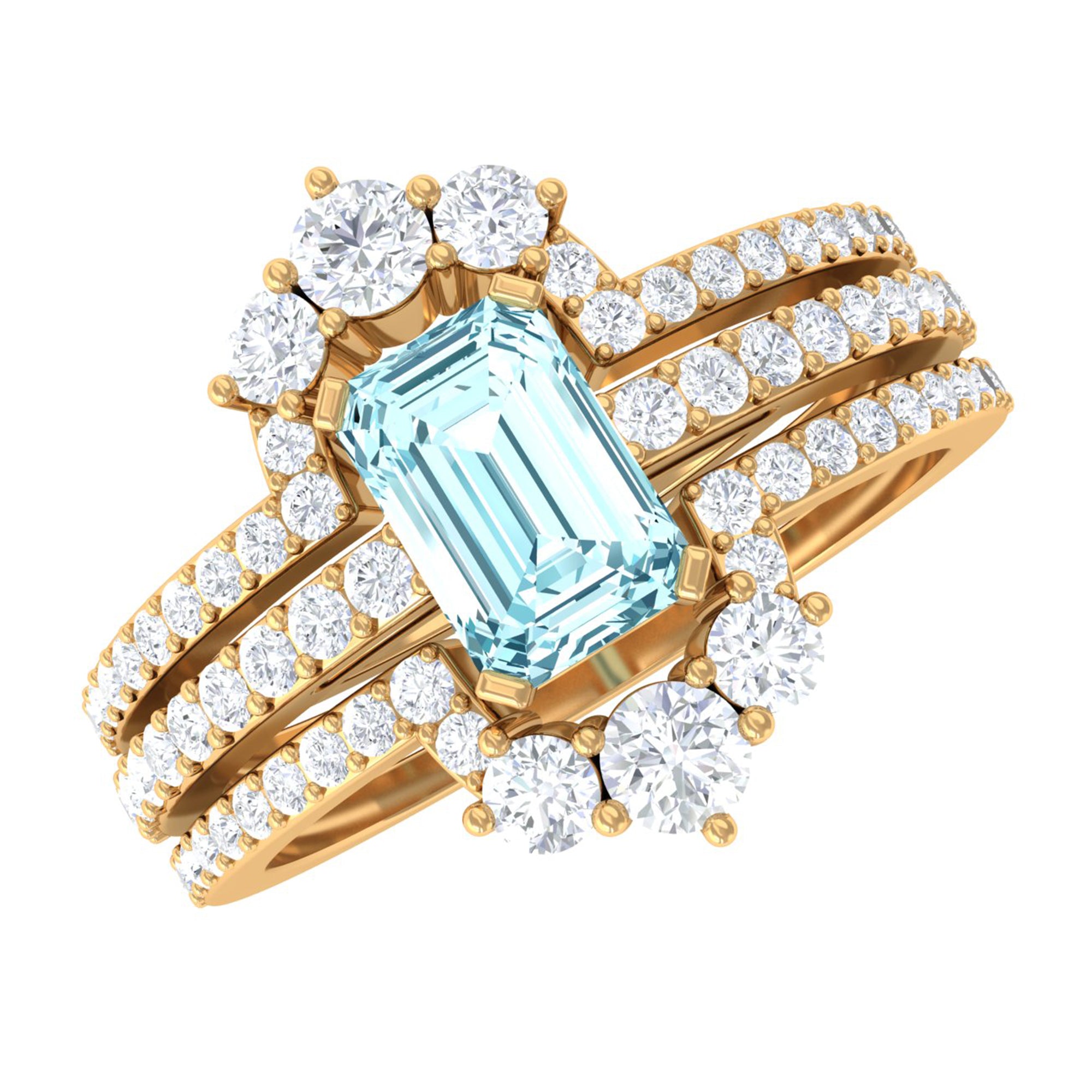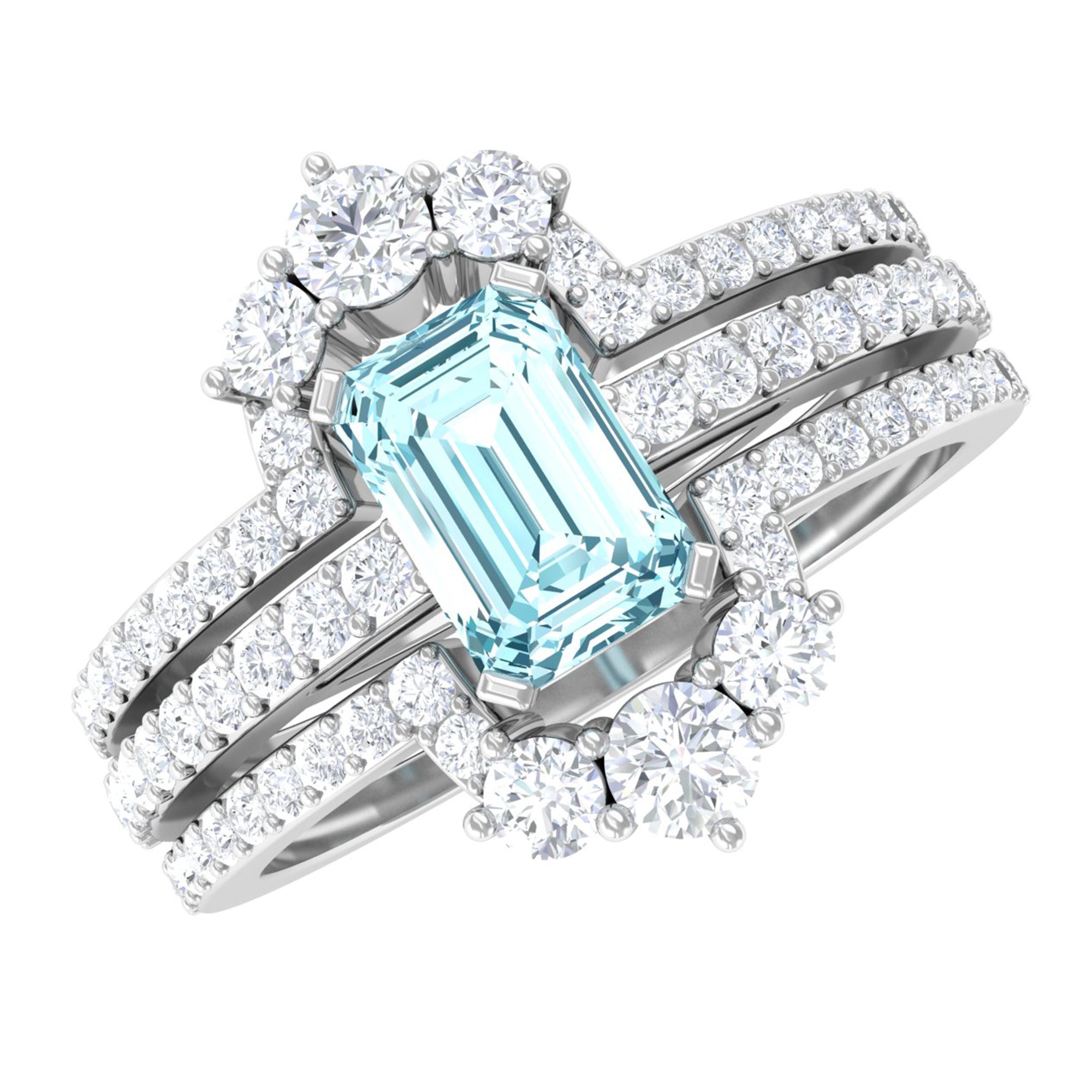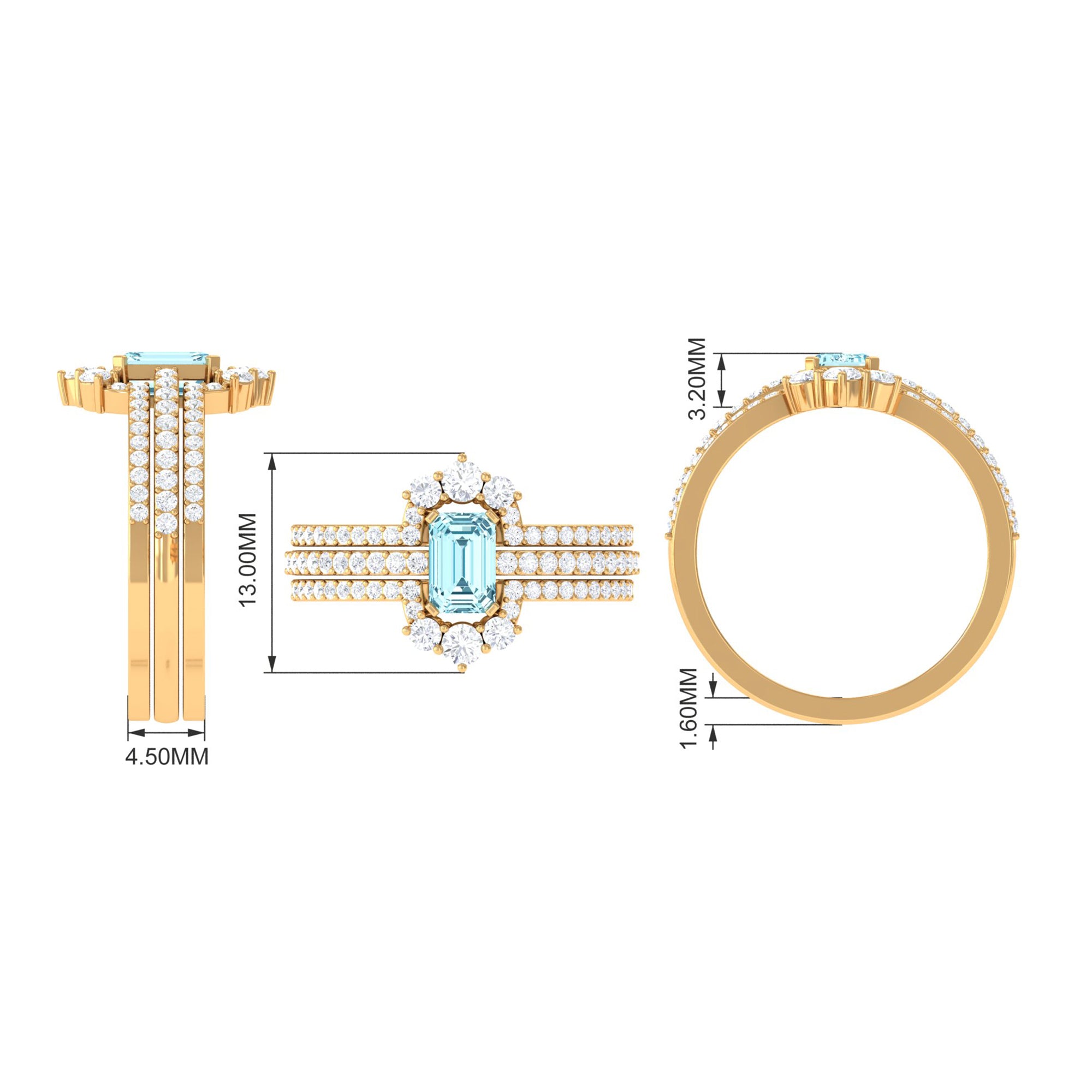 You will definitely steal the spotlight of any event by wearing this Solitaire Engagement Ring Set. Adorned with Emerald Cut Aquamarine secured in Prong Setting while dainty Round Diamonds studded on two matching bands.• The Trio Ring Set will sparkle forever and her jewelry collection wont be complete without including this Aquamarine Ring Set.