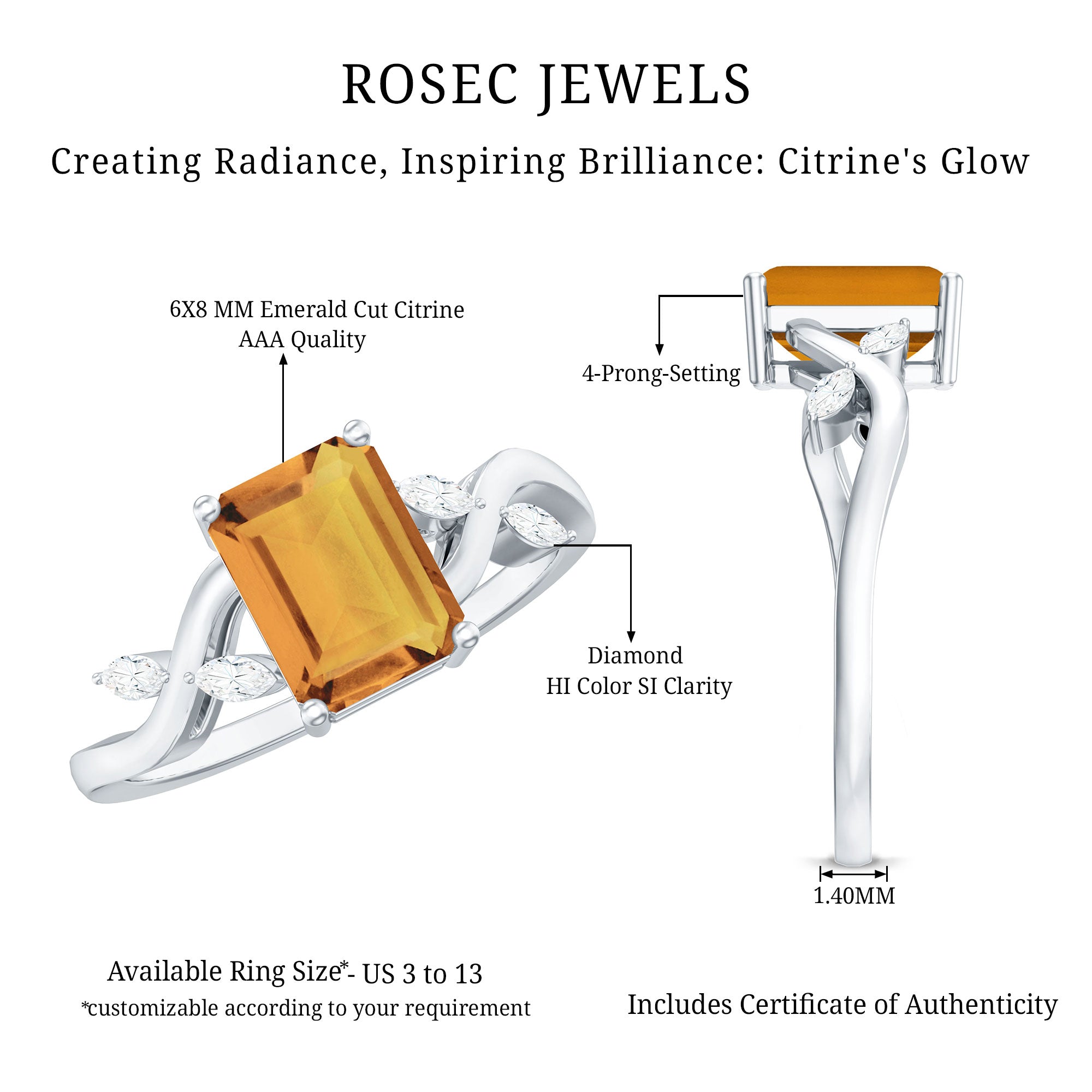 Citrine Solitaire Engagement Ring is embellished with Marquise Diamond to give this ring a perfect look. The Octagon Cut Citrine is held in 4 Prong Setting for a better and secure look. This Engagement Ring has an exquisite Split Shank, make this ring perfect for your lady.