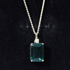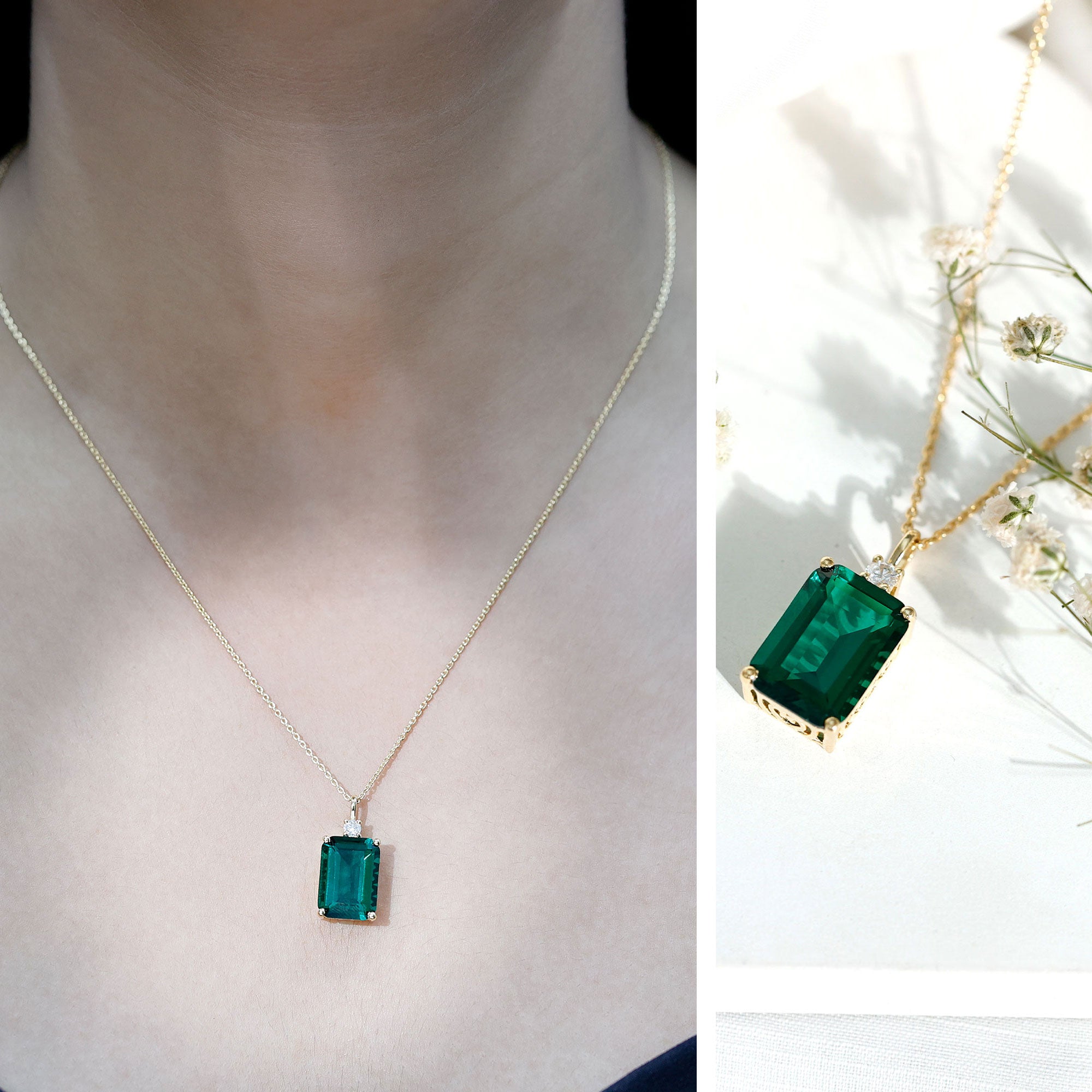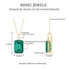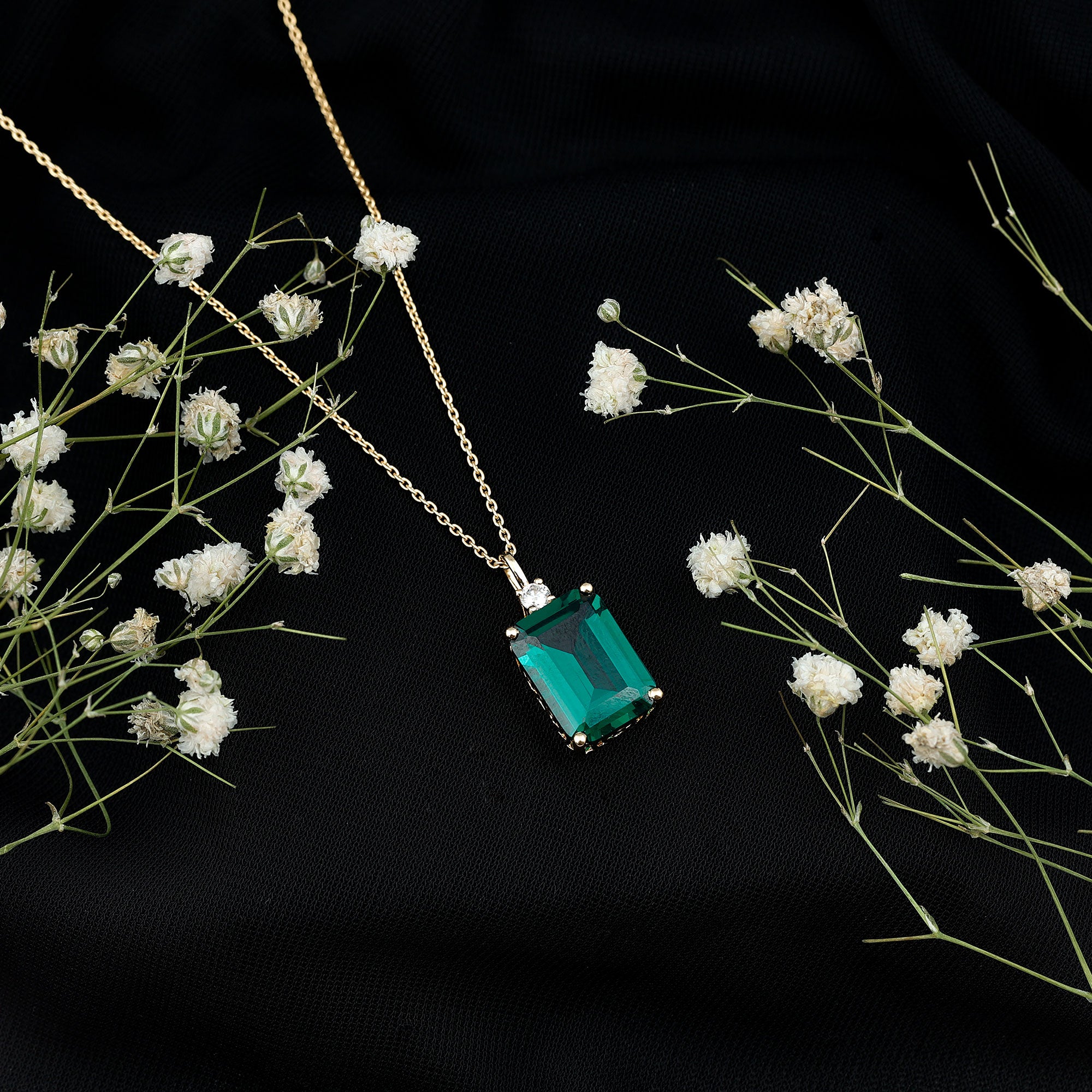 Adorned with small Brilliant Round Cut Moissanite, this Solitaire Pendant Necklace showcases a striking Octagon Cut Created Emerald Gemstone in a Prong Setting. The meticulous craftsmanship and exquisite color combination make it a captivating piece of jewelry, adding elegance and sophistication to any ensemble.