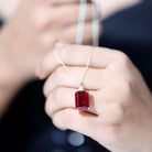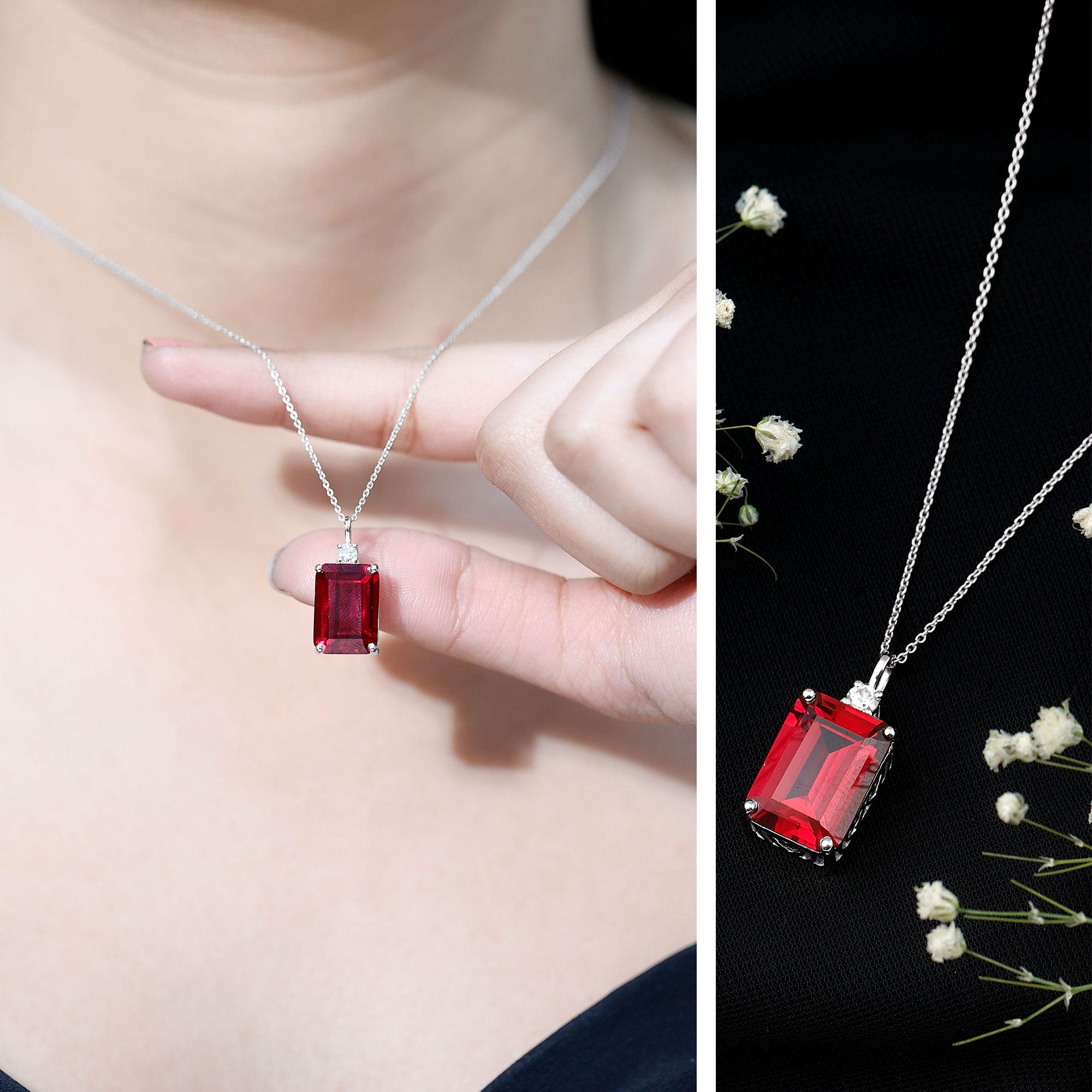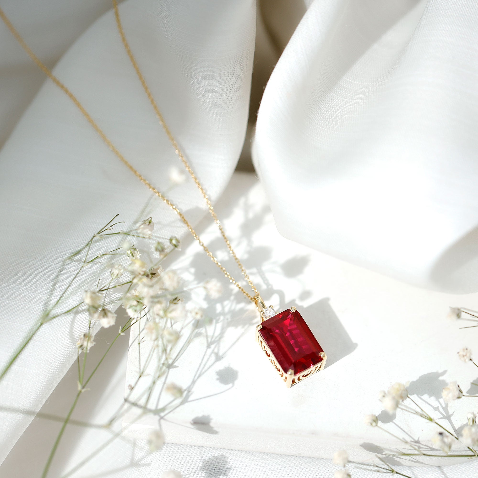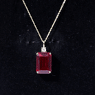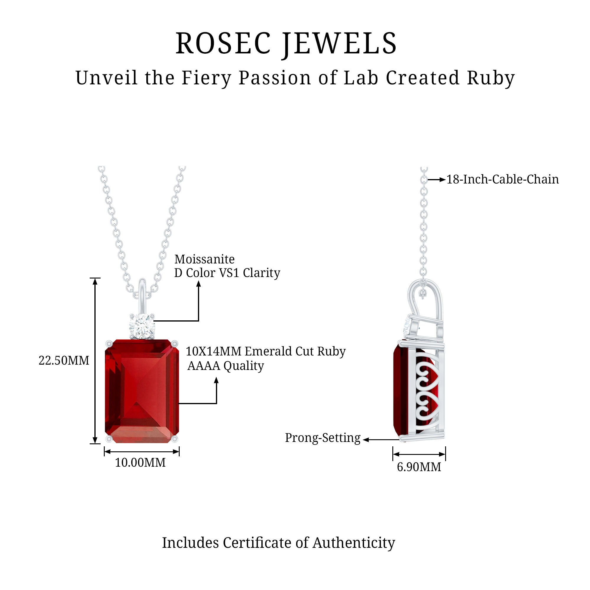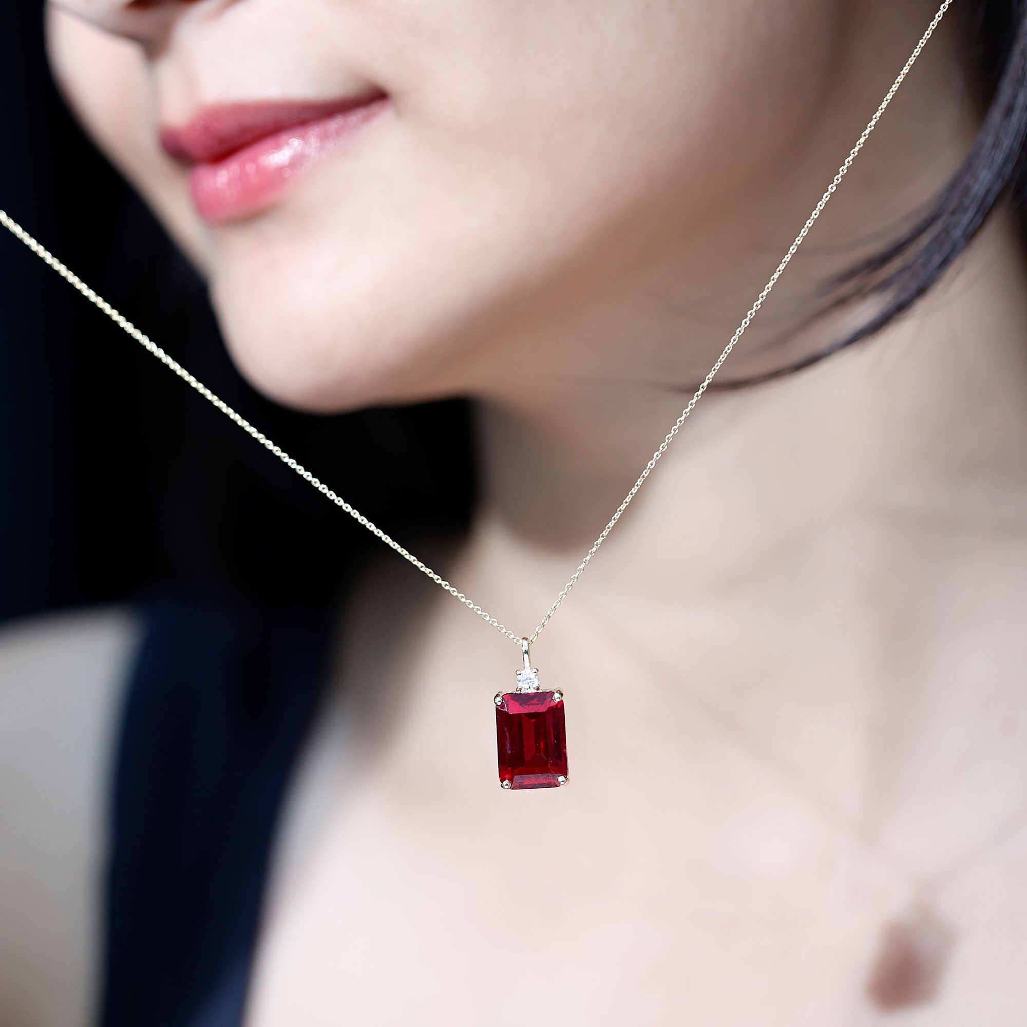 Elevate your style with this Solitaire Pendant Necklace, featuring a striking Octagon Cut Created Ruby Gemstone in a Prong Setting. Adorned with small Brilliant Round Cut Moissanite, the meticulous craftsmanship and captivating color combination exude elegance and sophistication, complementing any ensemble with timeless allure.