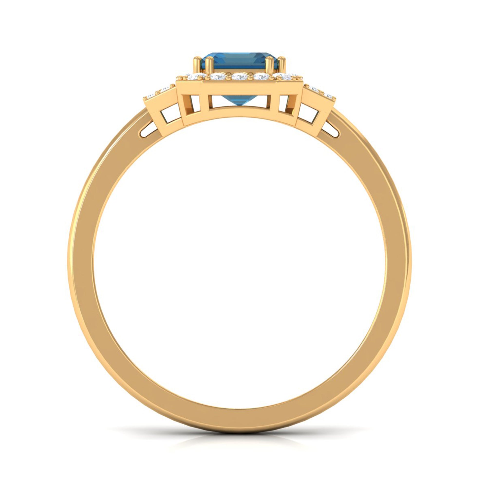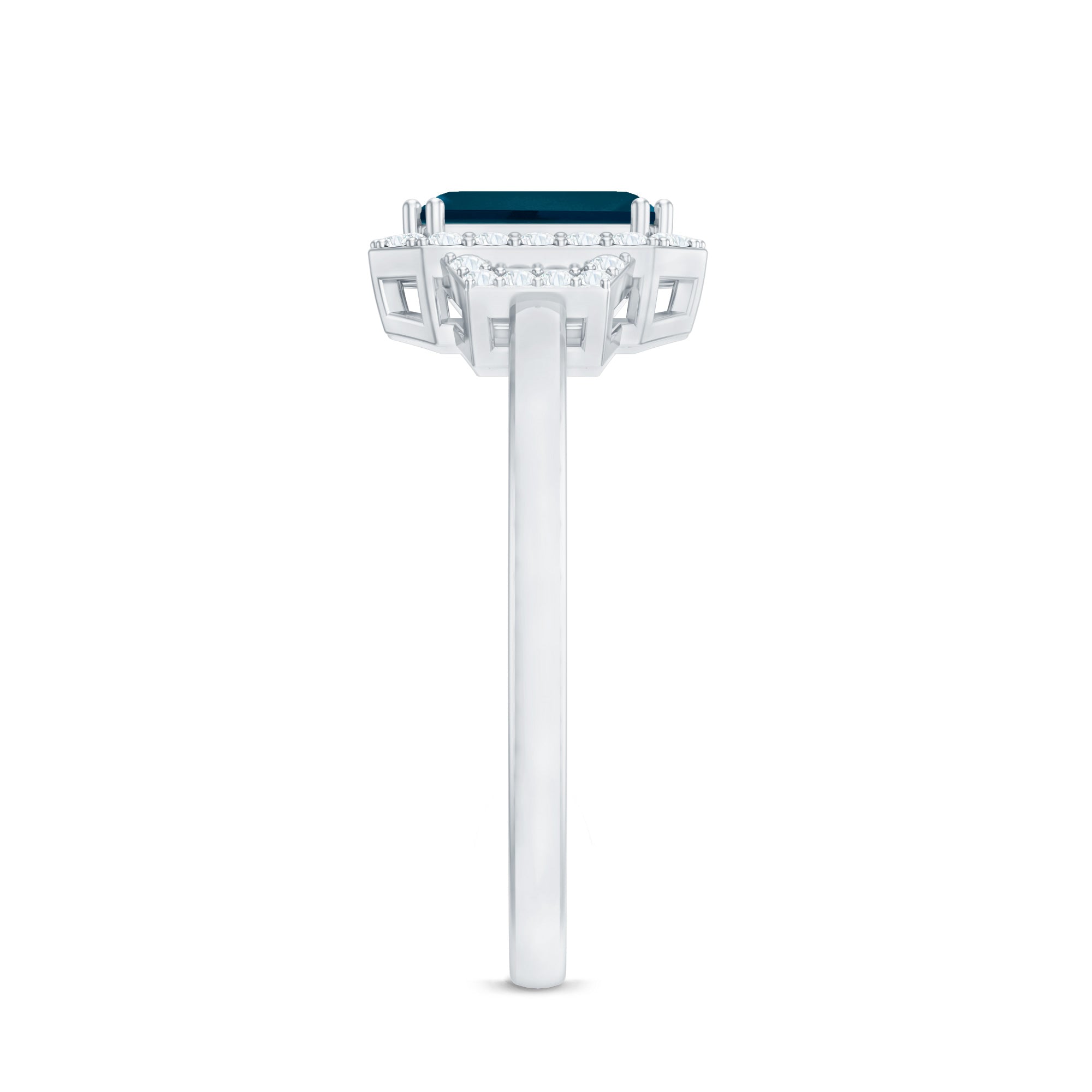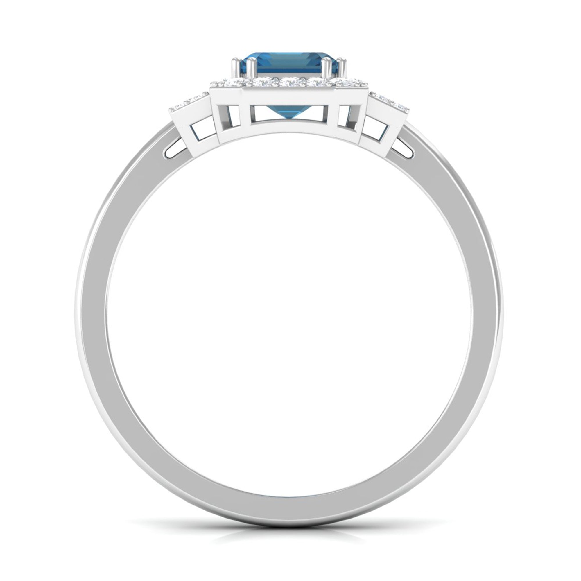 Turn heads and win hearts with this stunning London Blue Topaz Engagement Ring that is anything but ordinary. At the center sits a bold and beautiful 6X8 MM emerald cut london blue topaz, set in secure double prong setting. It is surrounded by a halo of round sparkling diamonds that add the perfect touch of shine, making the whole Emerald Cut Engagement Ring glow with elegance and charm. The London Blue Topaz is of AAA quality, known for its clarity and vibrant color, while the diamonds are of HI-SI quality, bright, clear, and full of sparkle. The mix of deep blue and sparkling white creates a gorgeous contrast that feels both modern and timeless. Every detail of this Blue Topaz and Diamond Engagement Ring has been carefully designed to stand out while still feeling graceful. It is a great pick for someone who loves bold style with a touch of classic charm. The design is eye-catching, making it perfect for daily wear or those extra special moments. You can make it truly yours with a variety of size options and metal purities to choose from, so finding the perfect fit and finish is easy. Plus, for extra confidence in your purchase, this Emerald Cut Blue Topaz Ring comes with a certificate of gemstone authenticity. It is a meaningful piece with stunning detail, built to be loved and admired for years to come.