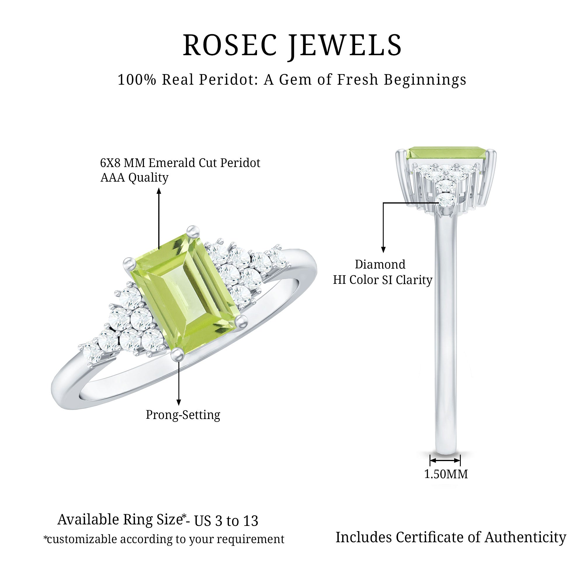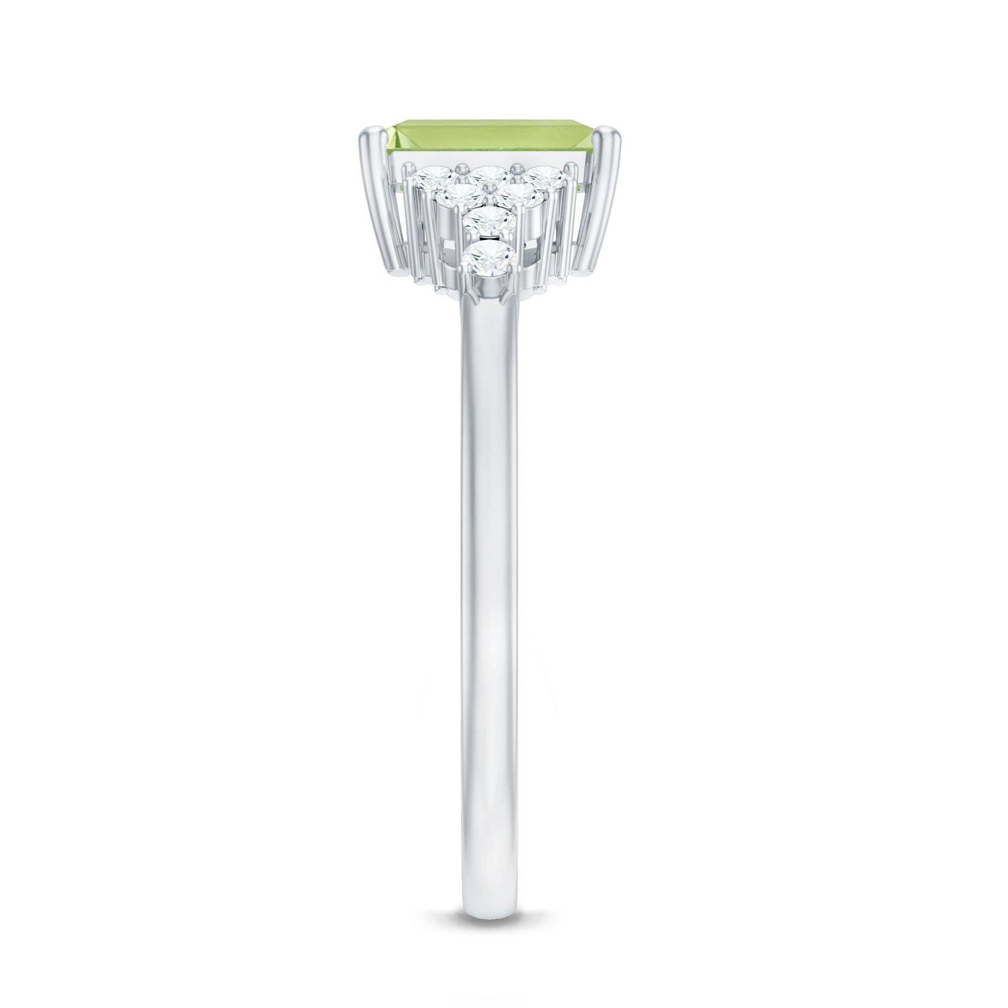 This solitaire engagement ring features an Emerald Cut Peridot center stone, accented by round Diamond cluster on both sides. The simple and elegant design makes this piece a versatile choice that can be worn every day or on special occasions, making it the perfect symbol of your love and commitment. The unique cut of the Peridot adds a touch of individuality to this timeless piece.
