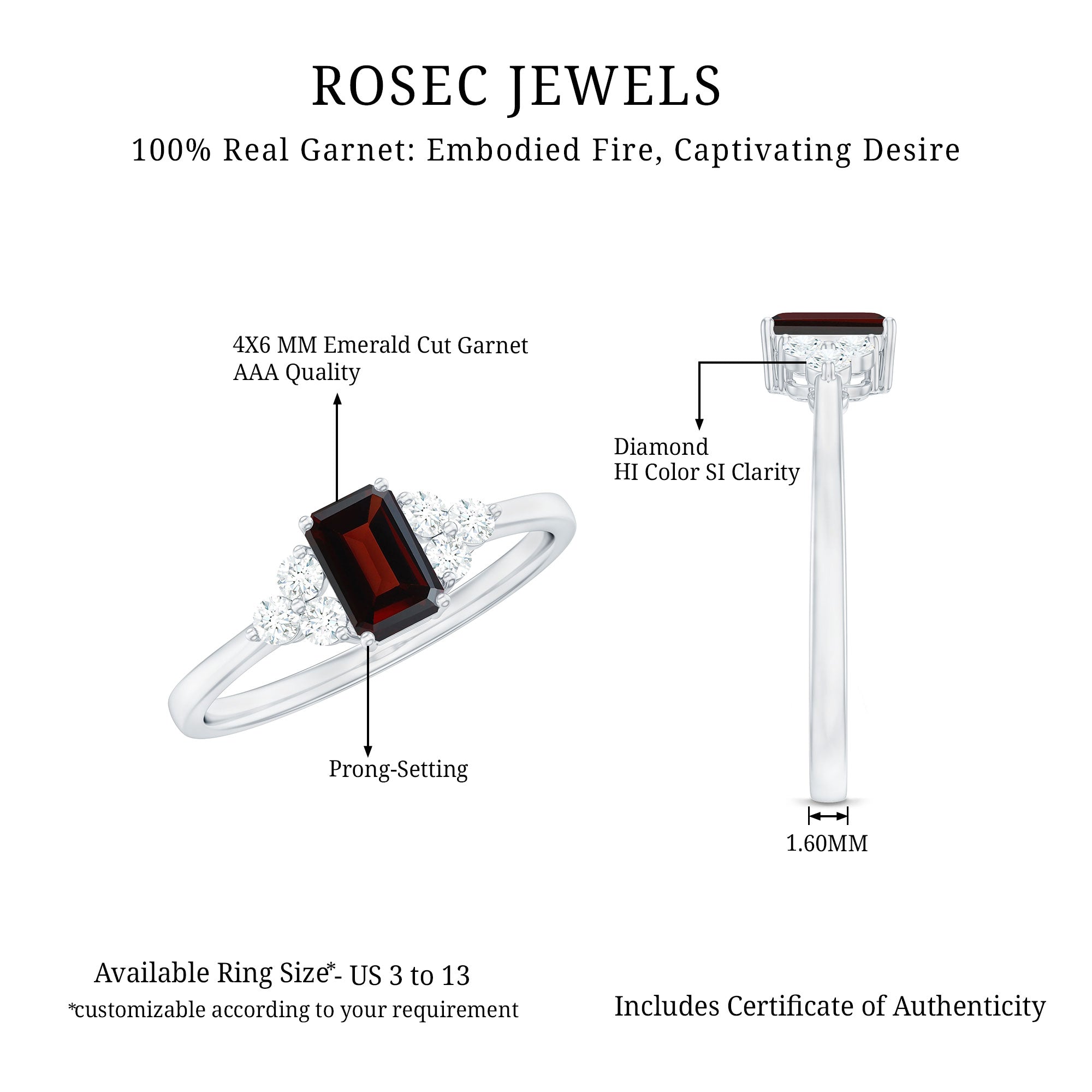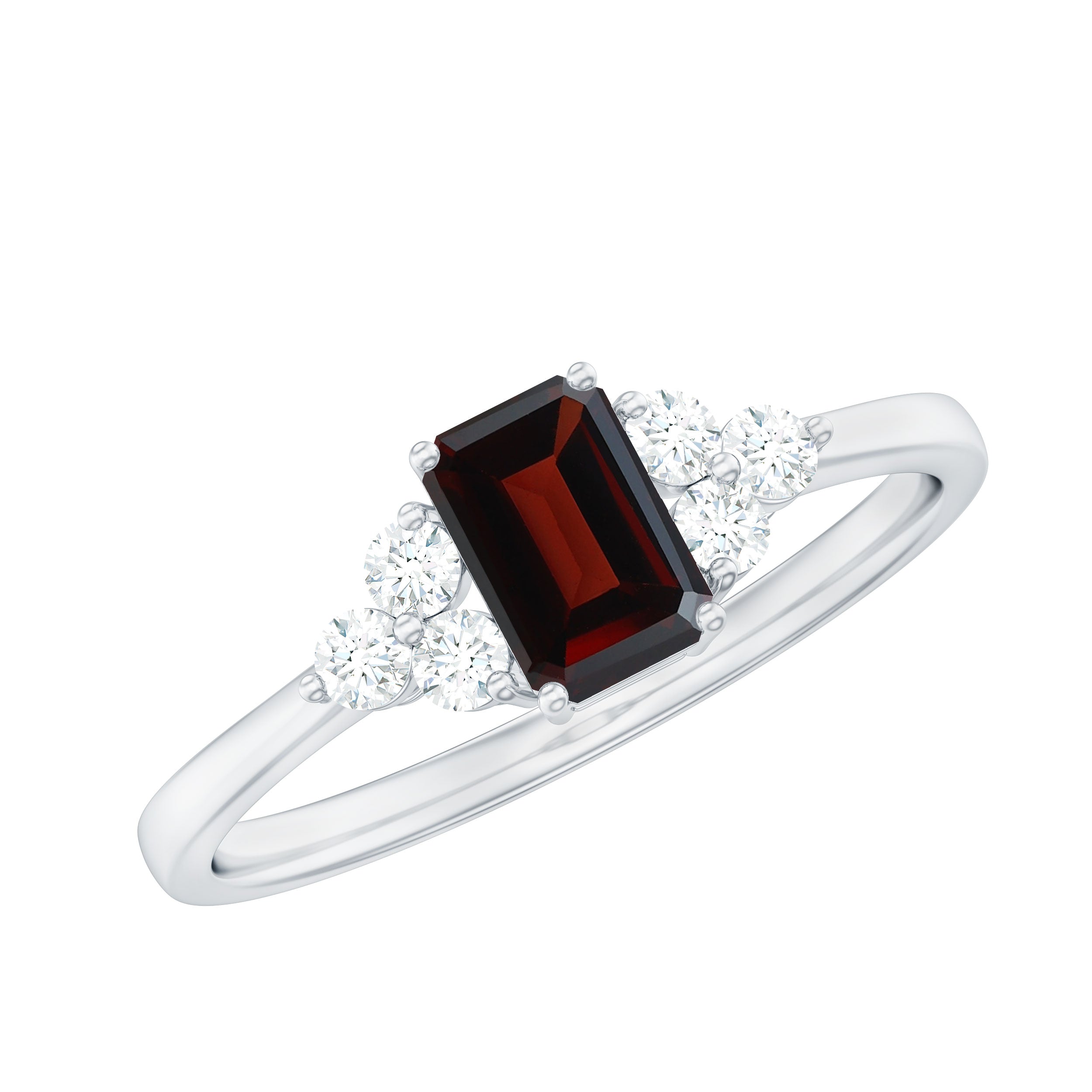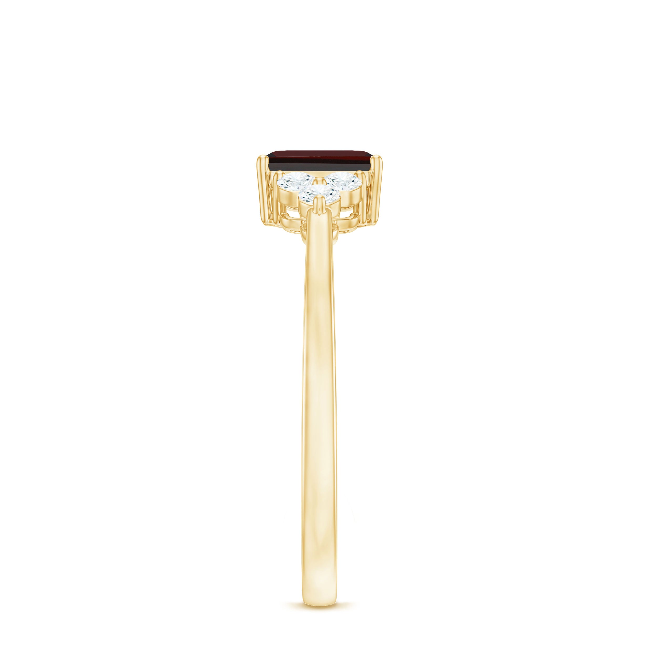 The Garnet Solitaire Ring features an Octagon Cut Garnet as Solitaire embellished in Prong Setting with Round Shape Diamond gemstones as Trio embellished in Prong Setting, especially for you.