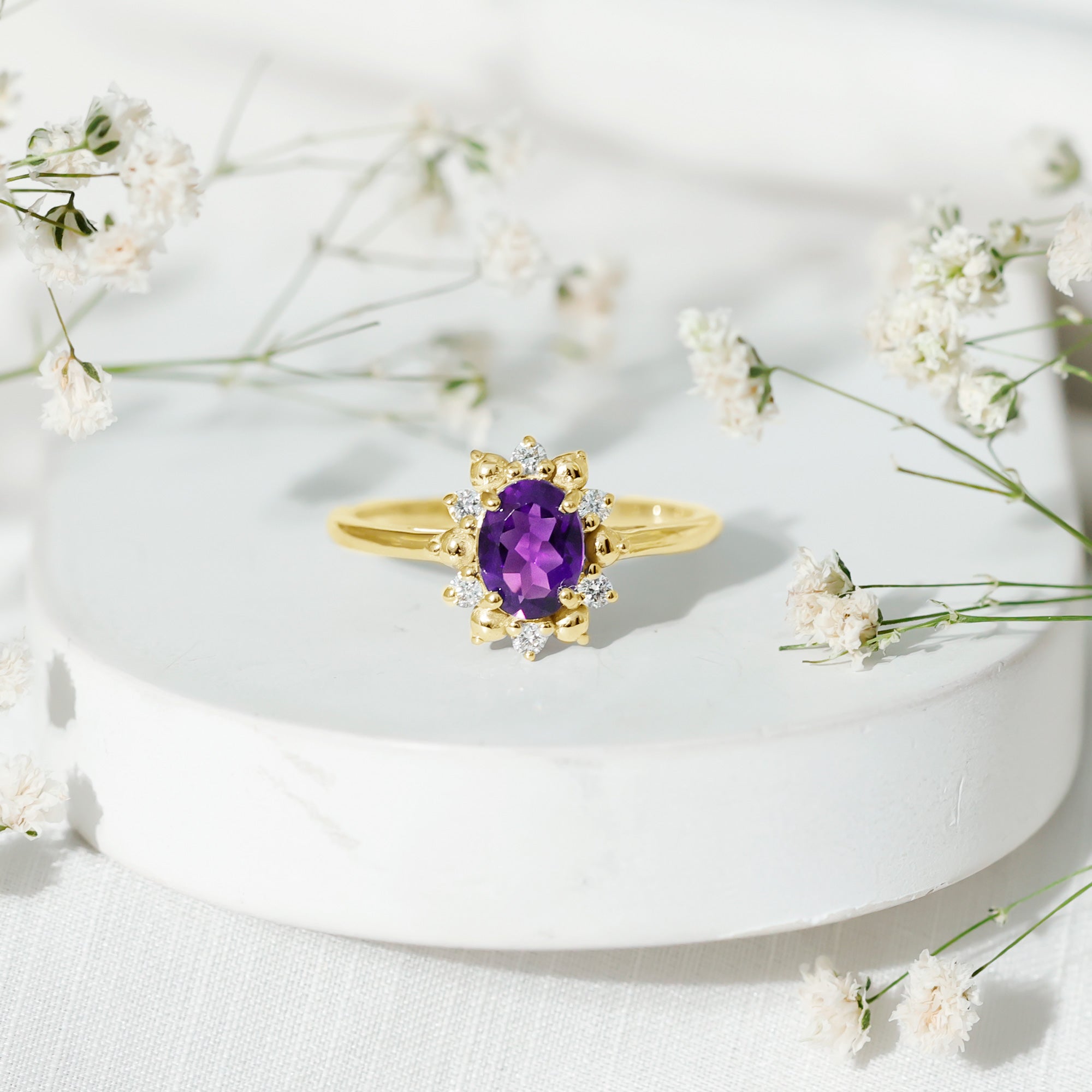 Oval Amethyst Floral Halo Engagement Ring with Diamond