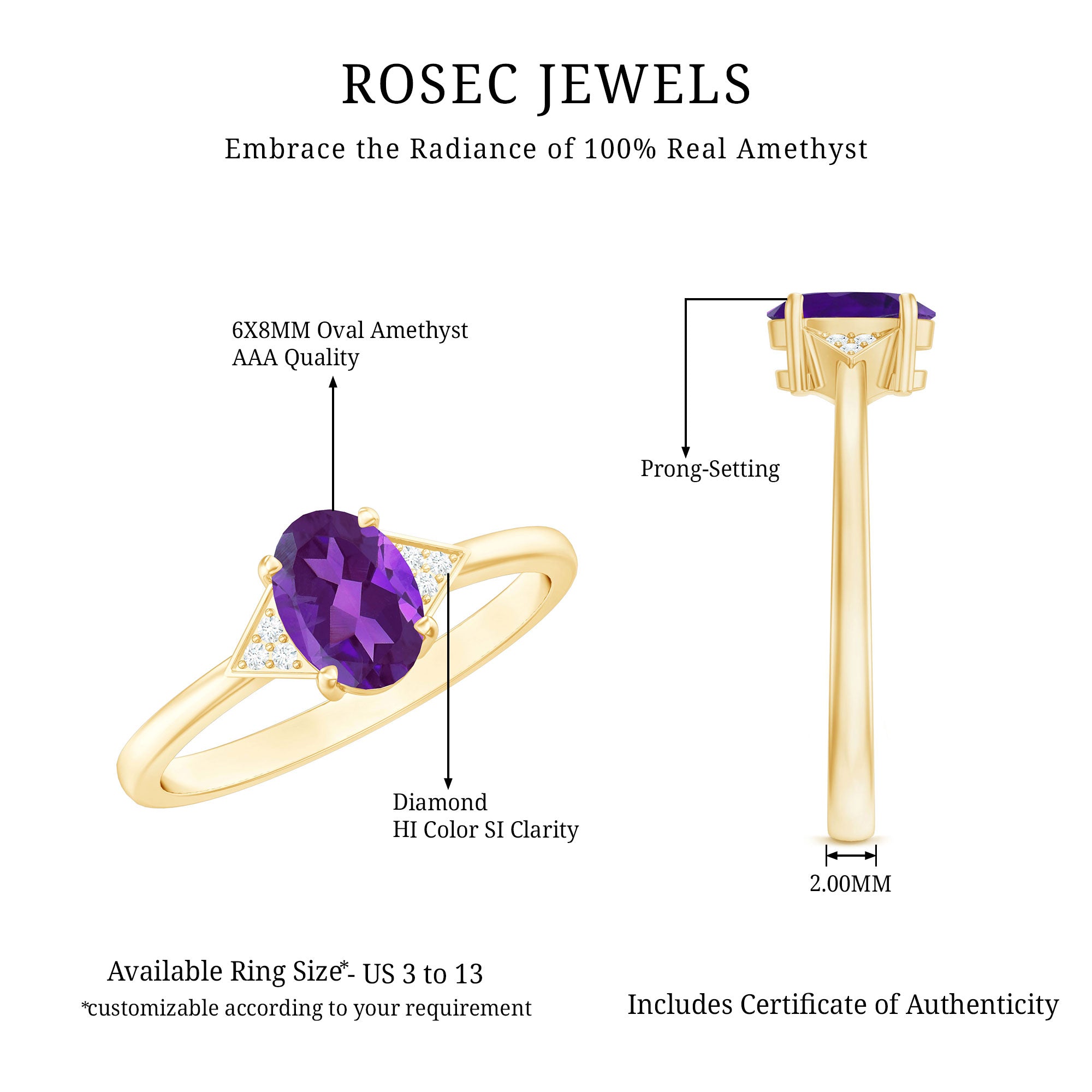 Indulge in your individuality with the elegant Amethyst Engagement Ring, crafted to be as distinctive as you are. With its 6X8 MM Oval Cut Amethyst in a secure Prong Setting, accompanied by a Round Diamond on a Solitaire Ring, this piece is the perfect addition to your everyday wardrobe. The Vintage Solitaire Amethyst Ring offers a timeless design with contemporary elements. This stunning ring boasts a total weight of 1.25 Carat with AAA Quality, and all of our gemstones undergo rigorous certification and quality checks.