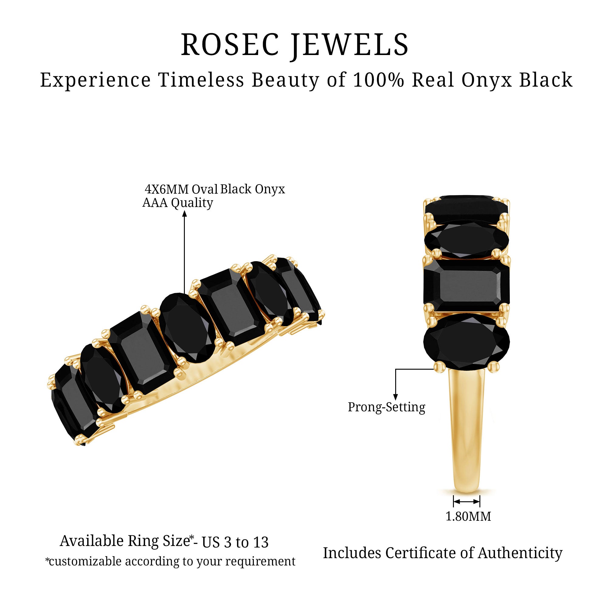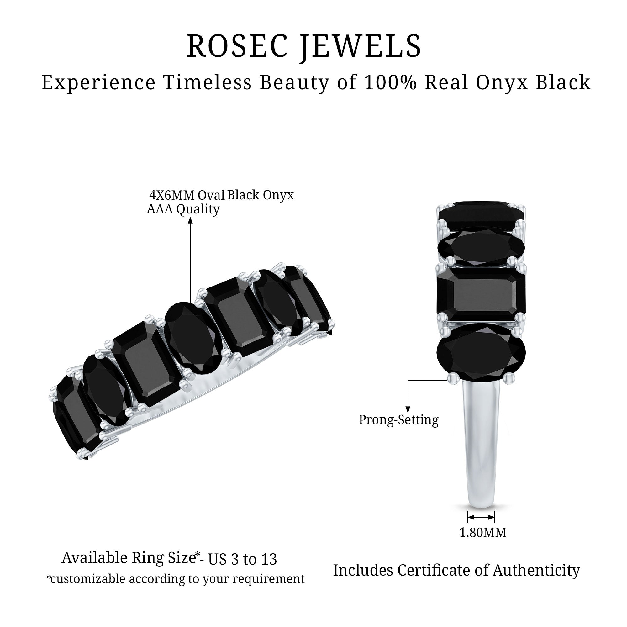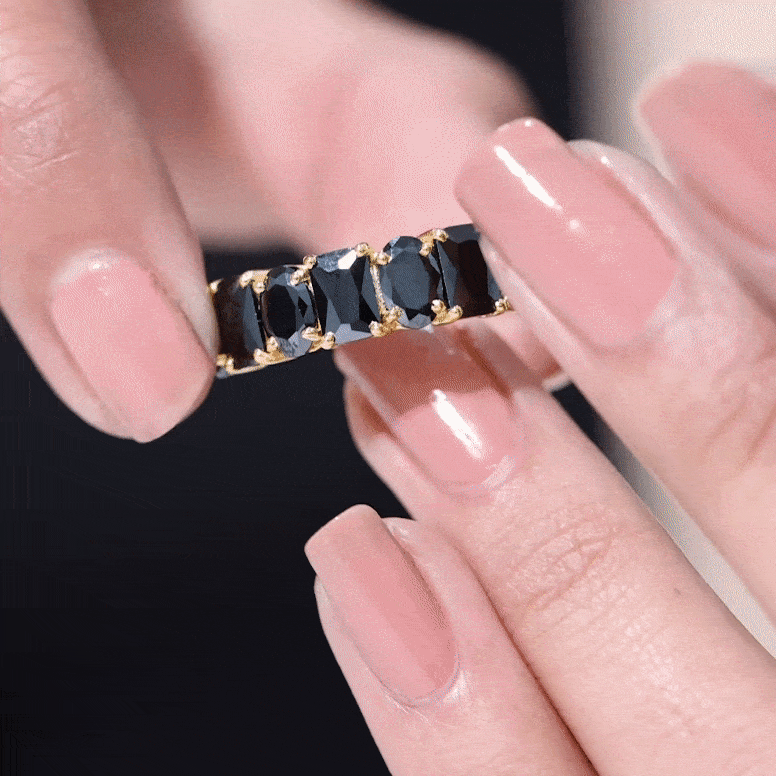 Designed to stand out with quiet strength and beauty, this Black Onyx Eternity Ring pairs elegance with deeper meaning. Featuring alternating 4X6 MM oval and emerald cut black onyx stones, each gem is carefully secured in prong setting, creating a graceful rhythm across half of the band. The unique combination of cuts brings movement to the design, while the deep black onyx adds mystery and charm. Known for its protective qualities, black onyx is believed to absorb negative energy and promote inner strength, making this Half Eternity Band not just beautiful, but also meaningful. Whether you are drawn to its striking appearance or the symbolism behind the stones, this Onyx Wedding Band brings something special to your everyday style. It is perfect for stacking or wearing solo, offering a look that is both timeless and modern. Thoughtfully crafted for comfort and durability, it makes a wonderful gift for someone who appreciates distinctive jewelry with intention. Available in multiple sizes and metal finishes, it is easy to choose one to fits your personal taste. From casual outings to special occasions, this Wedding Anniversary Ring brings a quiet elegance that lasts.