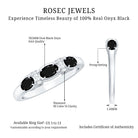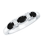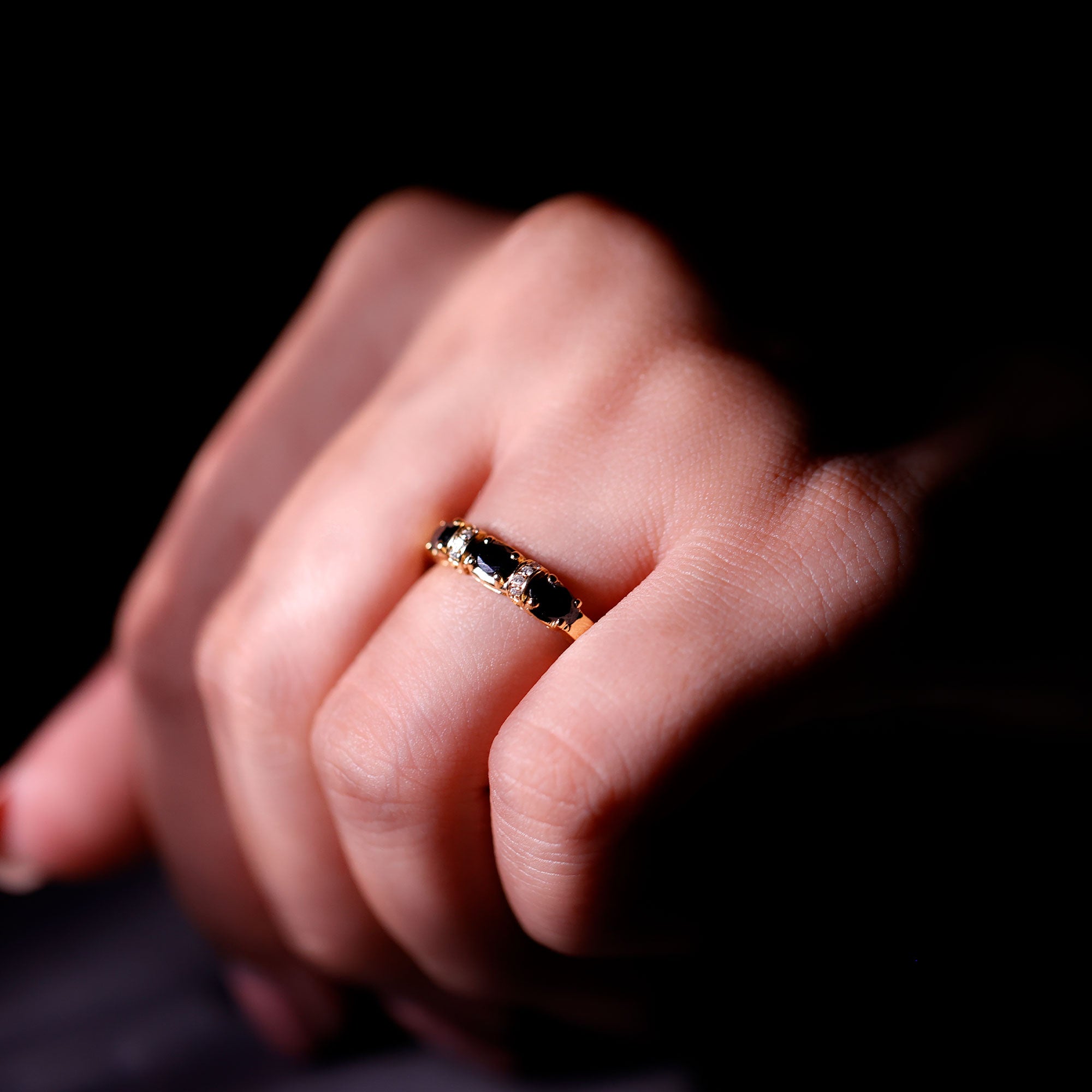 Sleek, stylish, and full of meaning, this Black Onyx and Diamond Ring is the perfect way to celebrate love, milestones, or simply your one-of-a-kind style. Designed with a modern twist, it blends timeless elegance with designer vibes. The Three Stone Anniversary Ring features three oval shaped black onyx gemstones that represent your past, present, and future, each measuring 3X5 MM and placed in a striking east west style. Their deep color gives off a bold yet balanced vibe, while the AAA quality of the onyx ensures they shine with depth and clarity. Between each onyx, you will find round cut diamonds, set in simple rows for a beautiful contrast of dark and light. These HI-SI quality diamonds add just the right amount of sparkle, making the design feel full of personality. The prong setting keeps the stones secure while letting them shine from every angle. With its detailed layout, this Past Present and Future Ring is a standout, whether worn as an anniversary band, a meaningful gift, or a signature piece you rock every day. The unisex design makes it versatile for all styles and all occasions. Bold enough to wear solo, yet subtle enough to stack, this Black Onyx Band is a piece that easily becomes part of your everyday story. Modern, meaningful, and made to last, just like the bond it represents.