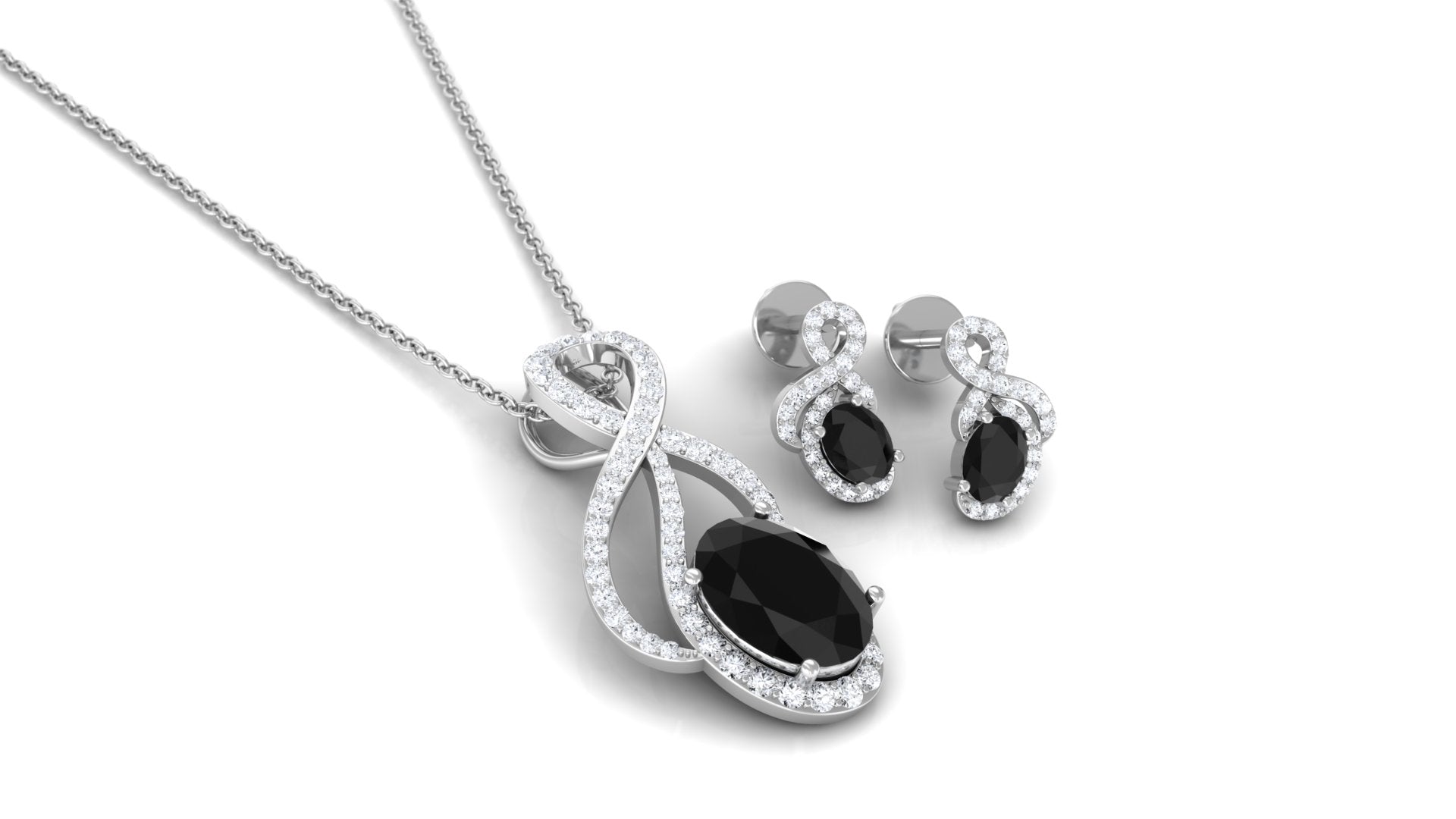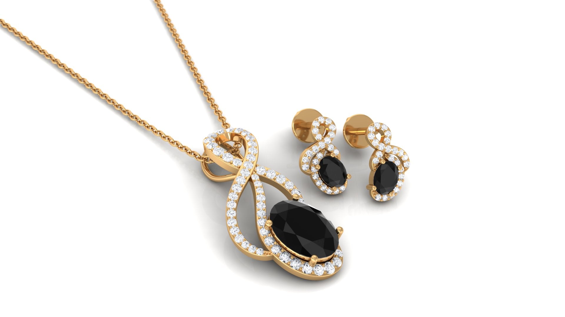 Add a touch of grace to your ensemble with this Black Onyx Jewelry Set, which comes with a delicate necklace and a pair of stud earrings. The oval-shaped black onyx along with diamond exhibits an elegant and flawless look. The infinity design further makes this jewelry set a must-have for any woman. Wear this with your formal attires, evening gowns or casual fits and make a lasting impression on everyone. Crafted with Natural and Certified Gemstones ensures excellent quality.