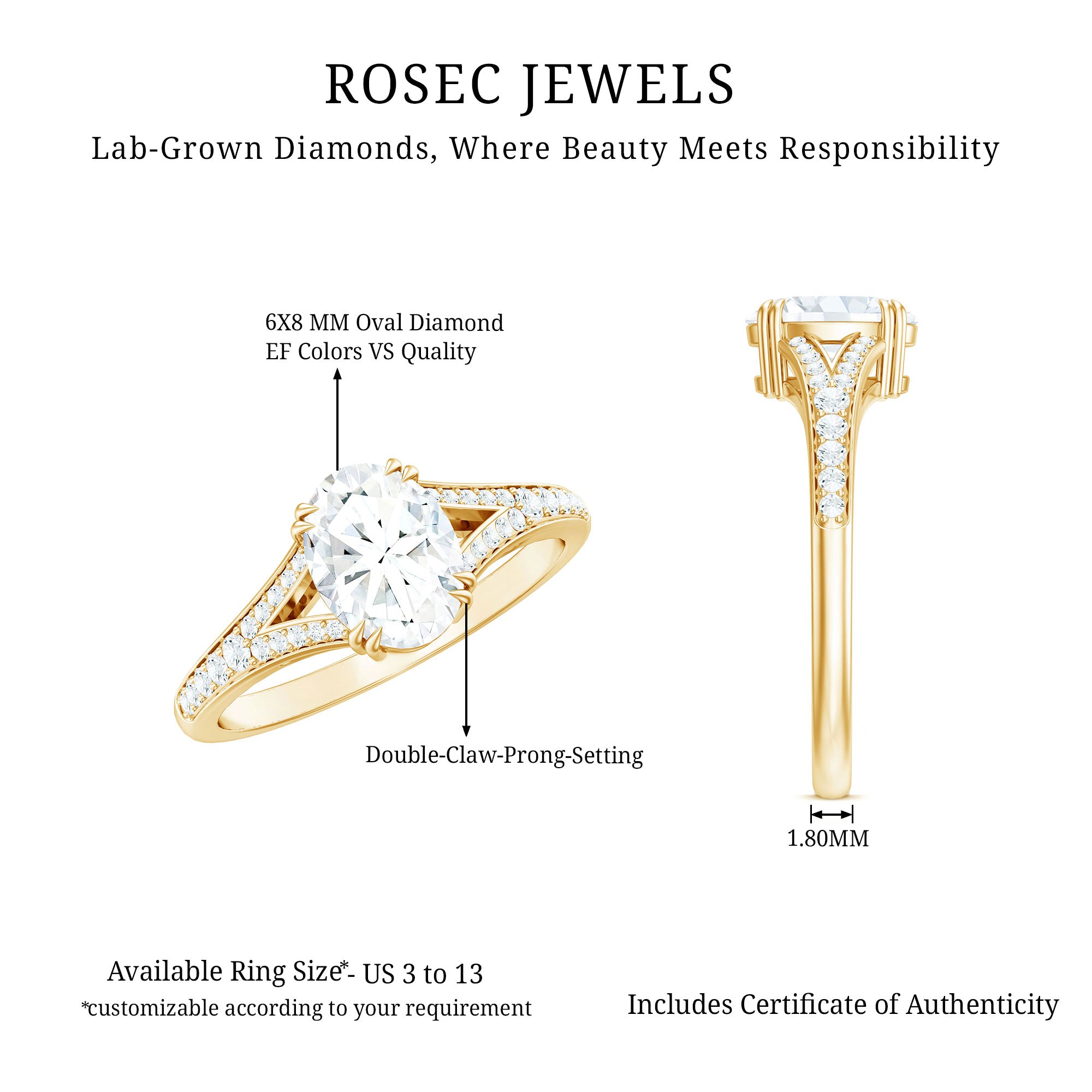 Capture her heart with the exquisite details of this Lab Grown Diamond Engagement Ring. The centerpiece showcases a dazzling 6X8 MM Oval Cut Lab Grown Diamond, elegantly set in Double Claw Setting, while the smaller diamond accents adorn the split shank, giving this Solitaire Ring a contemporary and striking appearance, adding just the right amount of sparkle. This 1 Carat Diamond Ring represents shared experiences, treasured memories, and aspirations for a future together. We craft this Oval Engagement Ring using EF-VS quality Lab Grown Diamonds, making it budget-friendly and environmentally conscious without sacrificing quality and clarity. From the first look to lifelong commitments, this Oval Diamond Ring encourages you to shine brighter and love more passionately. Your purchase also comes with a certificate of guarantee for quality assurance and is beautifully packaged in a stylish, protective box, perfect for gifting or safe storage when not in use. Present her this Split Shank Engagement Ring that is bound to draw attention. Let your journey commence with a brilliance that will be cherished forever.