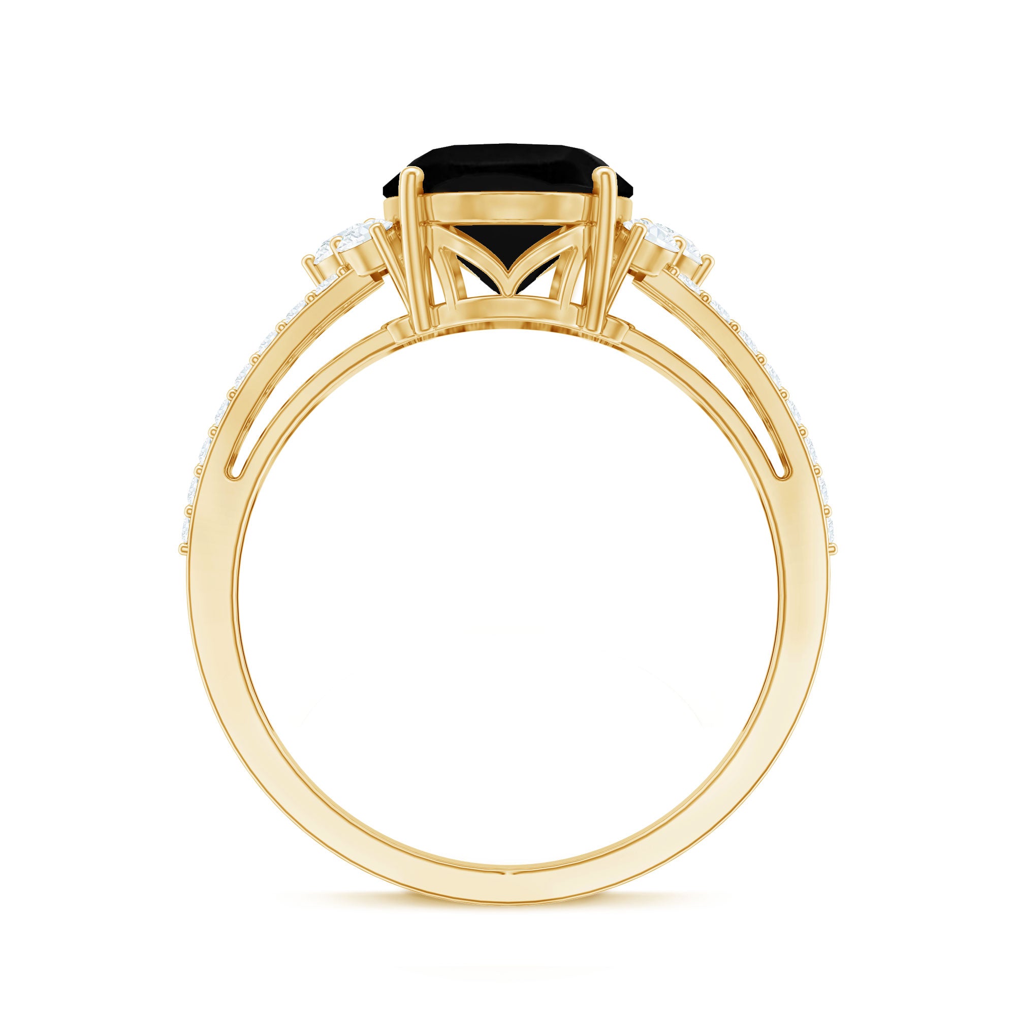 Make your ladylove feel like a star with this breathtaking Split Shank Engagement Ring. The centerpiece of this ring showcases a dazzling Oval Shape Created Black Diamond, surrounded by radiant Diamond stones on each side. The captivating Split Shank design is adorned with shimmering Diamond Gemstones, enhancing brilliance and allure. This ring is a true masterpiece, designed to make a statement and capture attention. Let the mesmerizing beauty of the Created Black Diamond and the sparkling Diamond gems symbolize your eternal love and create a magical moment that she will cherish forever.