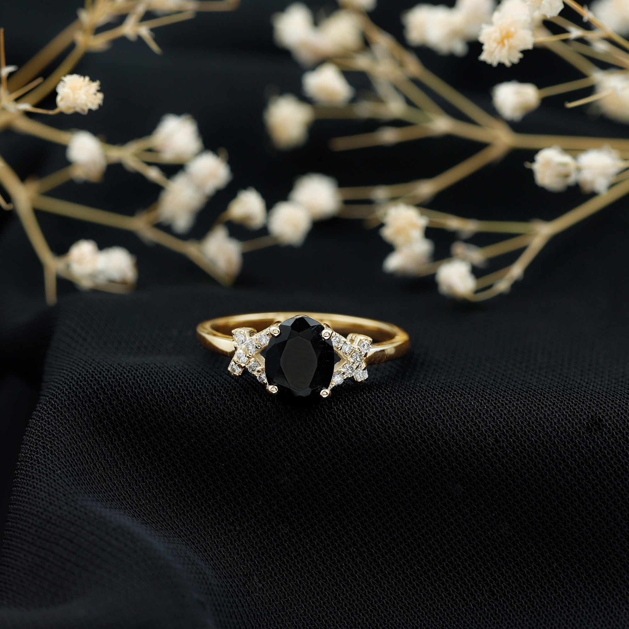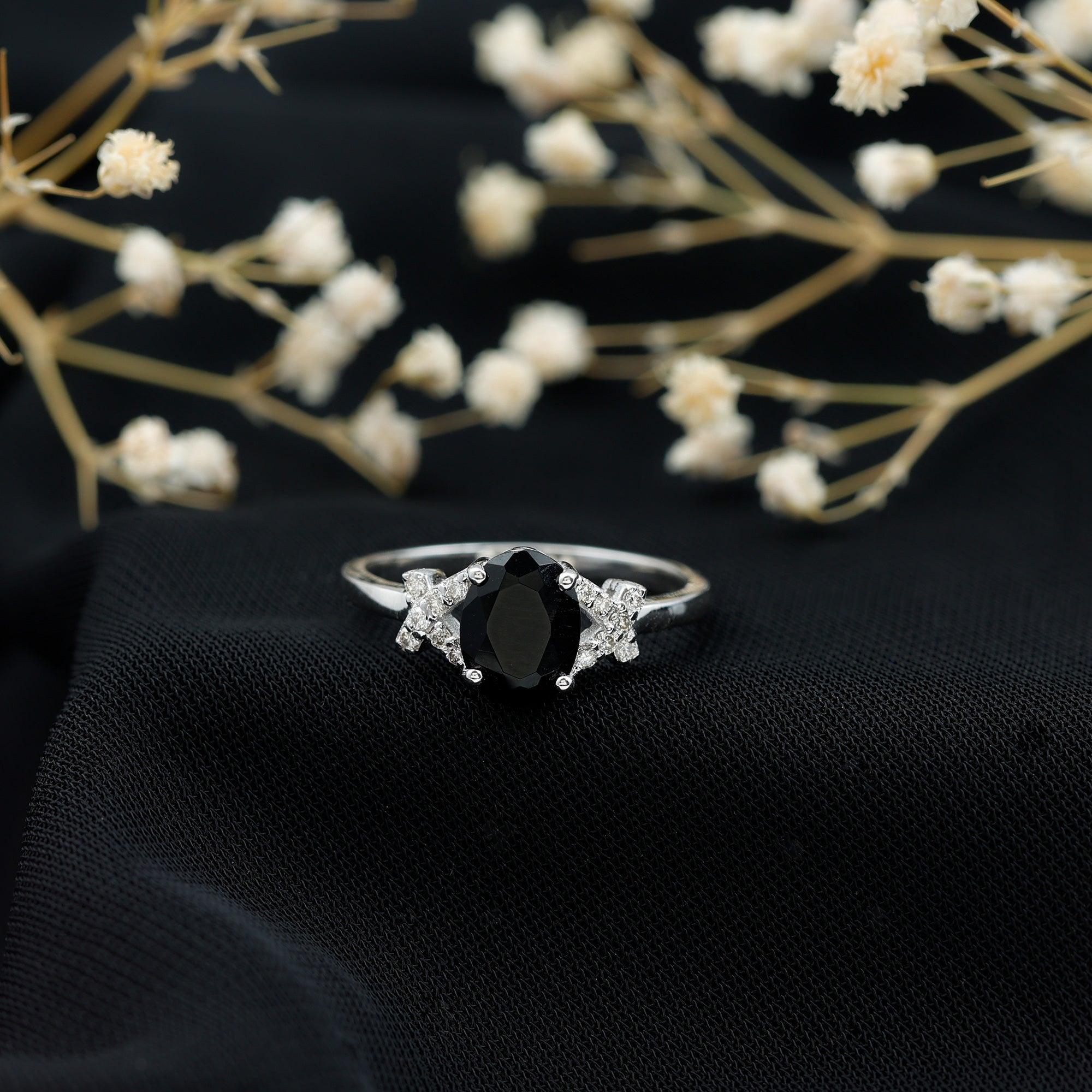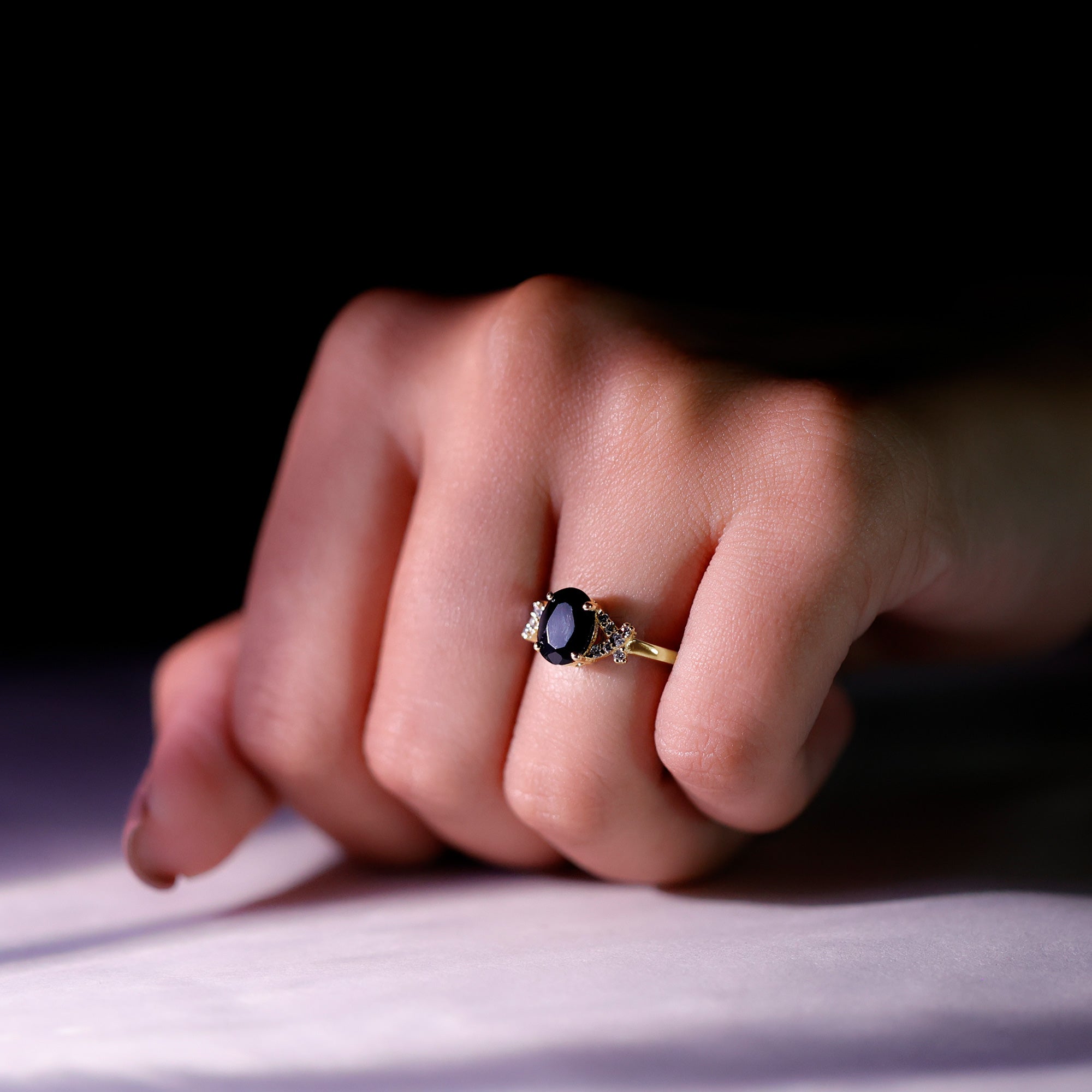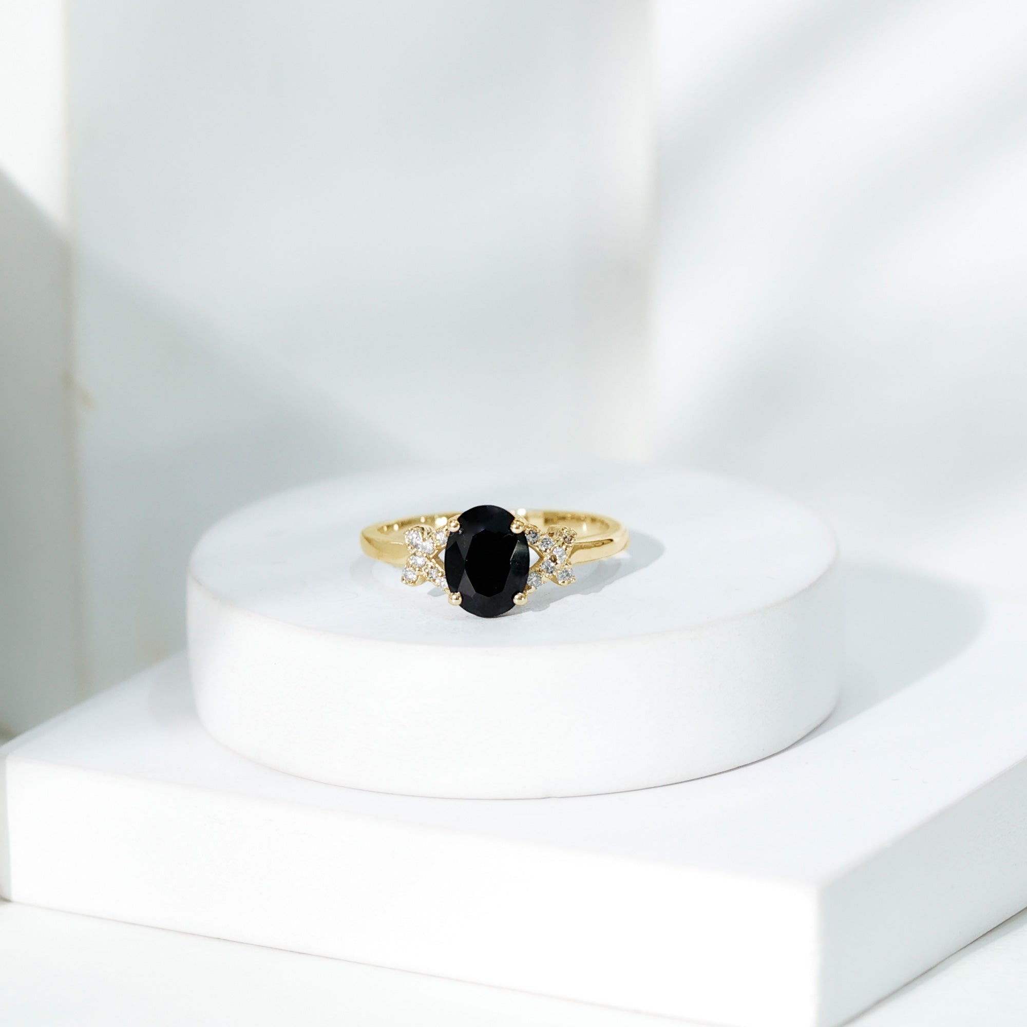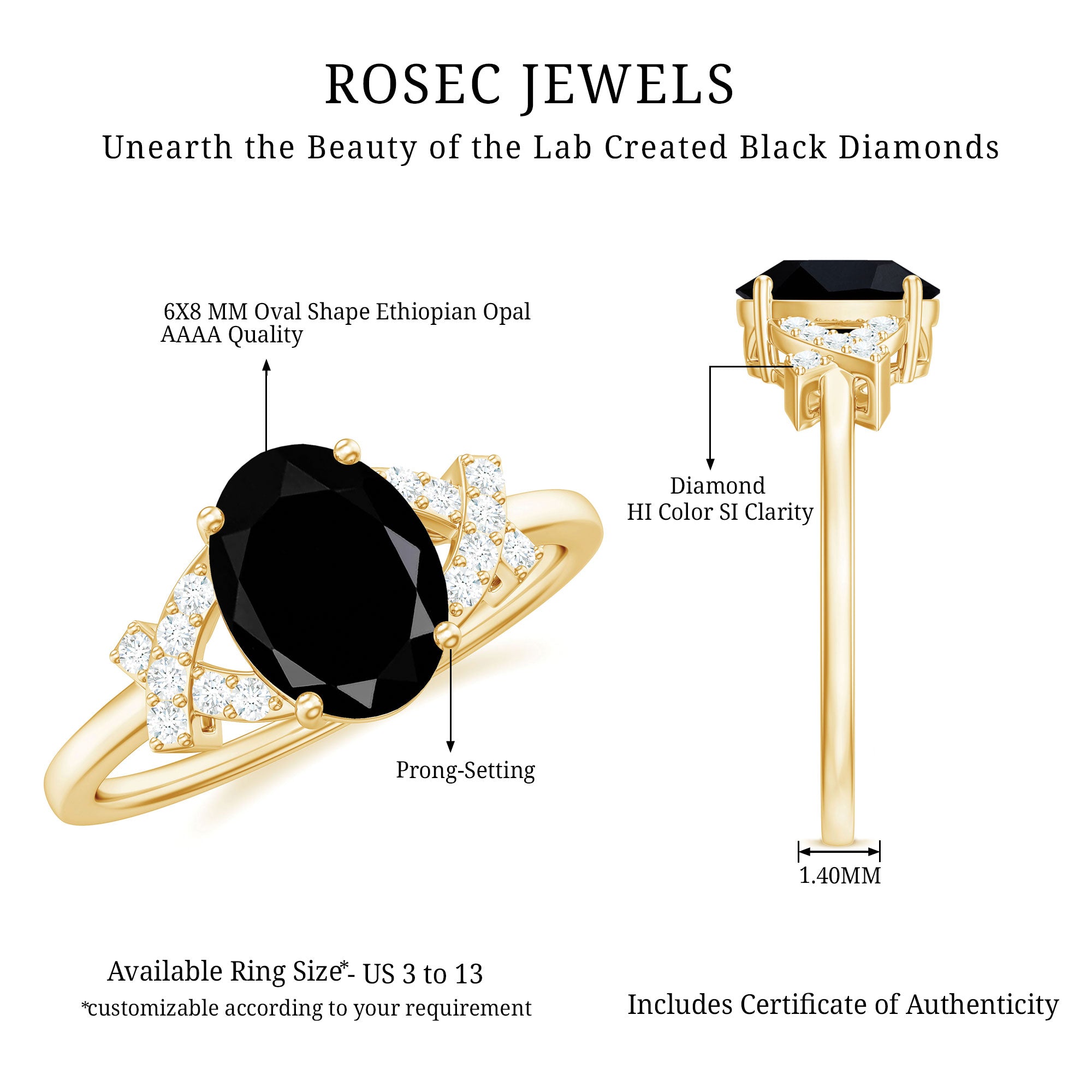 Propose with this stunning Created Black Diamond Ring and be ready for a flood of compliments. The 6X8 MM oval cut created Black Diamond in a prong setting, paired with round Diamond accent on the solitaire engagement ring, symbolizes your commitment for a lifetime. This unique solitaire ring will steal her heart. The ring has a total weight of 2 carats and boasts a AAAA quality, ensuring the highest quality. All of our gemstones are certified and undergo rigorous quality checks.