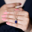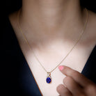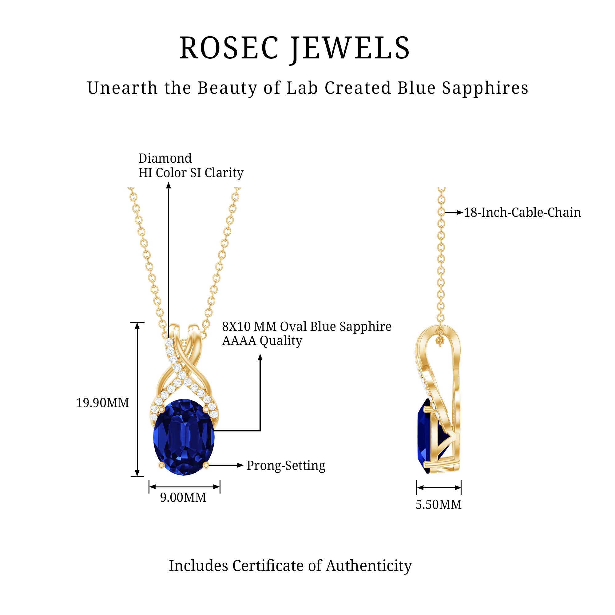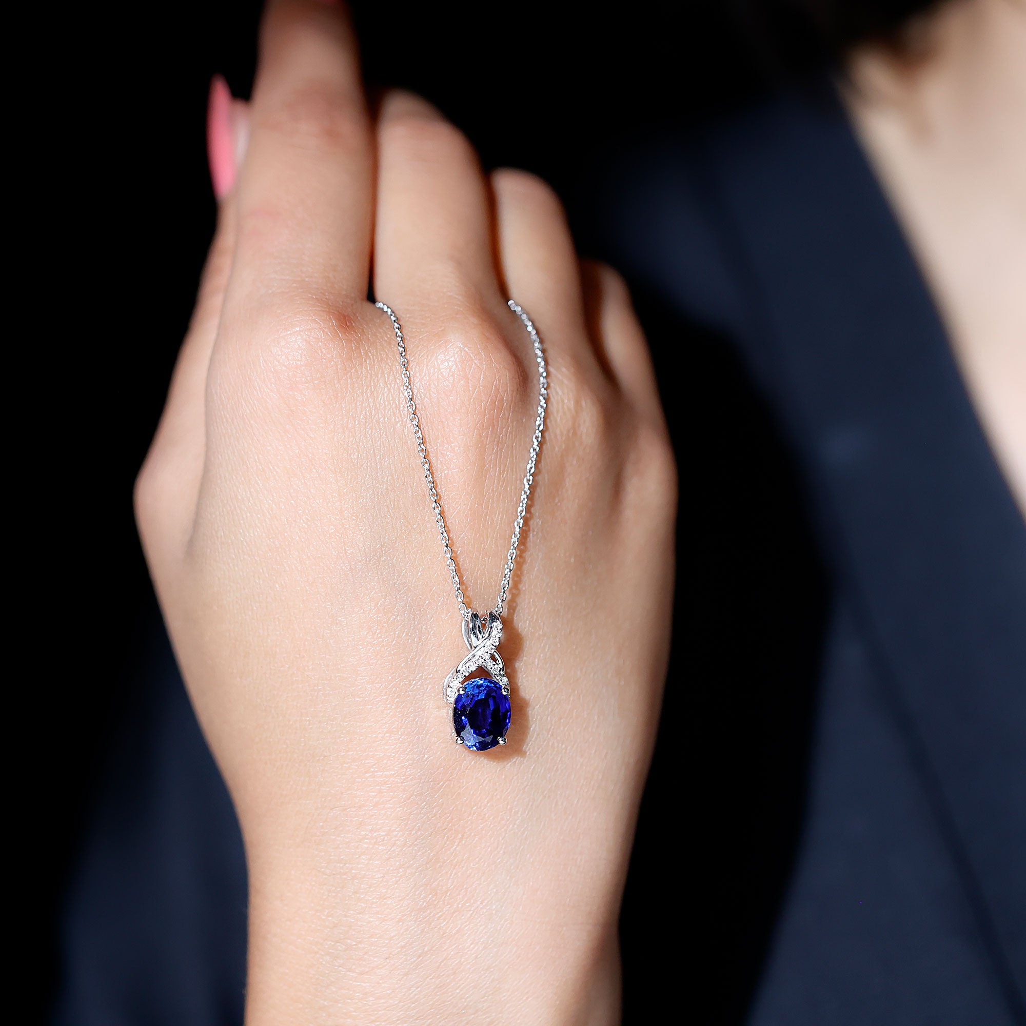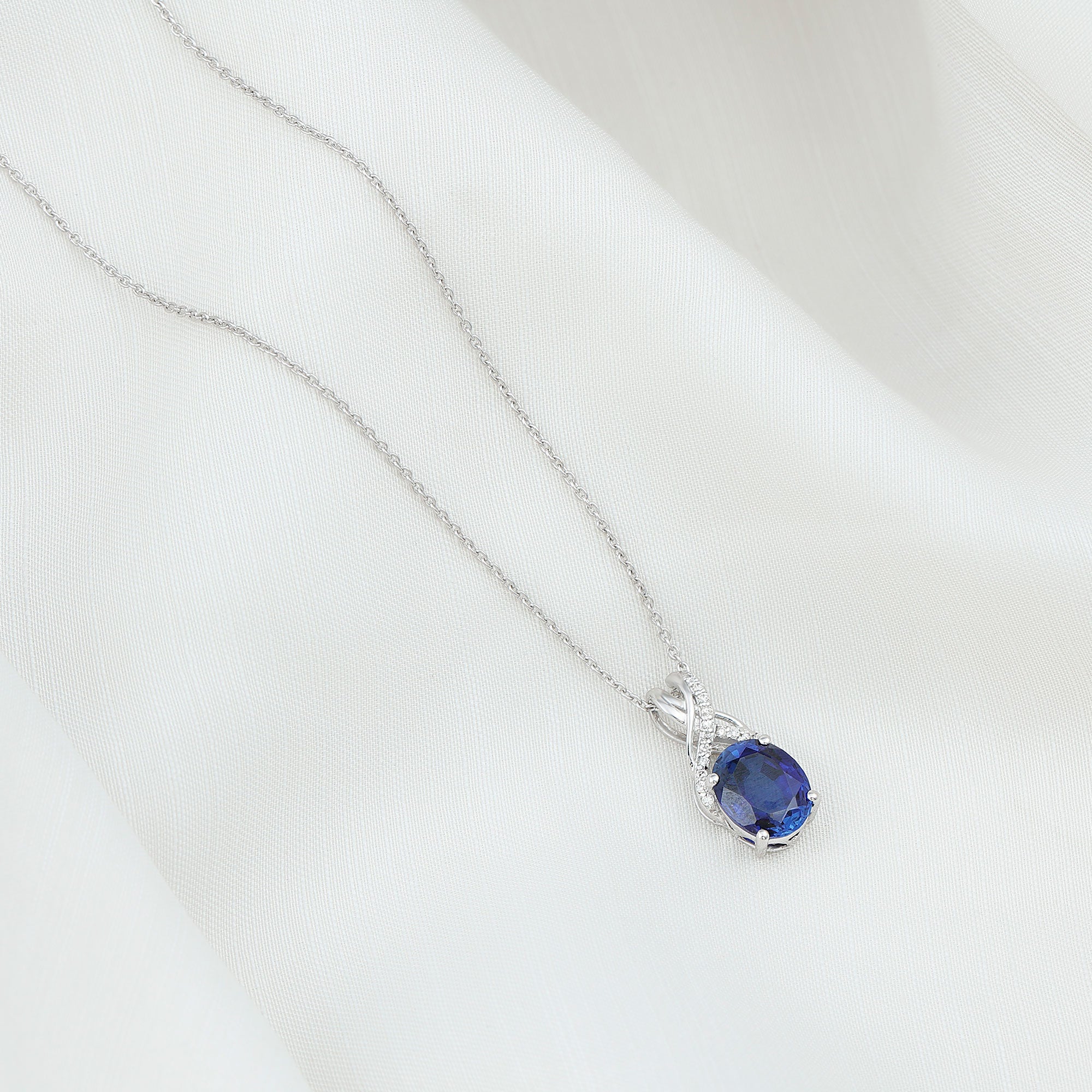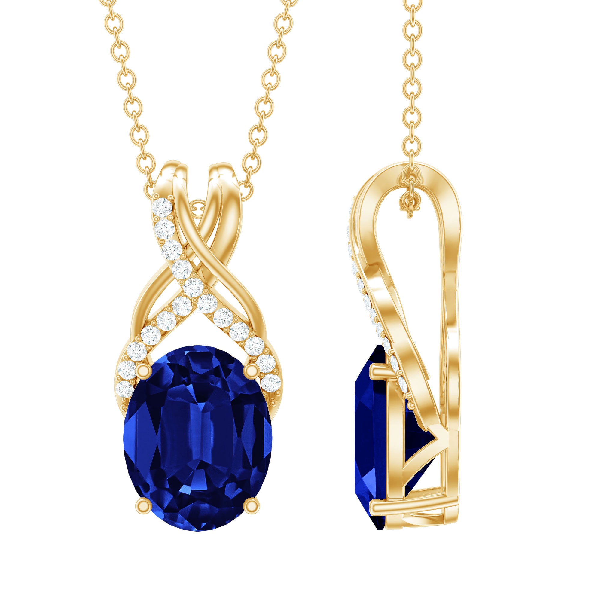 Introducing a one-of-a-kind Created Blue Sapphire Pendant Necklace that is both delicate and charming. The 8X10 MM Oval-Cut Created Blue Sapphire takes center stage in a 4 Prong Setting, with a Twisted Bail adorned with Diamond on a Solitaire Pendant. This Designer Pendant is so beautiful that its likely to become a staple in your collection, one youll never want to take off.